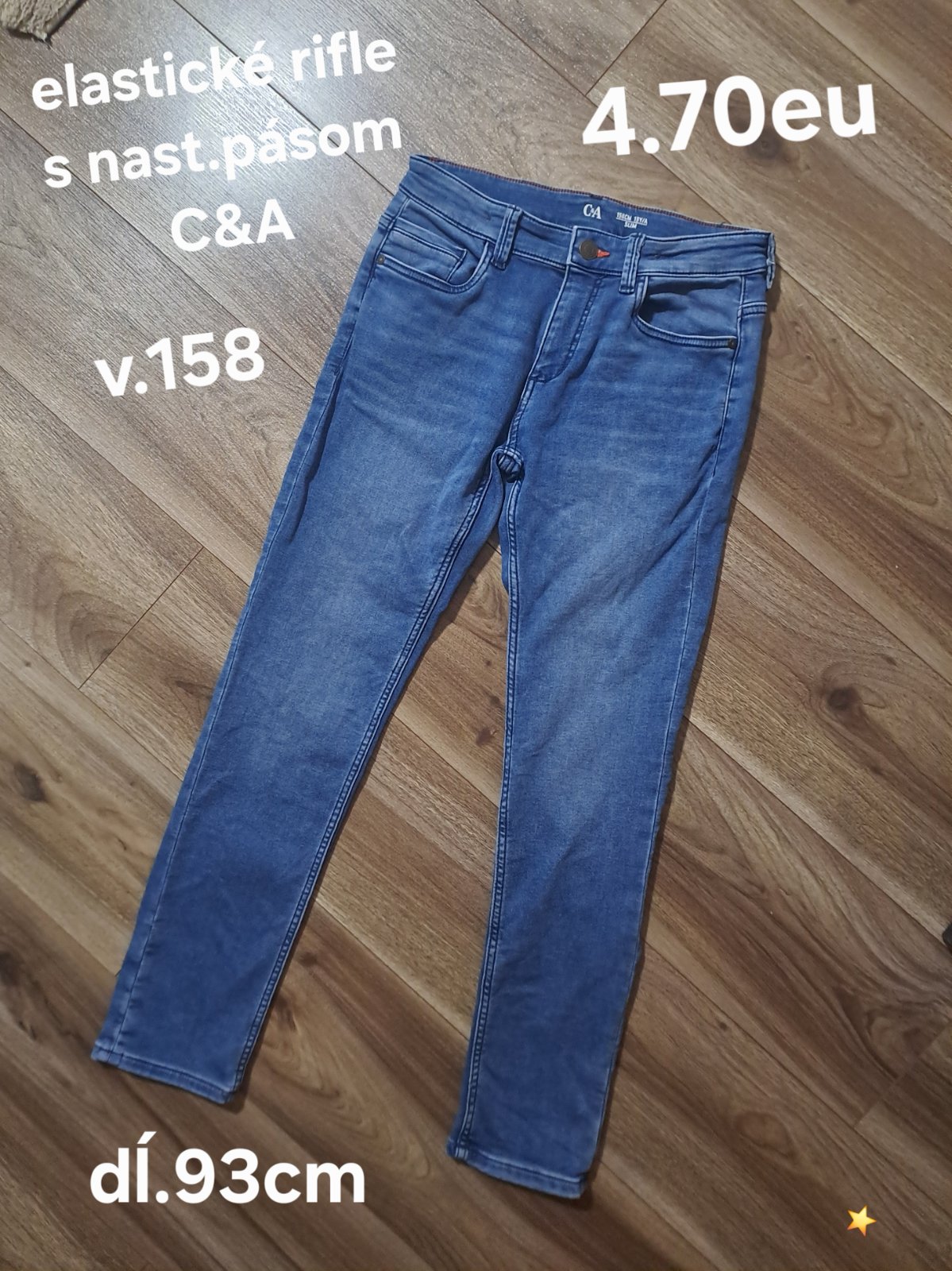 Rifle klasického rovného strihu, trochu elastické. V páse je gumička na reguláciu šírky pásu. Čisté sirka pasu je 34 cm. Celkova dĺžka je 94-95 cm.Mozny aj osobny o dber. Cena je bez poštovného.