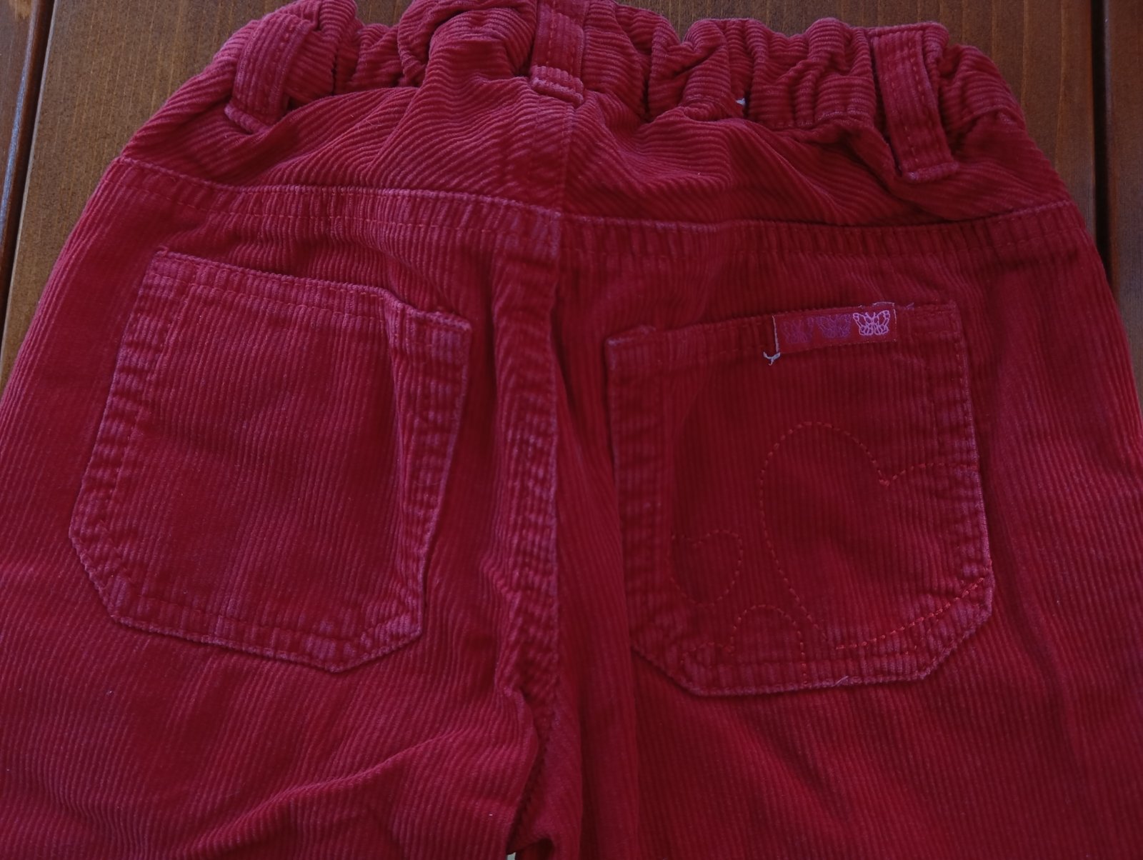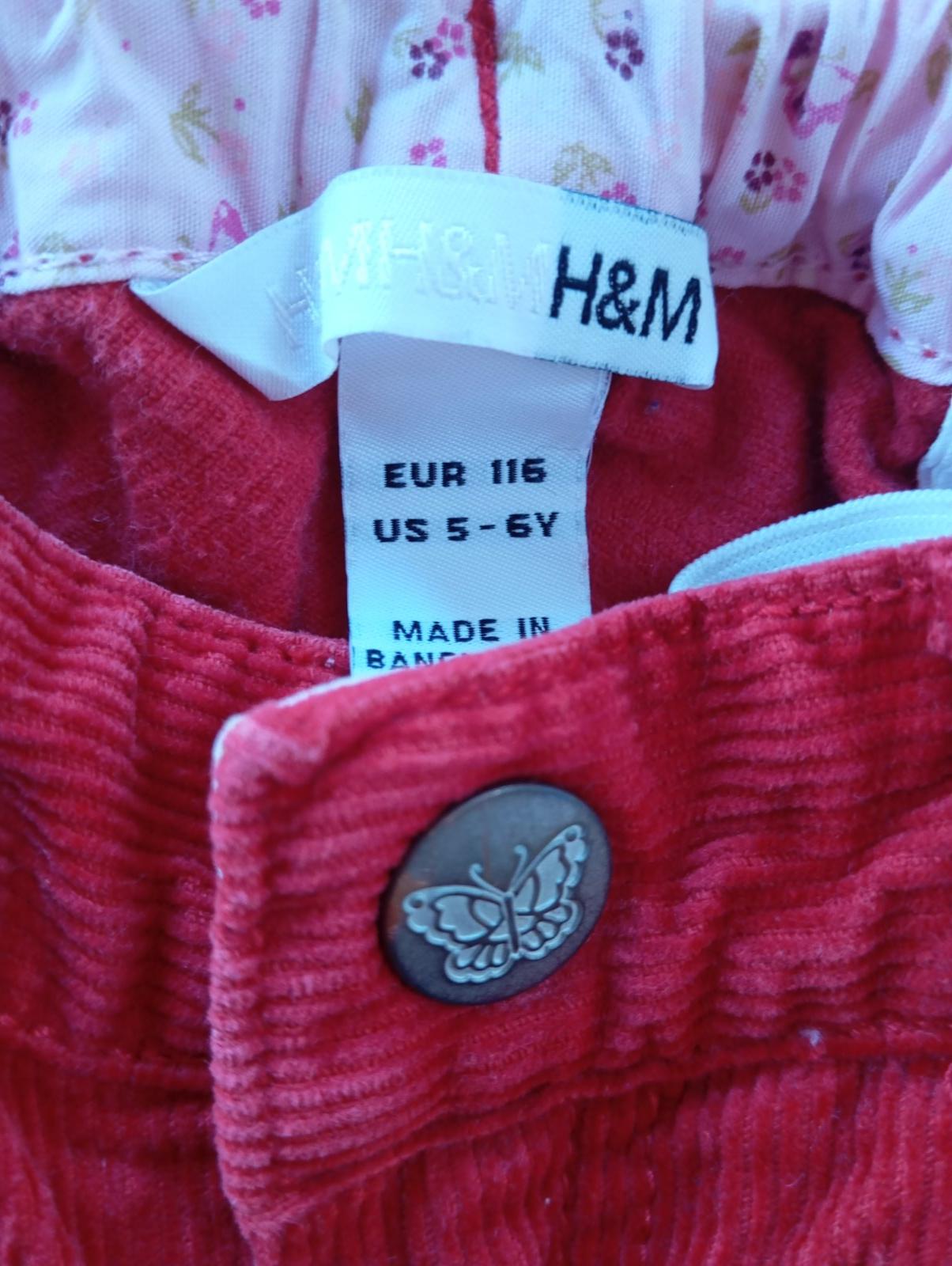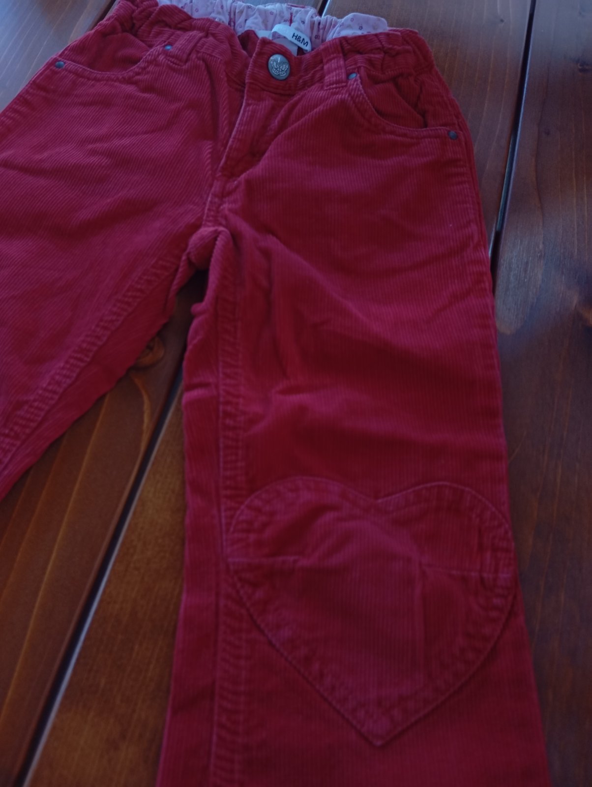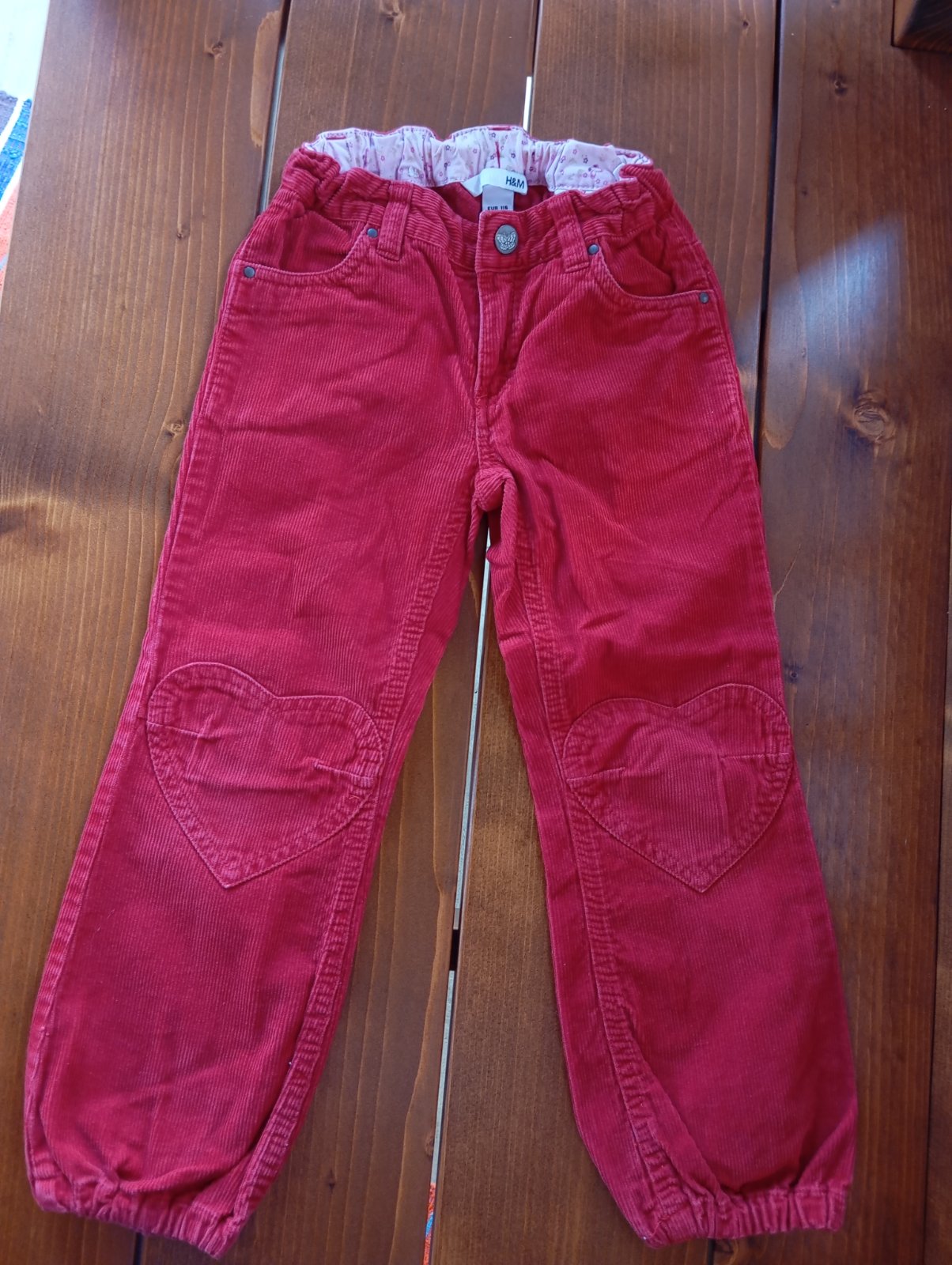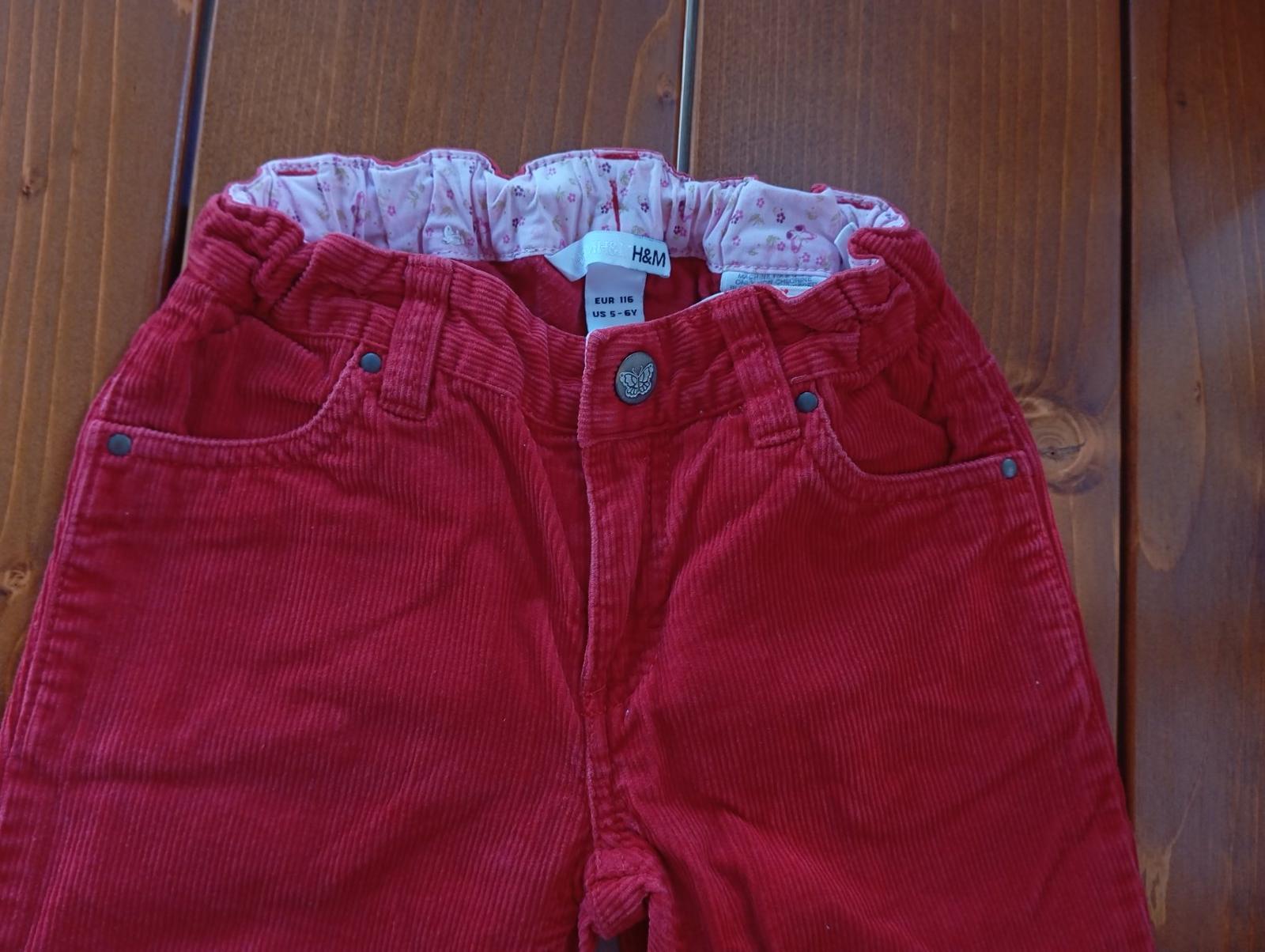 Červené menčestrové nohavice, veľ. 116, zn. H&M. Majú srdiečka na kolenách, pás na gumu- dá sa stiahnuť. Bez poškodení.