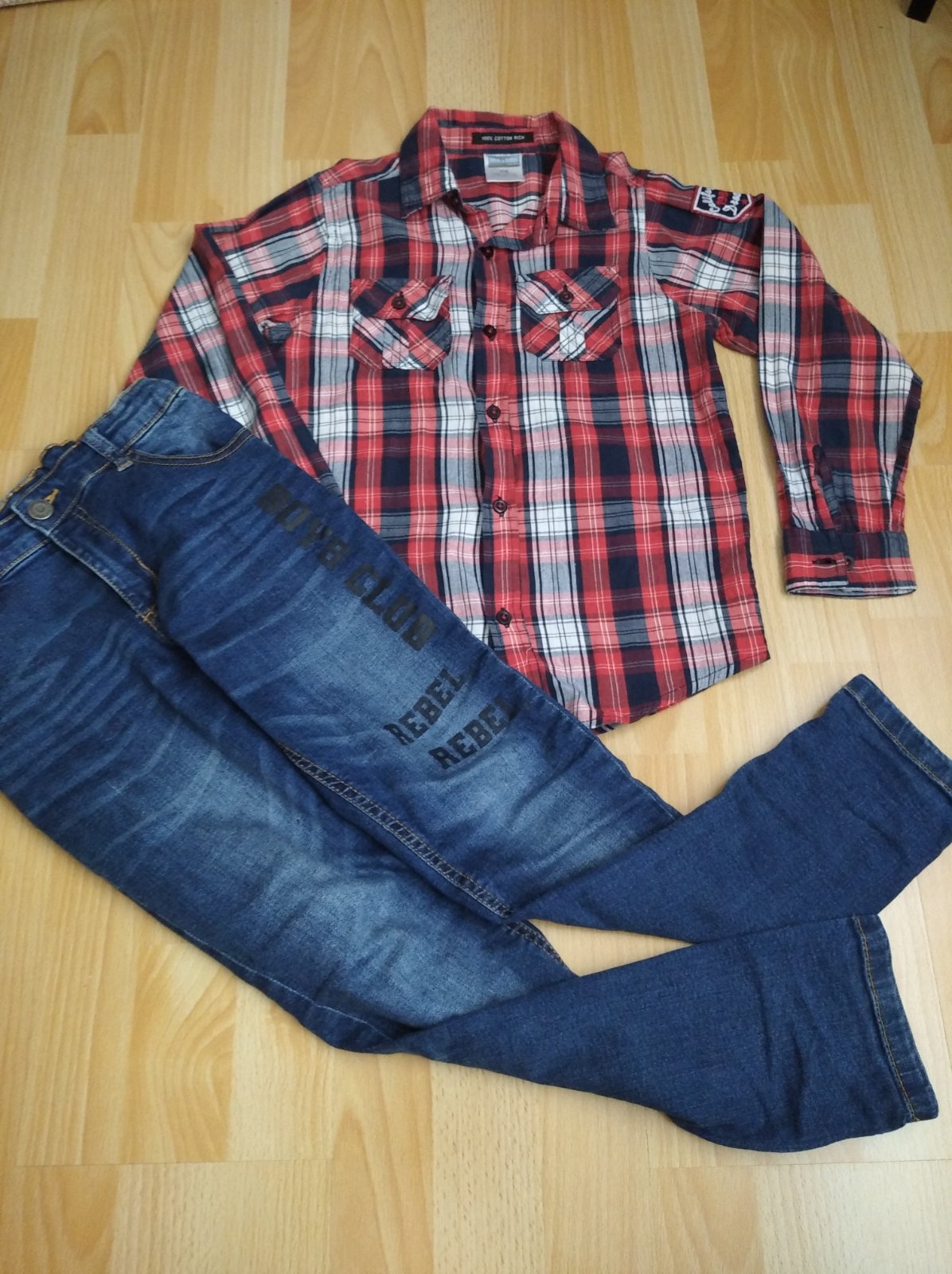 Bez poškodení, vhodné pre chudšieho chlapčeka. Sú mierne elastické. V páse je skryté regulovanie šírky. V ponuke mám aj košeľu z foto rovnakej veľkosti.