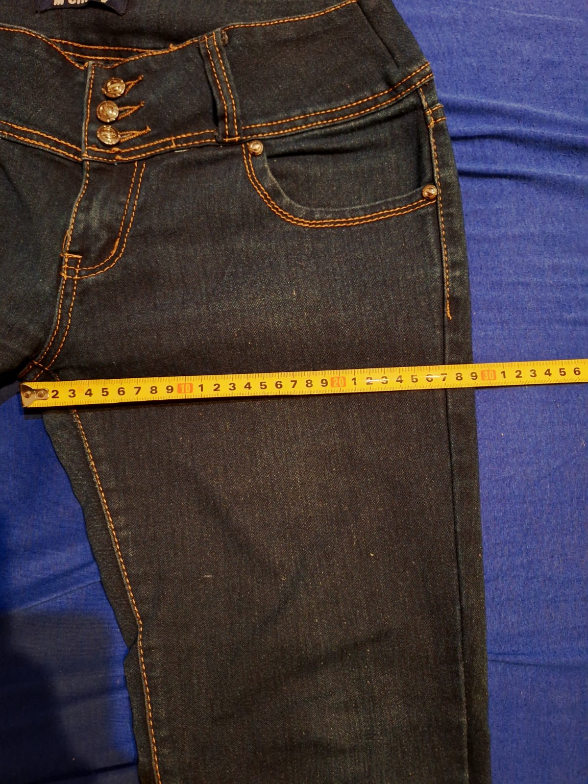 Pružné rifle, veľkosť písaná 32, celková dlžka je 99 cm. Dlžka od rozkroku je 77 cm. Pás nižší, je 2x43 cm, pri natiahnutí 2x48 cm. Cez boky vo výške rozkroku 2x57 cm. Zapínanie na zips +3 gombíky.