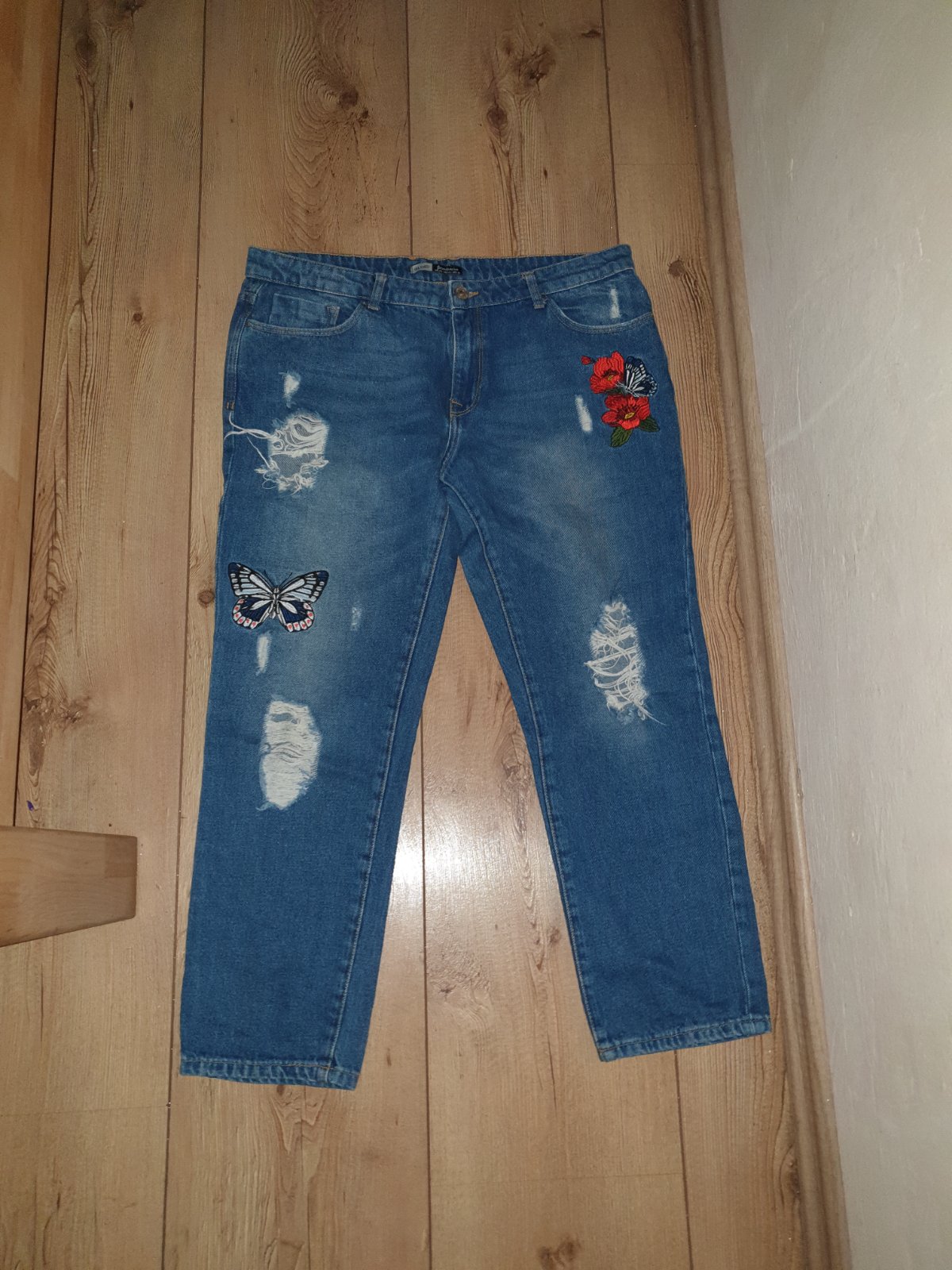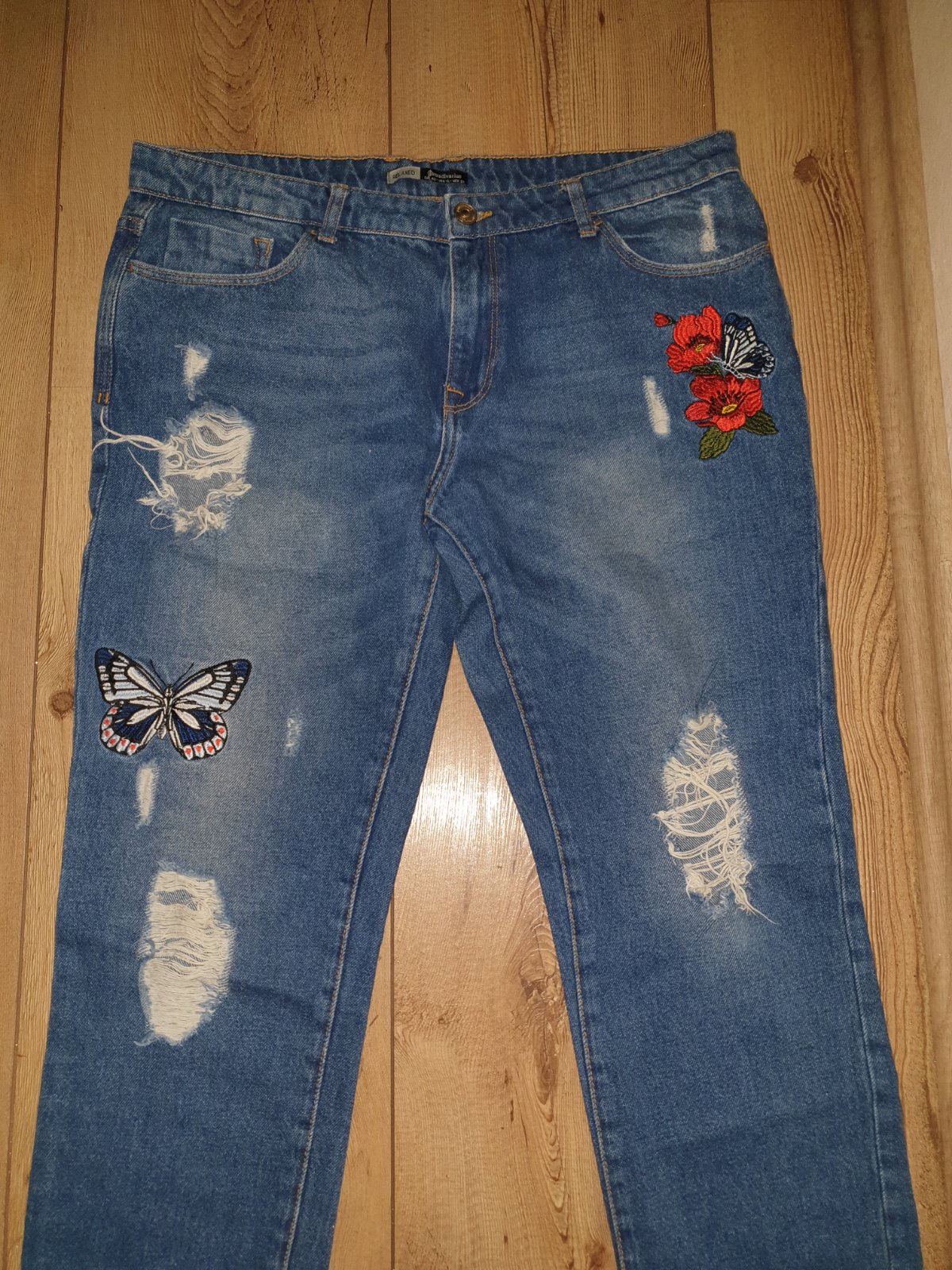 Elastické rifle s kvietkami na spodku a krásnym opaskom, s nižším pásom. Veľkosť je uvedená riflová 32, čo zodpovedá asi XL, premerajte. Dĺžky bočná 103 bez vyhnutého spodného okraja, kroková 84cm...