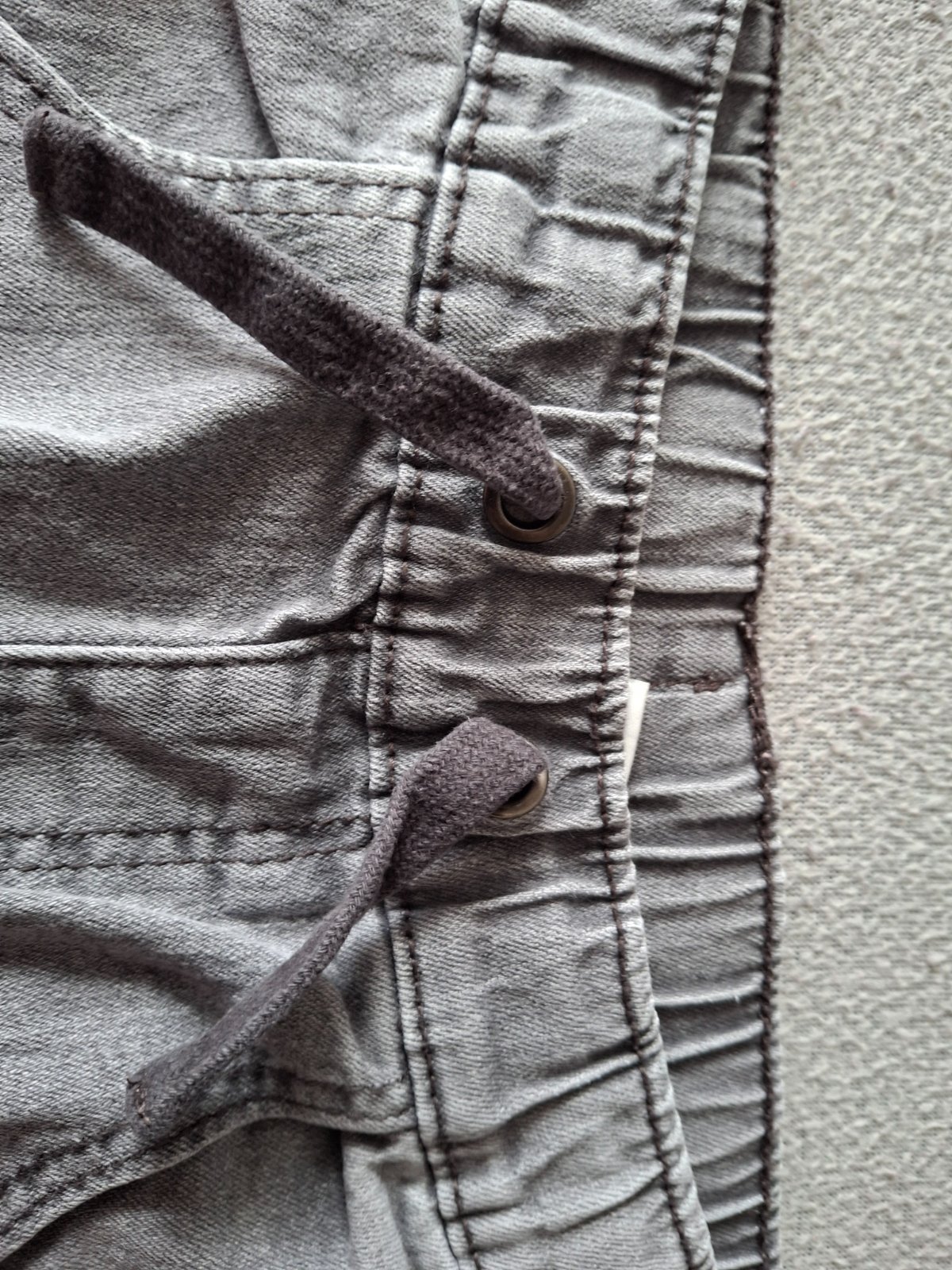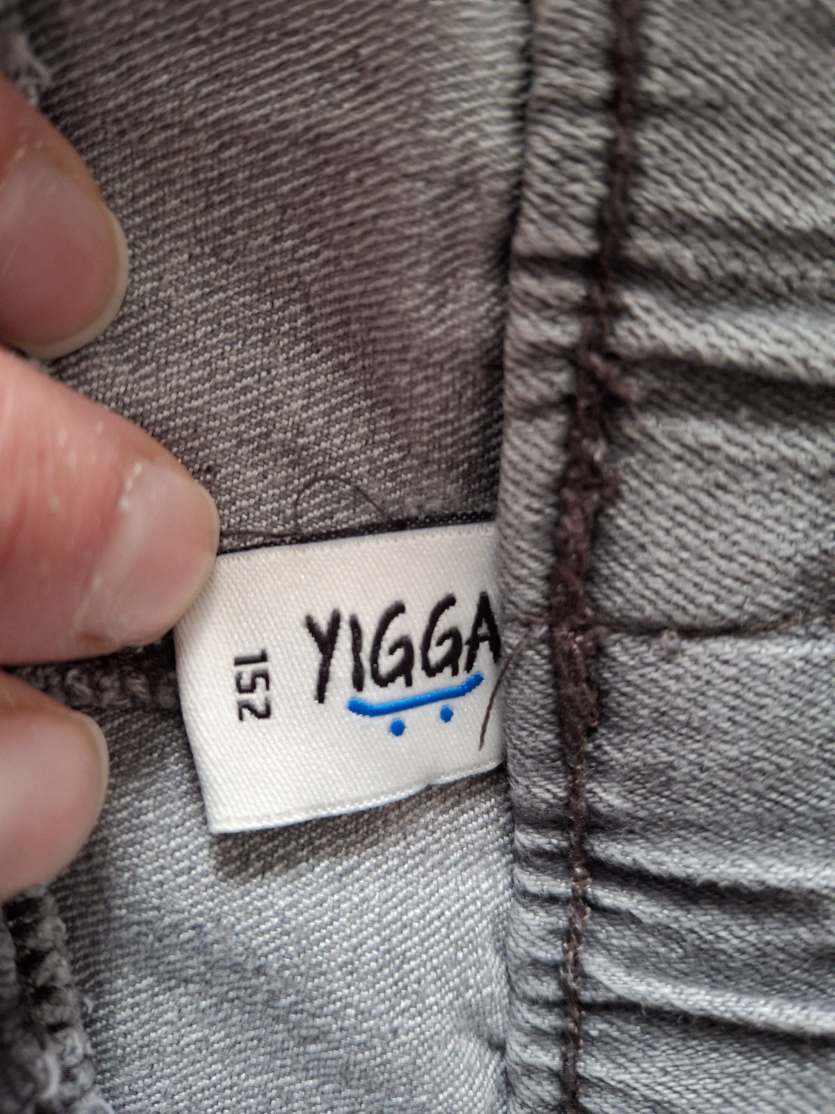 Predám jednú sezónu nosené tmavošede rifle zn. YIGGA, veľkosť 152, na gumičku s viazaním na šnúrku, imitácia skrytého zipsu. Dvakrát vrecká vpredu a vzadu.