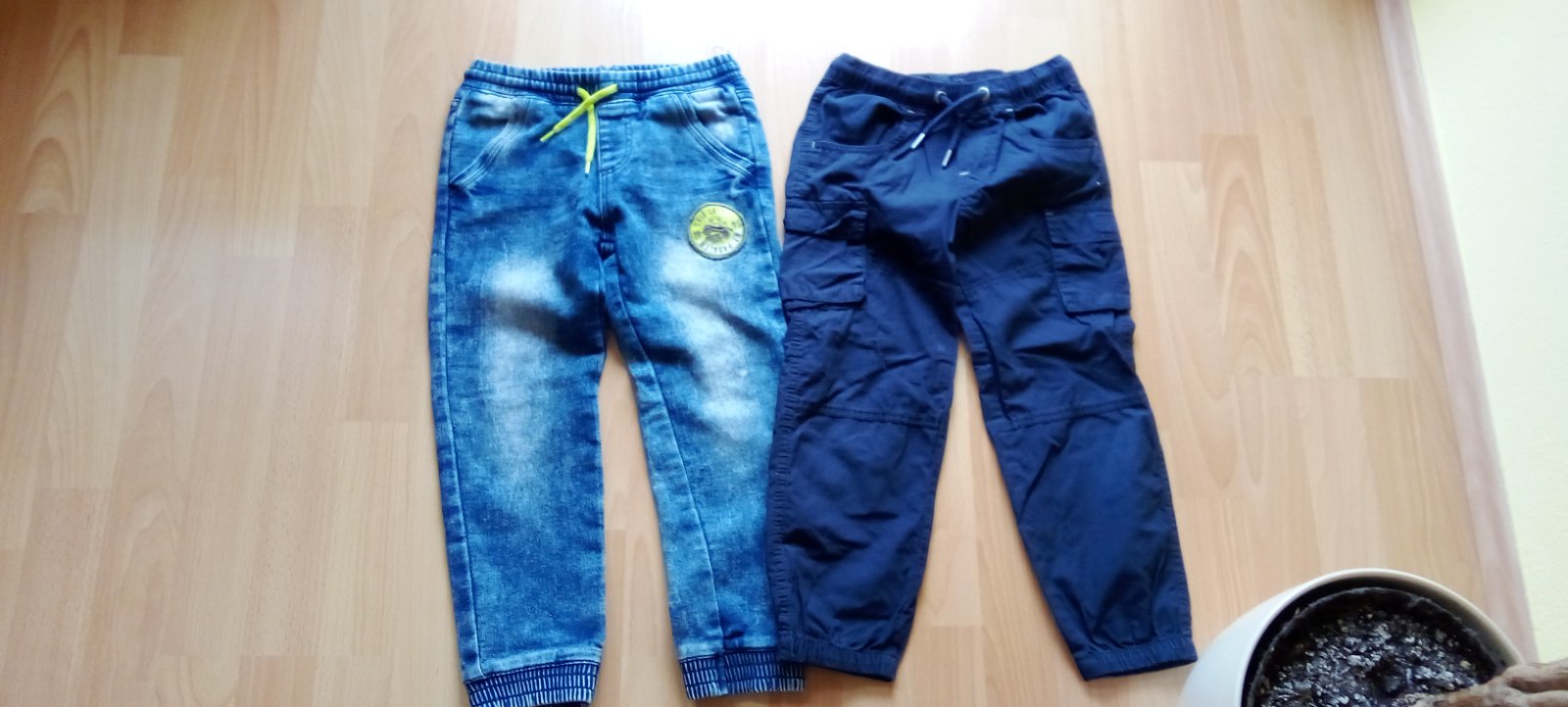 Mäkkučké menčestraky. Nosené, ale nemajú žiadne poškodenie. Veľkosť 116, regulovateľný pás. Cena 4 € + pošt.