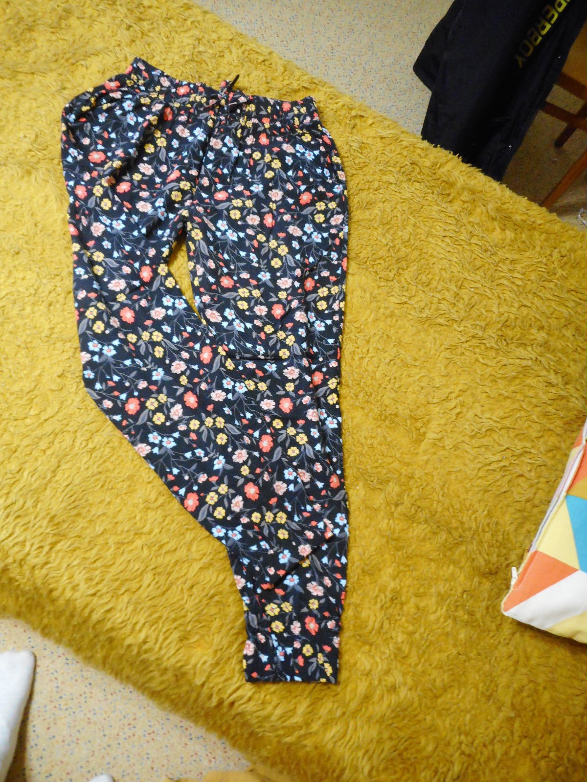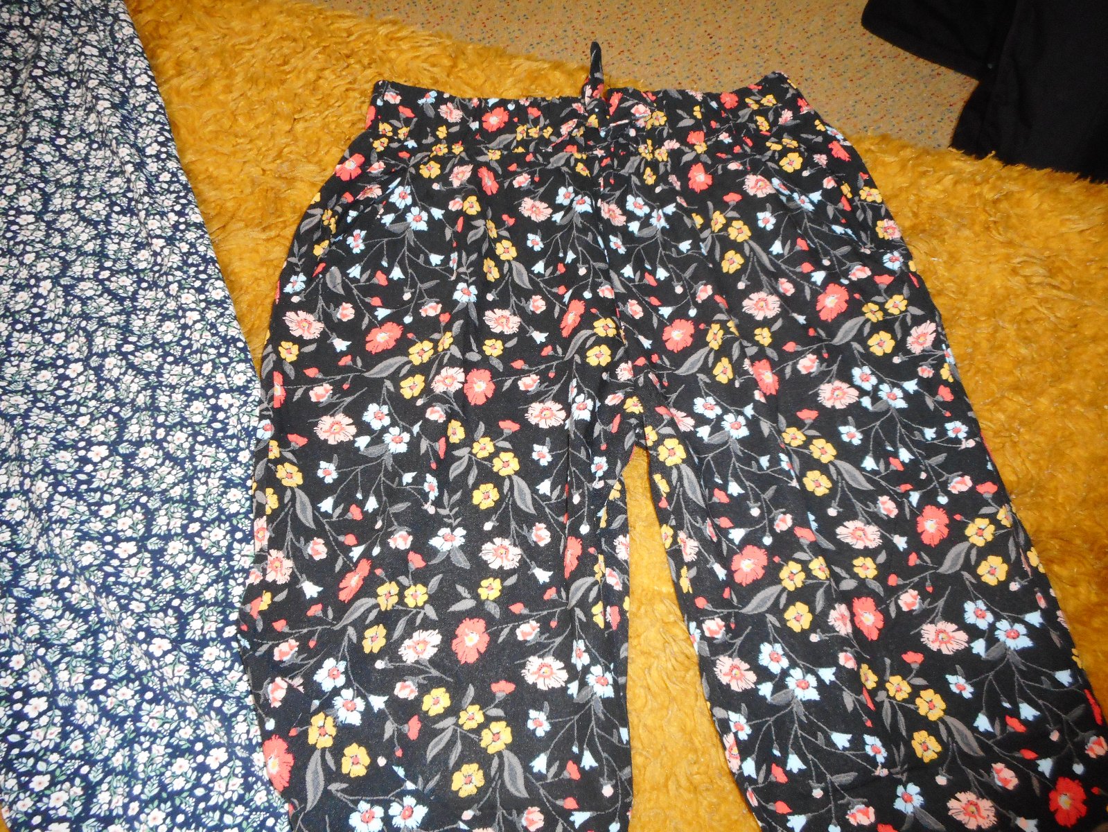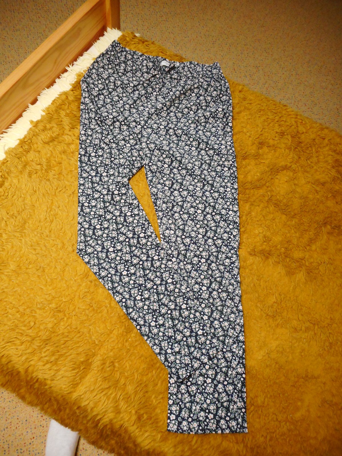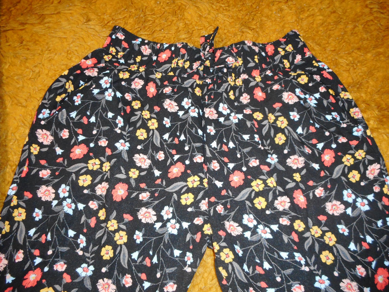 druhé používané nepoškodené tenké zn. basic needs veľkosť 152cm z takej chladivejšej látky, podklad tvorí čierna farba na ktorej sú drobné biele kvetinky s lístkami, pás gumičkový35cm, ešte sa natiahne na páse je našitá ozdoba mašličky, celková dĺžka nohavíc je 91cm, dve predné vrecká sú samozrejmosť, cena 3€, predávam spolu aj zvlášť