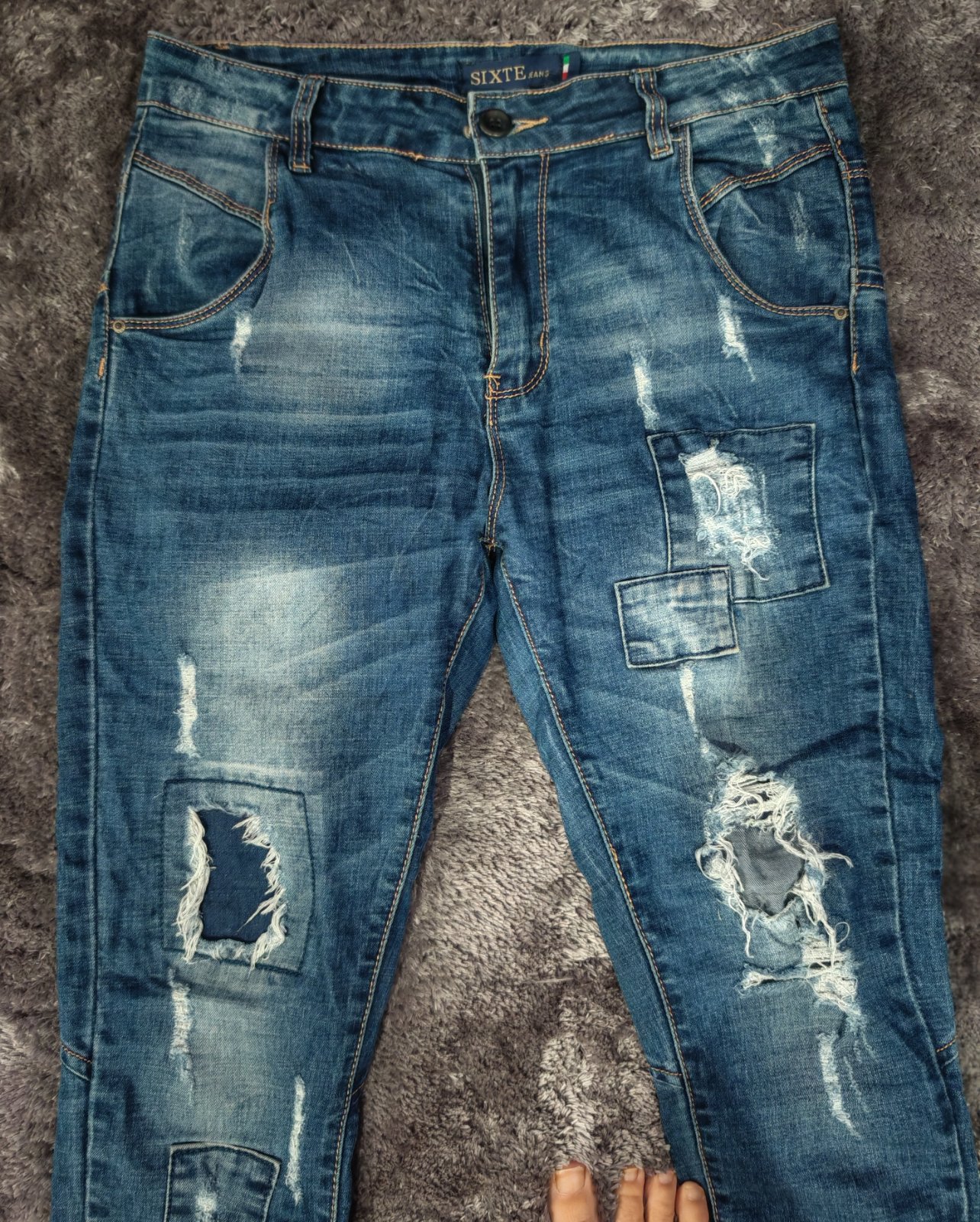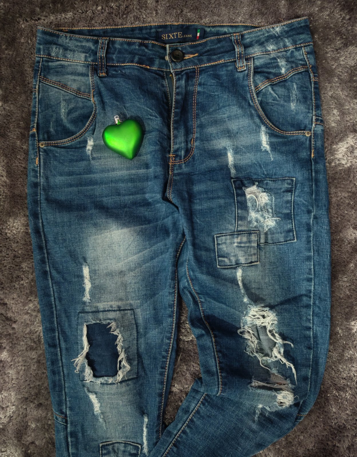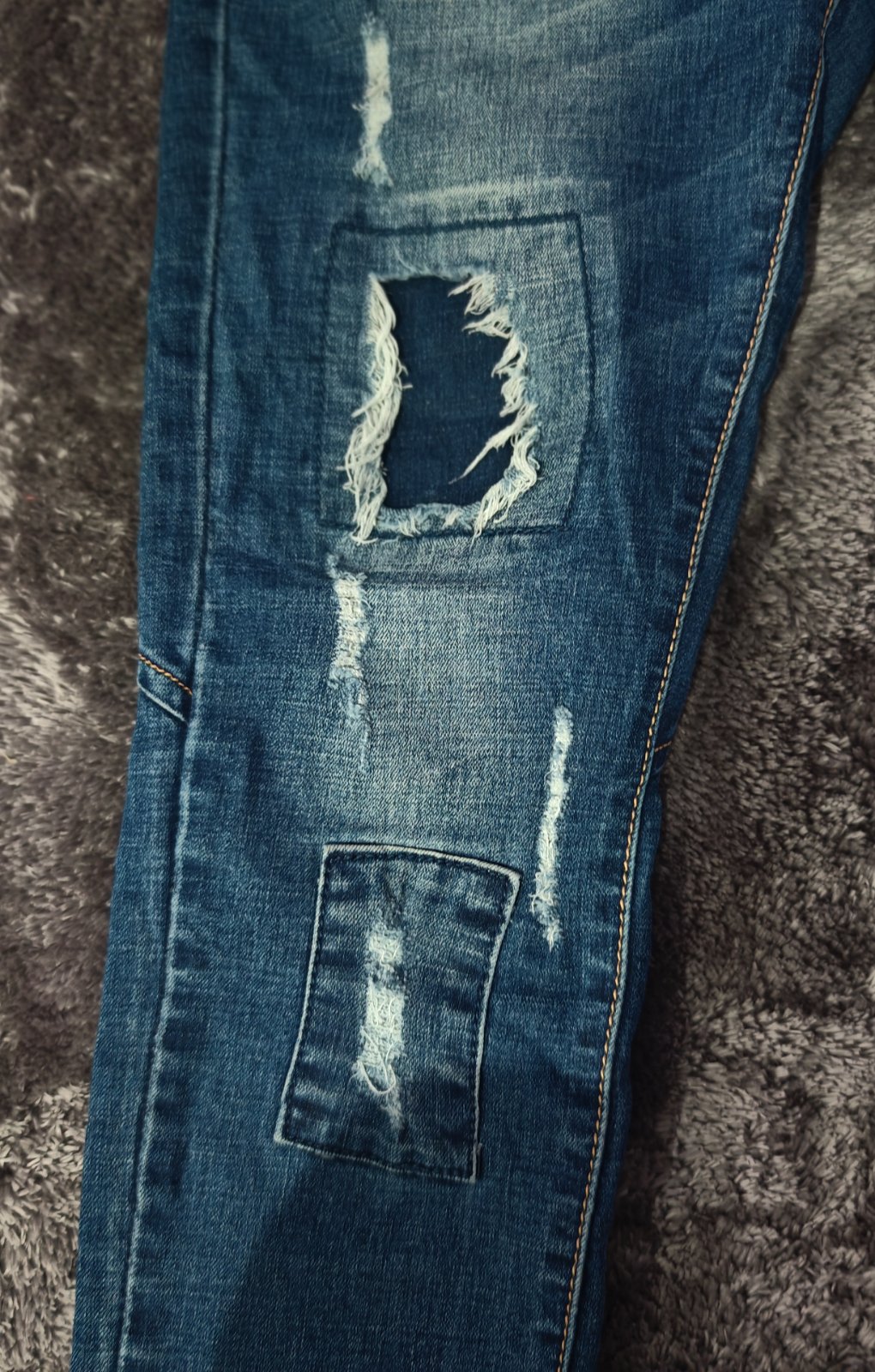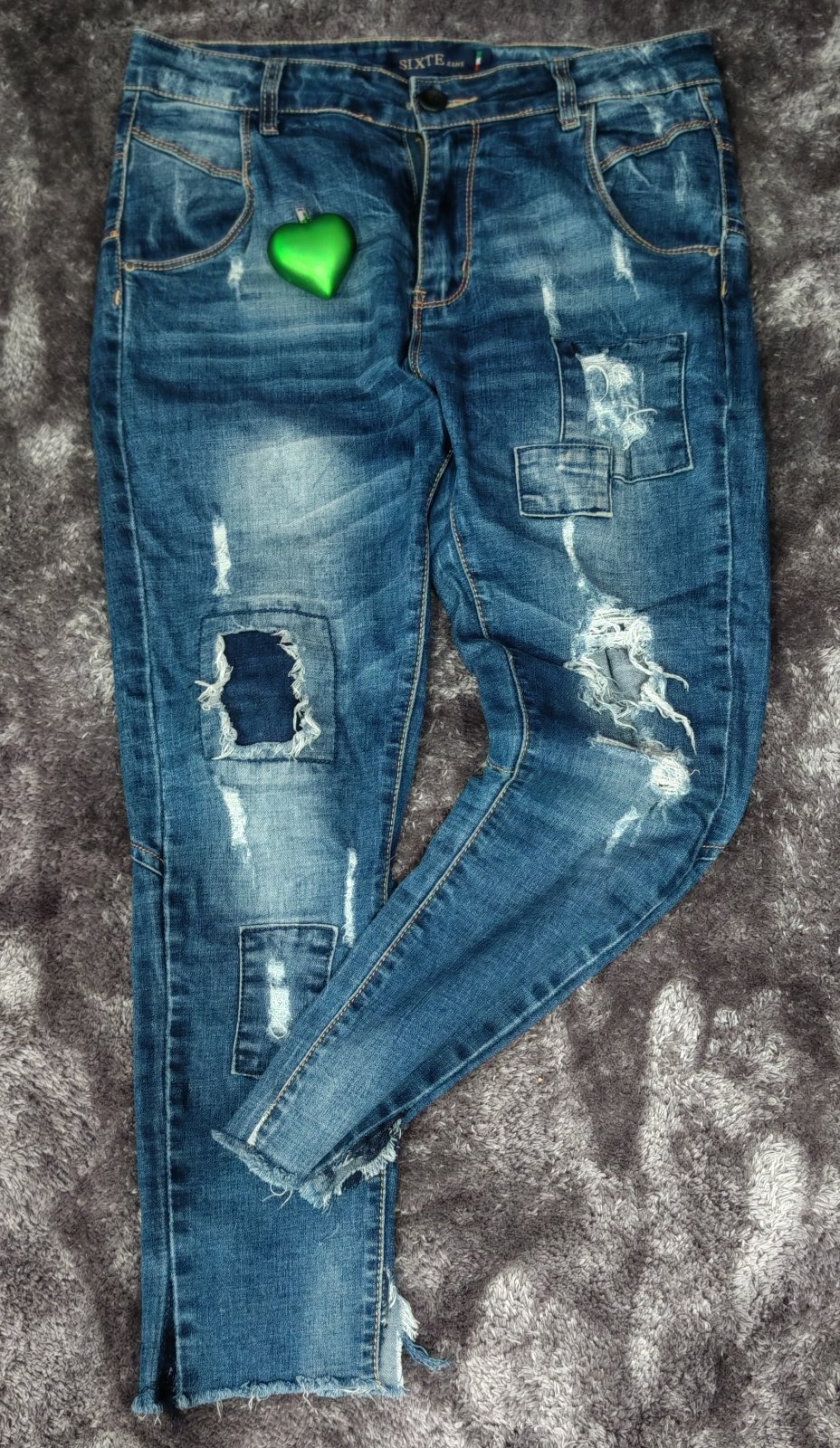Suchane rifle so zaplatami,jemne pruzia,pas je vyssi,nosene.oblubene,ale este paradu narobia.Maju odtrhnuty gombik-nasila som iny-vid foto a na spodku su natrhnute,ale vyzera to,ze to ma take byt :-)Pisana velkost S,ale podla mna M.riadte sa mierami