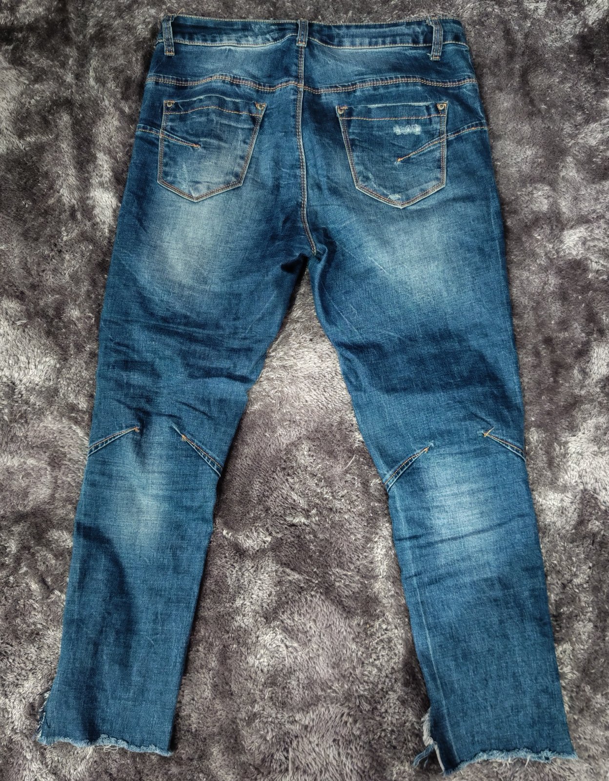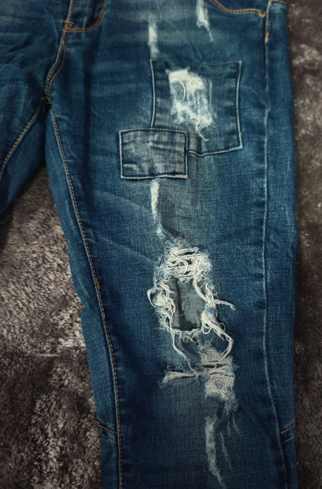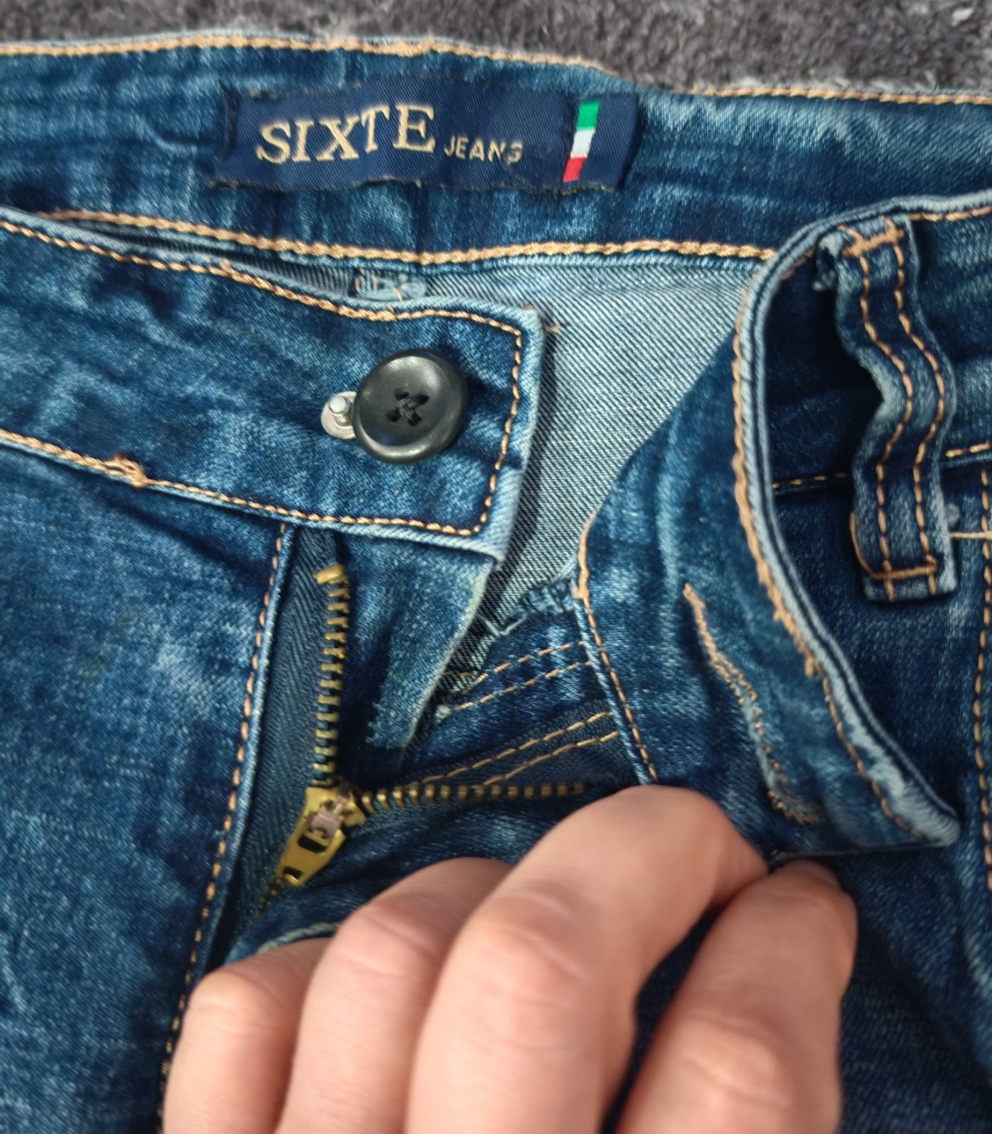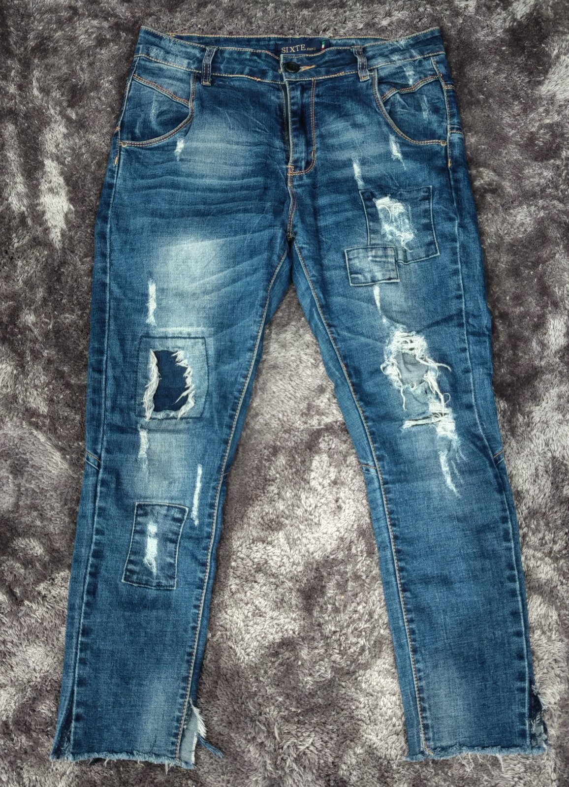Suchane rifle so zaplatami,jemne pruzia,pas je vyssi,nosene.oblubene,ale este paradu narobia.Maju odtrhnuty gombik-nasila som iny-vid foto a na spodku su natrhnute,ale vyzera to,ze to ma take byt :-)Pisana velkost S,ale podla mna M.riadte sa mierami