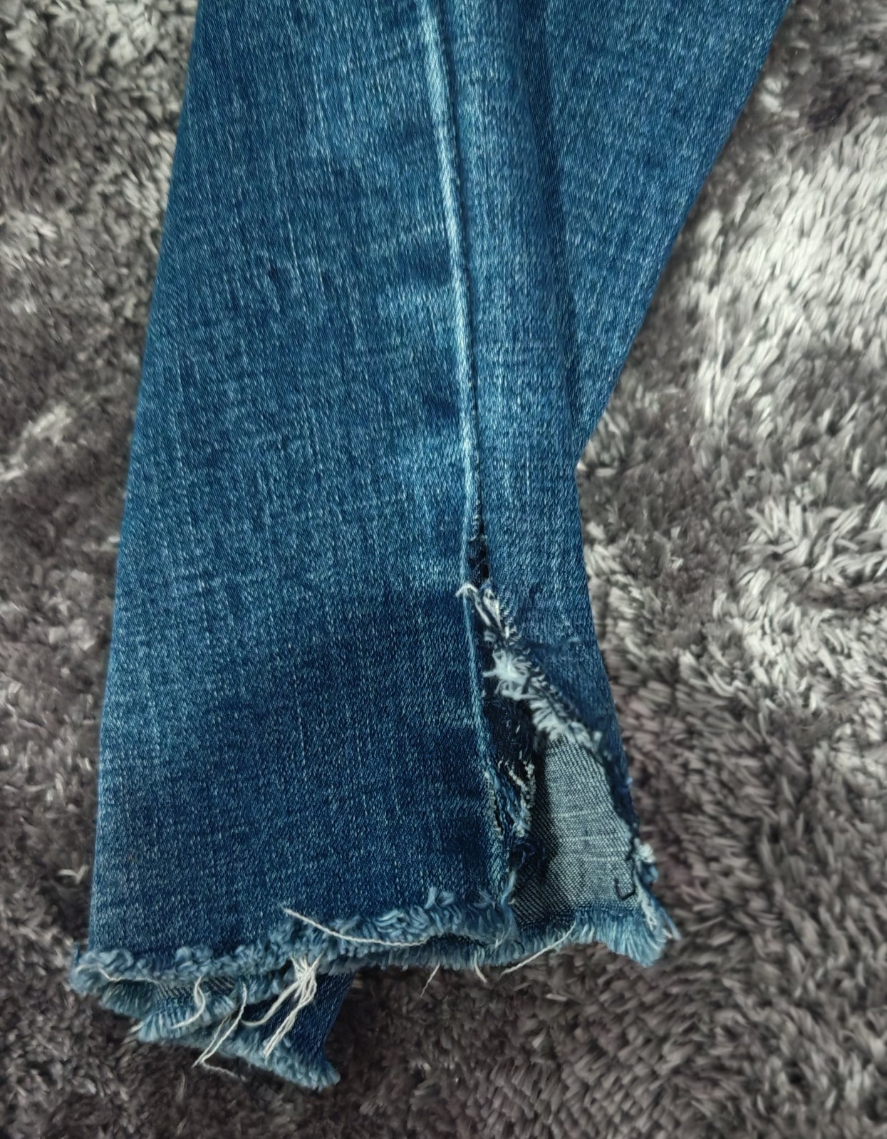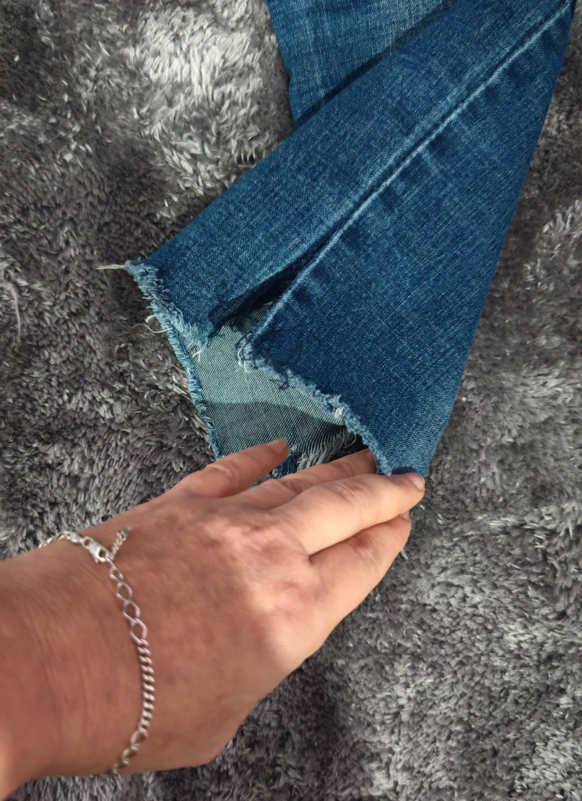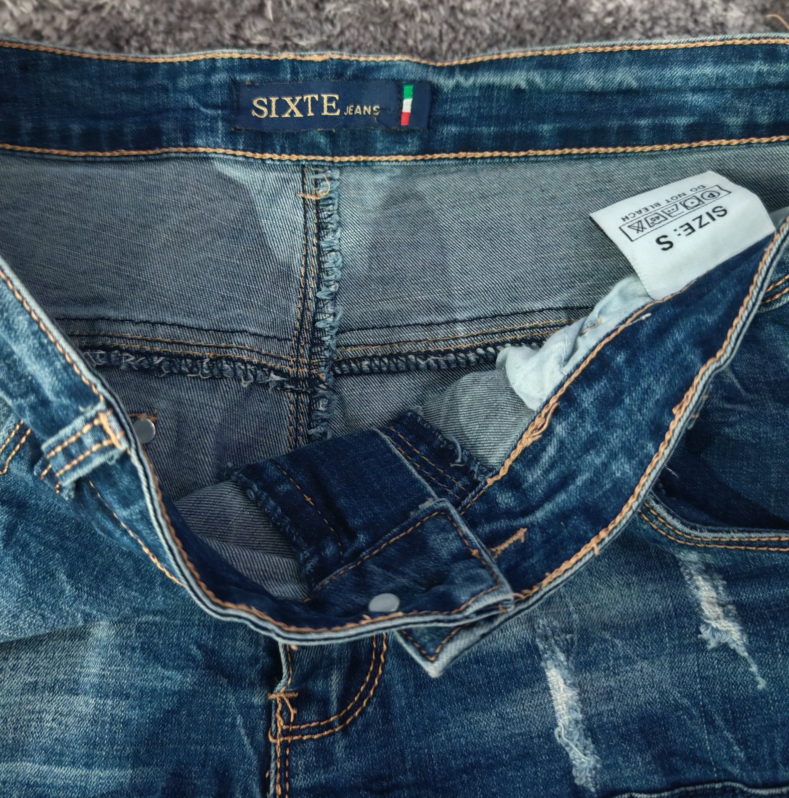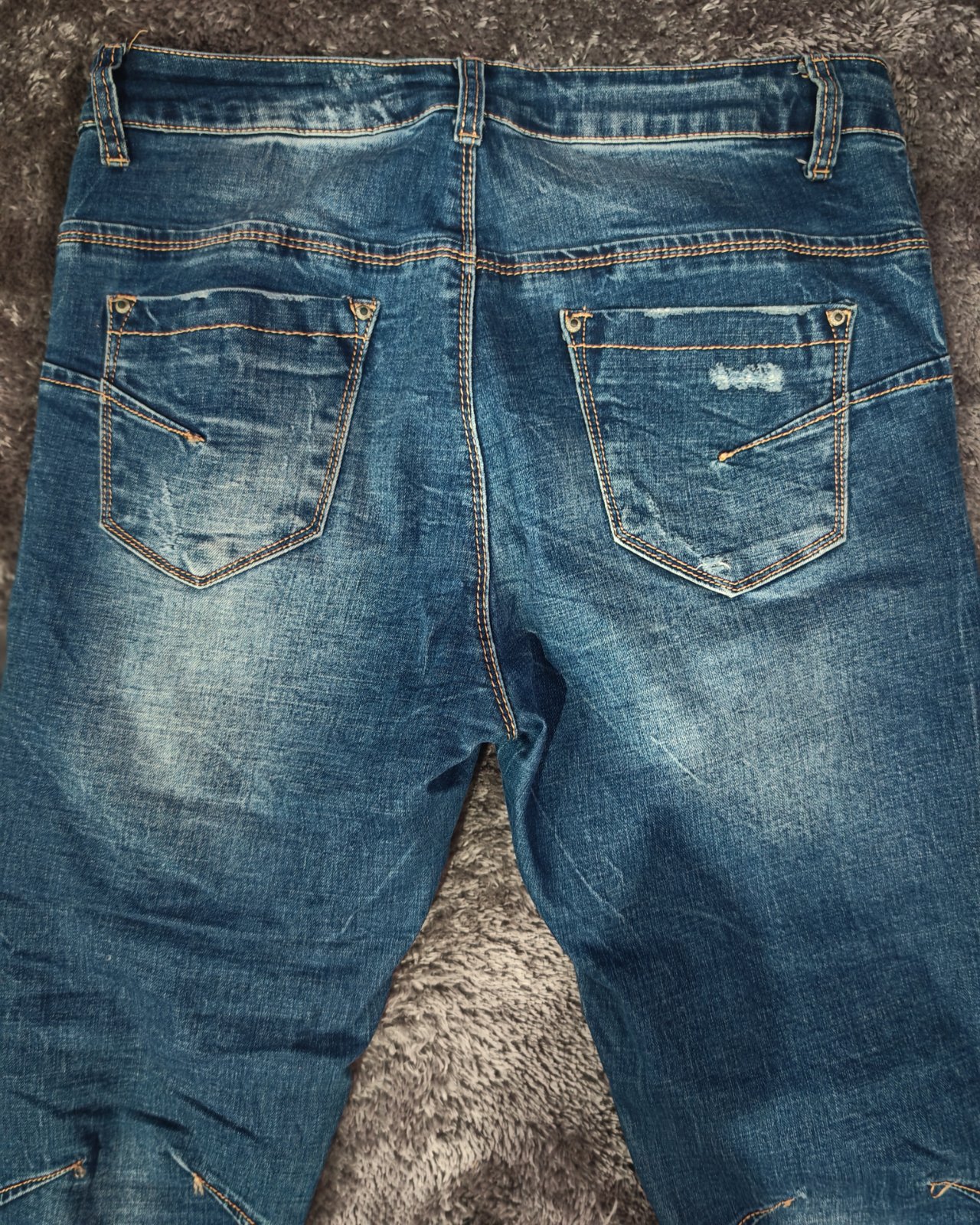 Suchane rifle so zaplatami,jemne pruzia,pas je vyssi,nosene.oblubene,ale este paradu narobia.Maju odtrhnuty gombik-nasila som iny-vid foto a na spodku su natrhnute,ale vyzera to,ze to ma take byt :-)Pisana velkost S,ale podla mna M.riadte sa mierami