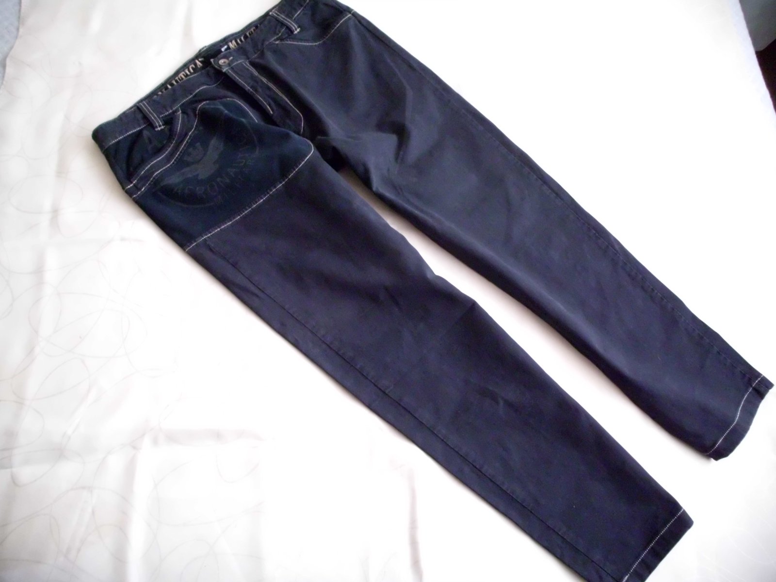Predám pánske nohavice na spôsob rifiel Aeronautica Militare vel. L- XL-56, dlžka 105 cm , pás 49,5 cm, predný sed 29 cm, zadný sed 39 cm, stehno 33 cm, spodok nohavice 19 cm, príjemný materiál bavlna + 2%elastan, 4 vrecká , farba , tnavomodrá farba, 100% stav