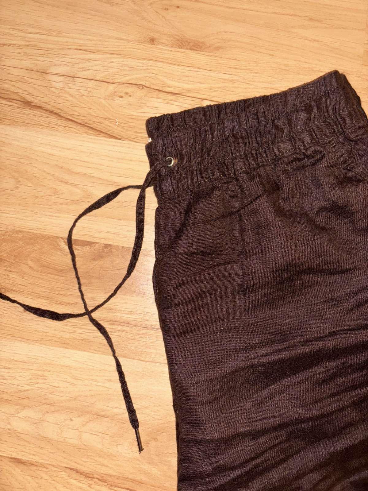 Výborný stav, ľanové, hnedé, v páse guma a šnúrka, veľkosť S, pás 37 cm, dĺžka 99 cm