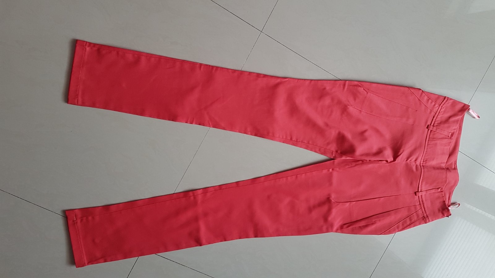 Nohavice sú veľmi príjemného materiálu a koralovej farby,vybrala som červenú lebo som nenašla v zozname koralovú.Uzky strih,v bokoch trošku rozšírené,na pútka,na boku zips,celková dĺžka 98 cm,v páse 33 cm,vhodné aj kodičkám i teniskám.
