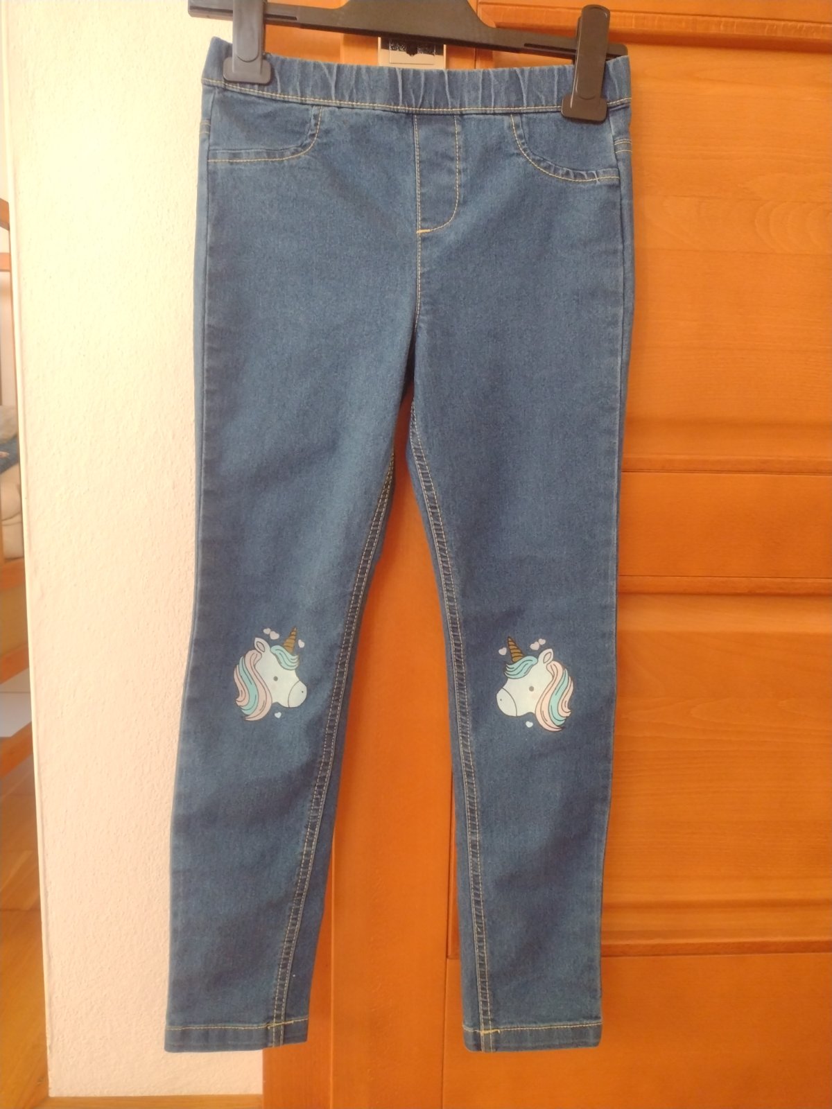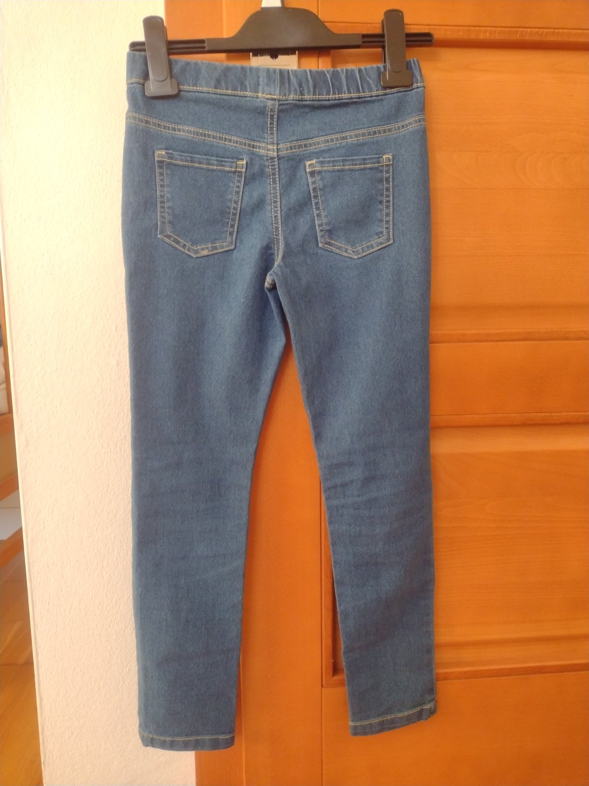 Posúvam nase oblubené rifliky. Boli nosené ale sú ako nové. Krásne sedia. Pás regulovatelné. Odporúcam :) velkost písaný 140 ale mi sme uz nosili vo velkosti 134. Rozmery pofotené.