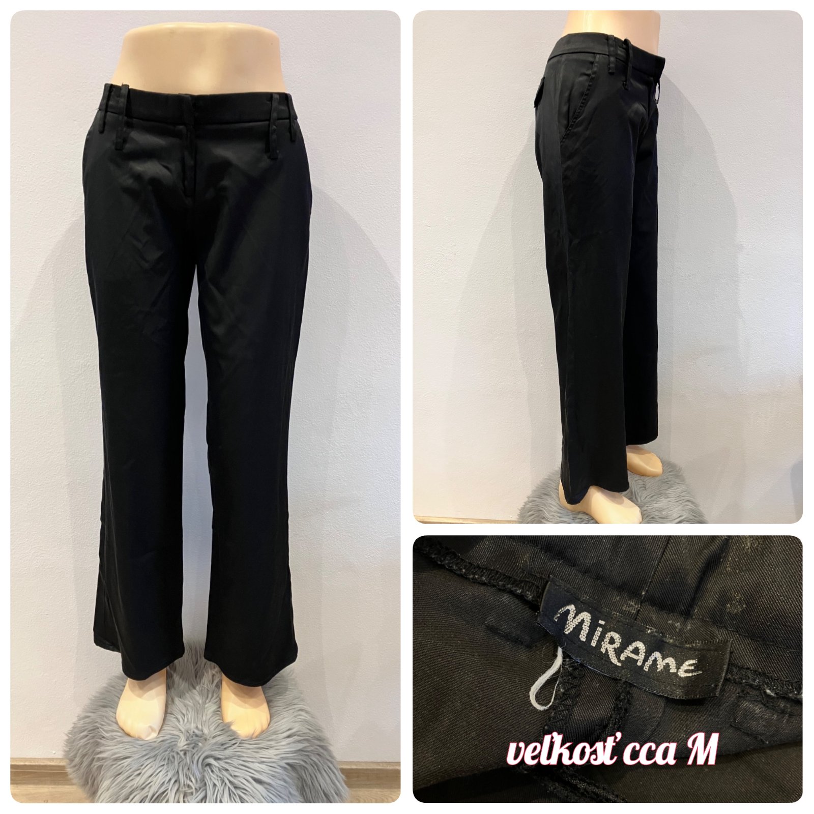 Dámske čierne nohavice, elegantné, hladký lesklý materiál, nízky sed, jemne elastické, veľkosť cca M, zapínanie na jeden gombík a na zips, pútka na opasok, dve bočné vrecká.