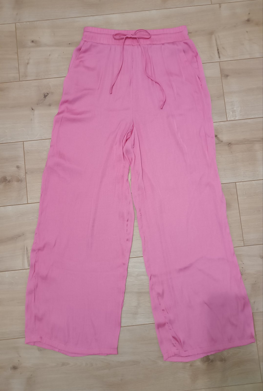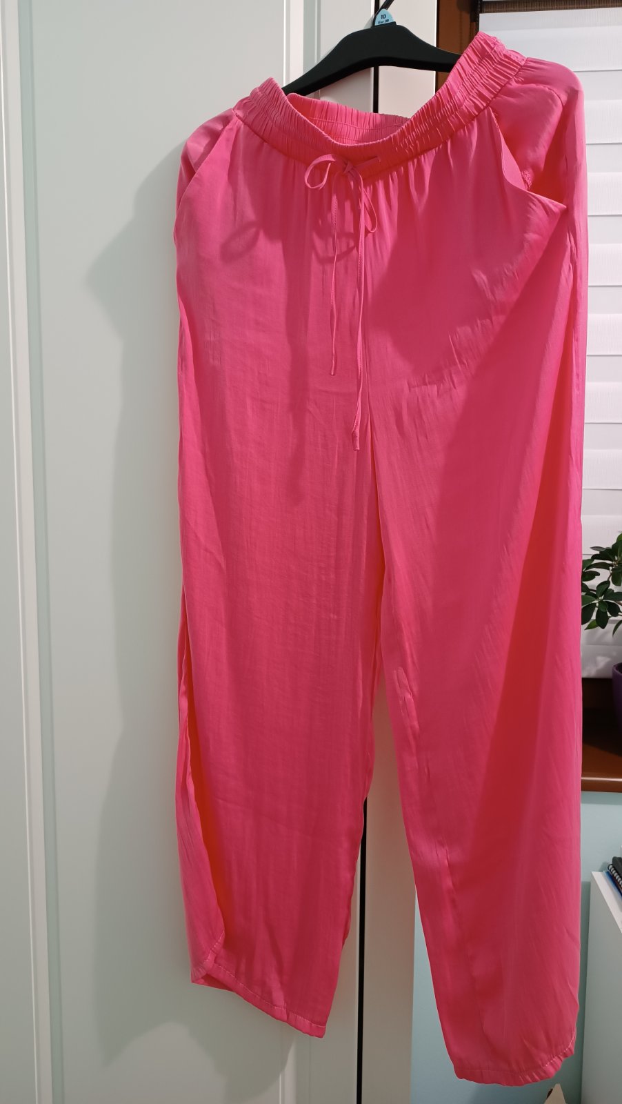 Vzdusne, siroke nohavice na leto, v krasnej ruzovej farbe. Nizky sed. Stitok so zlozenim som odstrihla, ale material zrejme obsahuje nejake percento lanu.