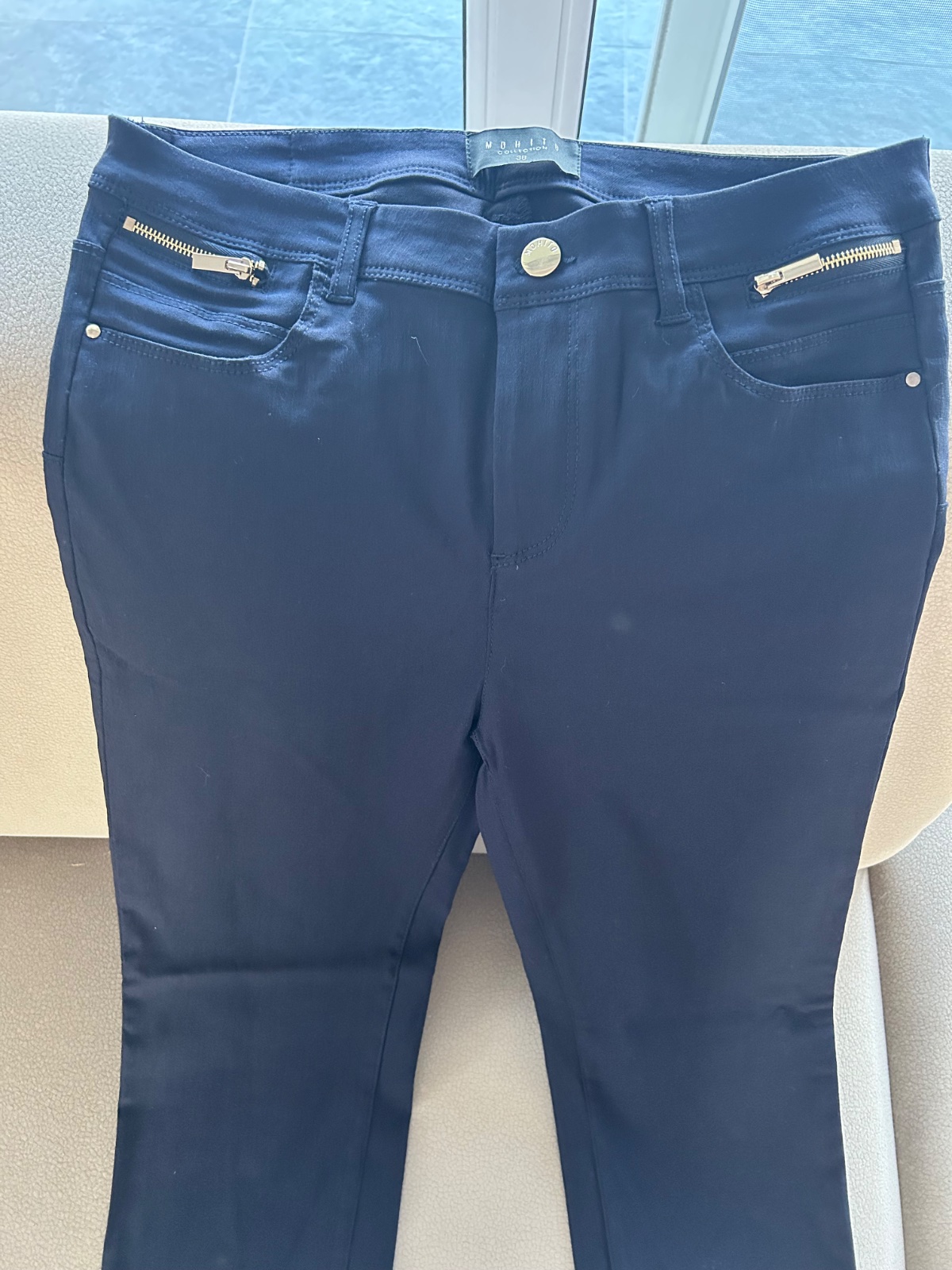Top stav. Ako nove,takmer nenosene. Pisana velkost 40, ale sedia skor na 38. Su elasticke. Dole na zipsy pri clenkoch. Farba modro bielo hneda.