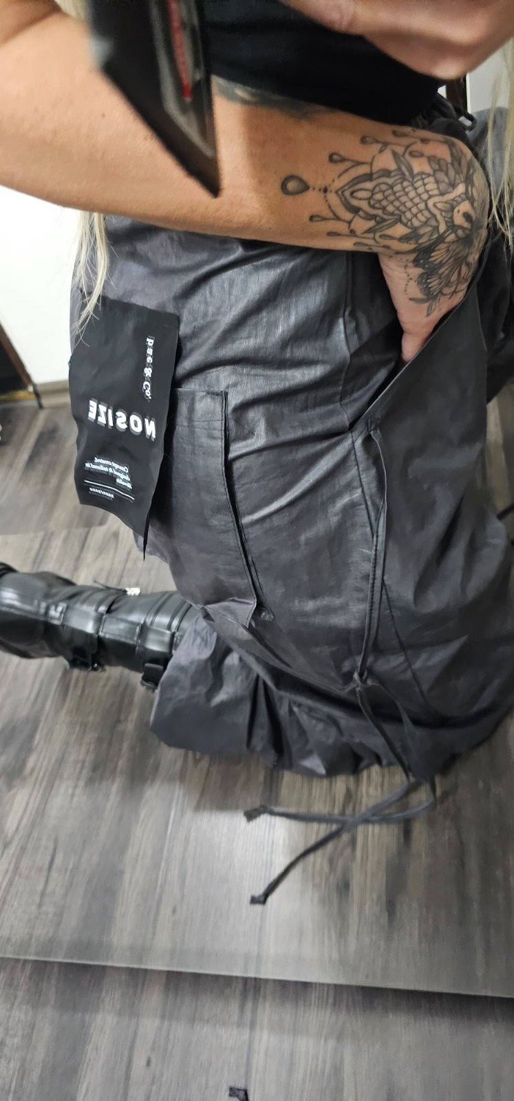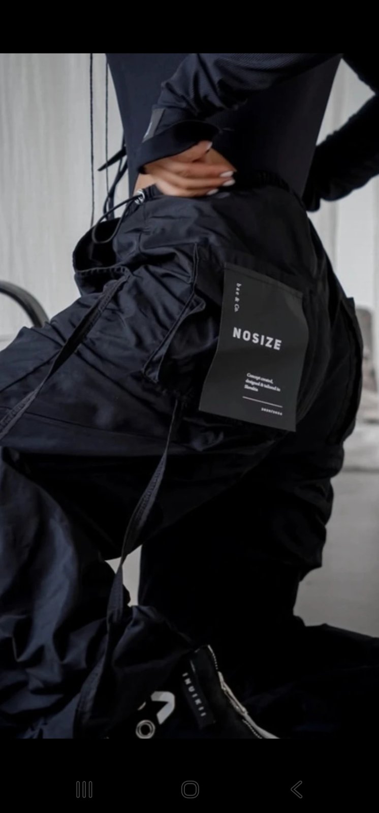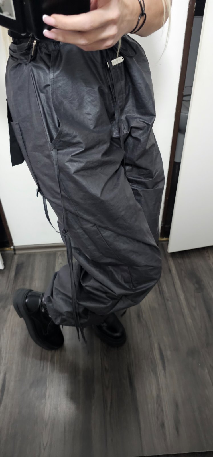 Stylove imidzovky zn Nosize,uz na stranke vypredane..velkos 1,,sedia s,m ,pogumovane nepremokave ,v pase posuvne,na gumu,,znacka aj na opasku aj zadnom vrecku..tmavo seda az cierna,urcite odporucam...