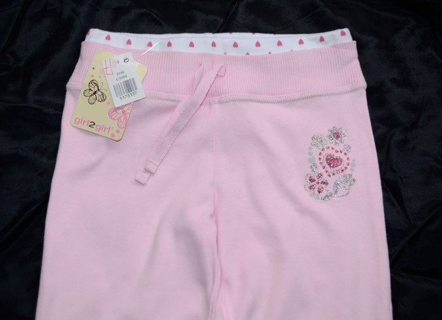Pekné bledoružové tepláky, vpredu obrázok so srdiečkom a kvetinkami. S visačkou, vhodné aj ako darček.