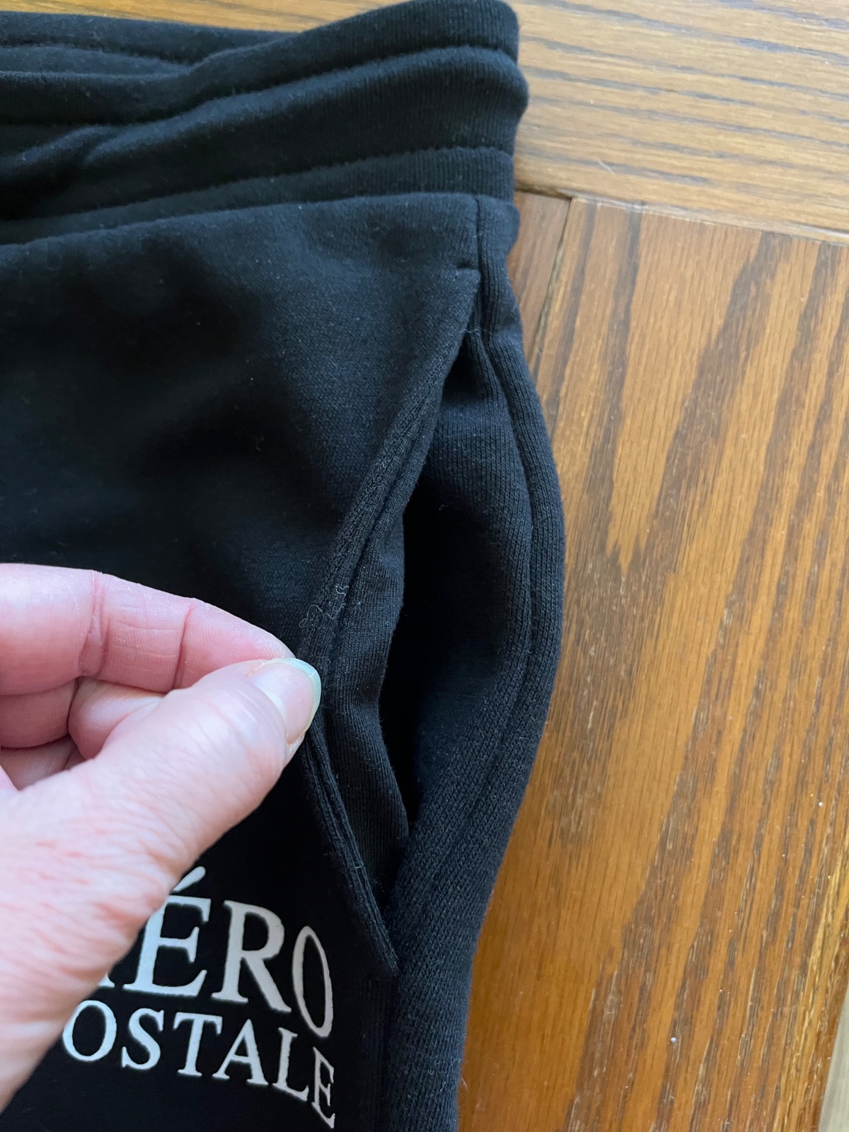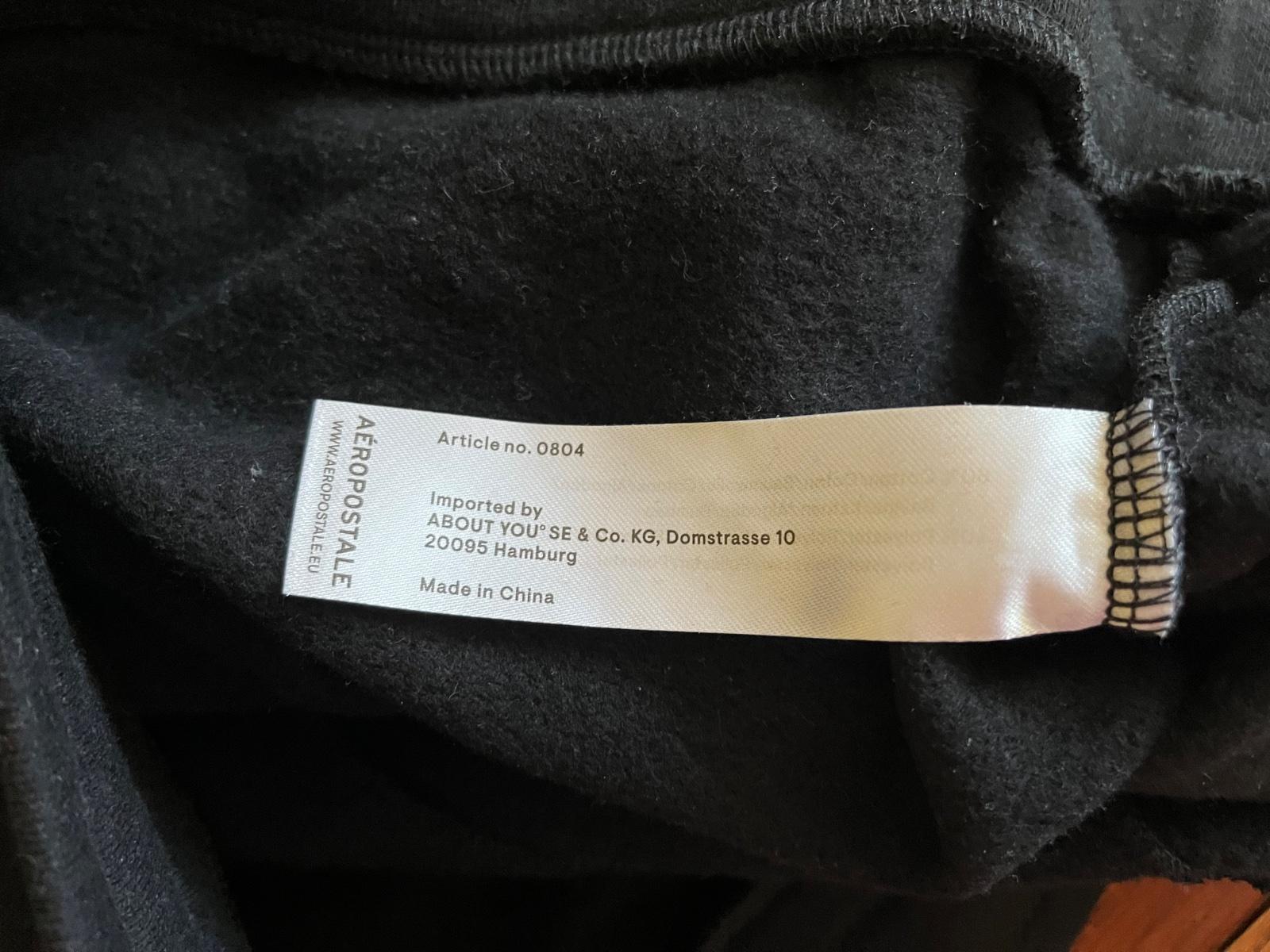 Po bokoch majú vrecká, na ľavej nohe je nápis značky. V páse je regulované sťahovanie na šnúrku, na konci kovového ukončenia je vyrazený nápis AEROPOSTALE. Na kovových ukončeniach dierok je vyrazený rok založenia značky 1987.