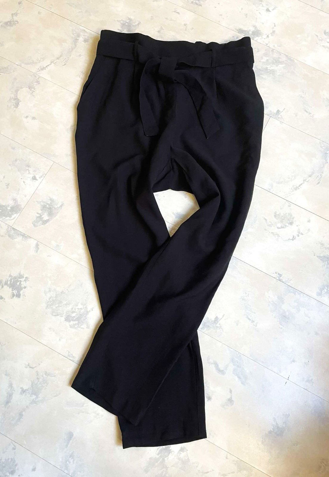 kvalitné raz oblečené nohavice s vysokým sedom a vysokým pásom,vzadu na širšiu gumičku,veľmi pohodlné,v páse je šerpa,ktorá sa nemusí použiť,ale výborne to vyzerá previazané - voľne alebo na mašľu,vpredu zámiky,na boku bočné vrecká podšité saténom,93 % viskóza,7 % polyester - výborná údržba a naturálne zloženie