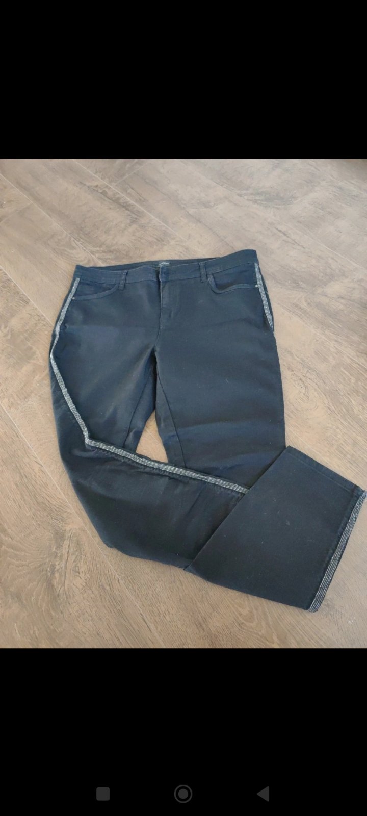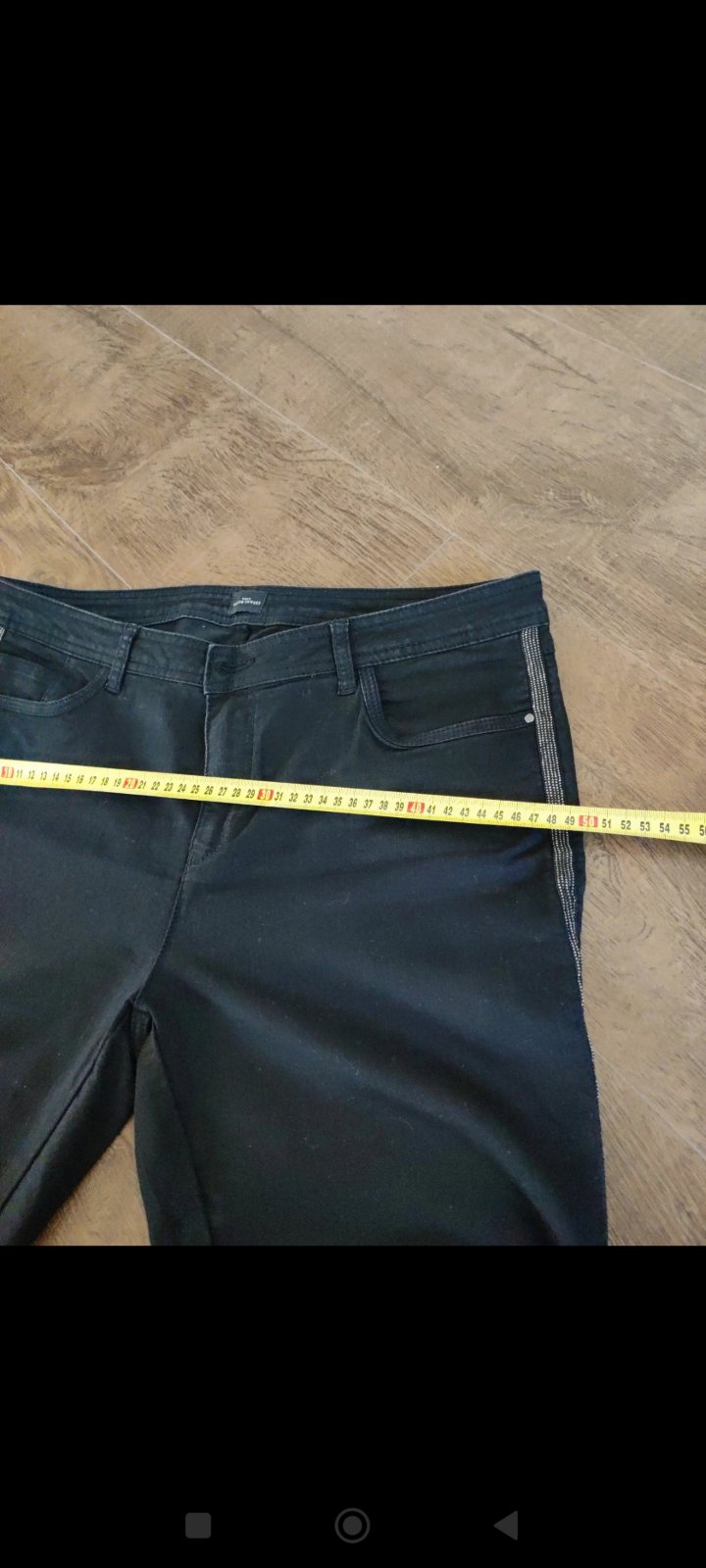 Prrdam cierne elasticke rifle 42 so zipsami na vreckach. Rozmery: pas 47, boky 57, sedlo 33, dlzka 100.