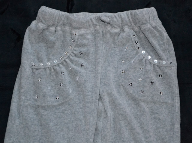 Velúrové tepláčky, nosené máličko. Na vreckách ozdobené flitríkmi.