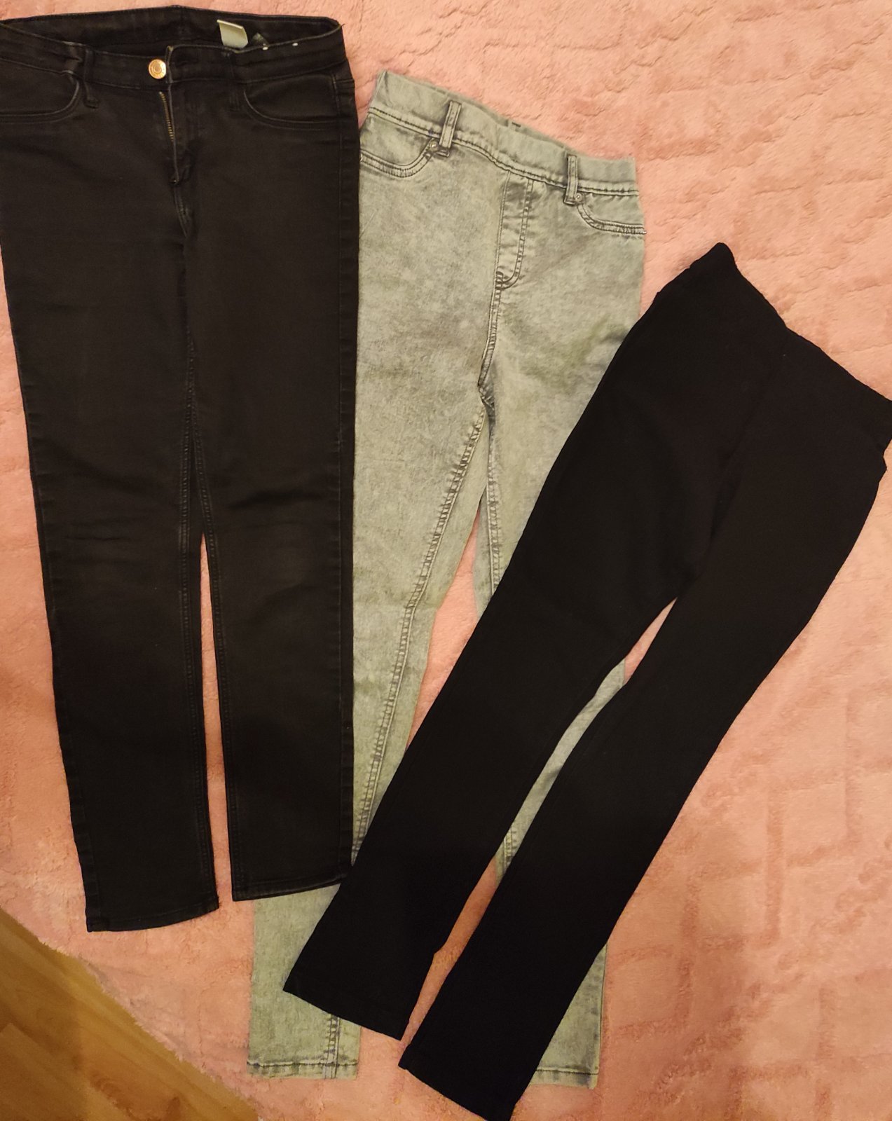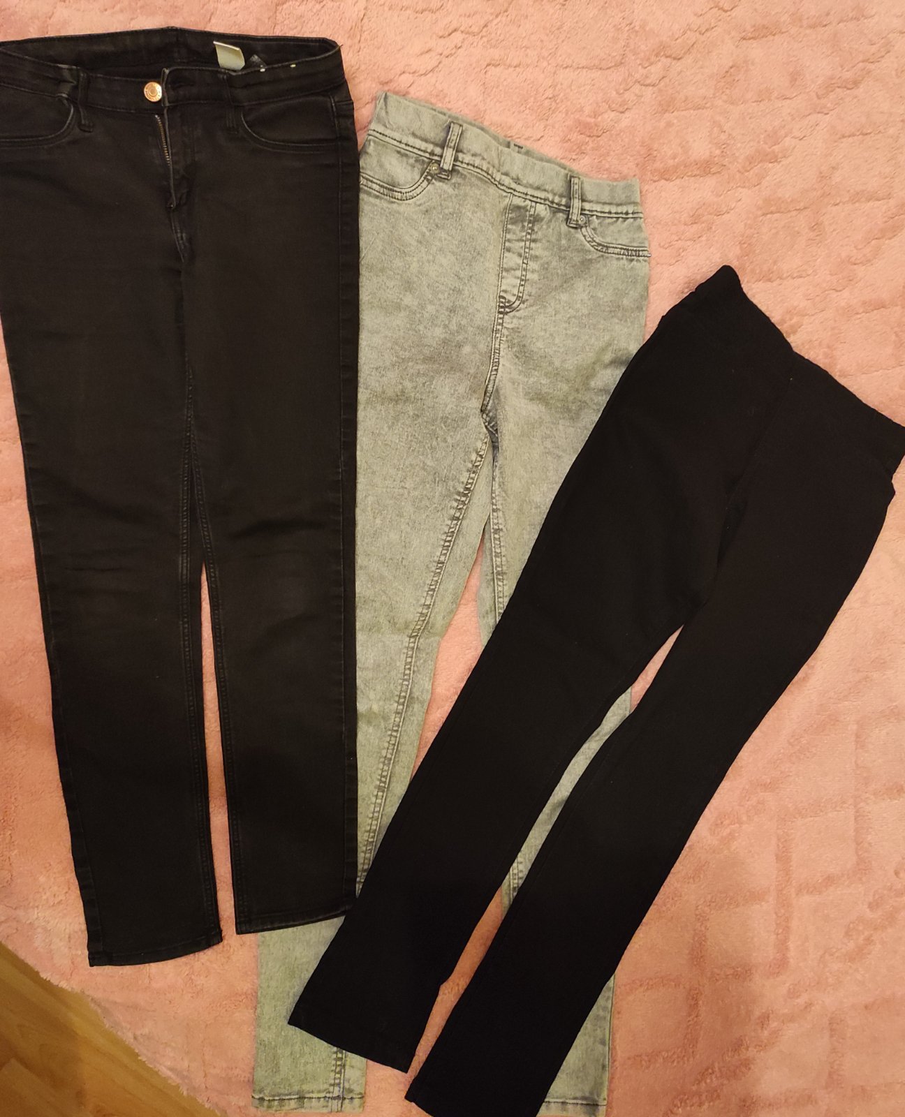 Čierne rifle pre štíhlu slečnu. Vyšší pás. Na štítku veľkosť EUR 32. Môže zodpovedať v.140/146. Miery na foto.