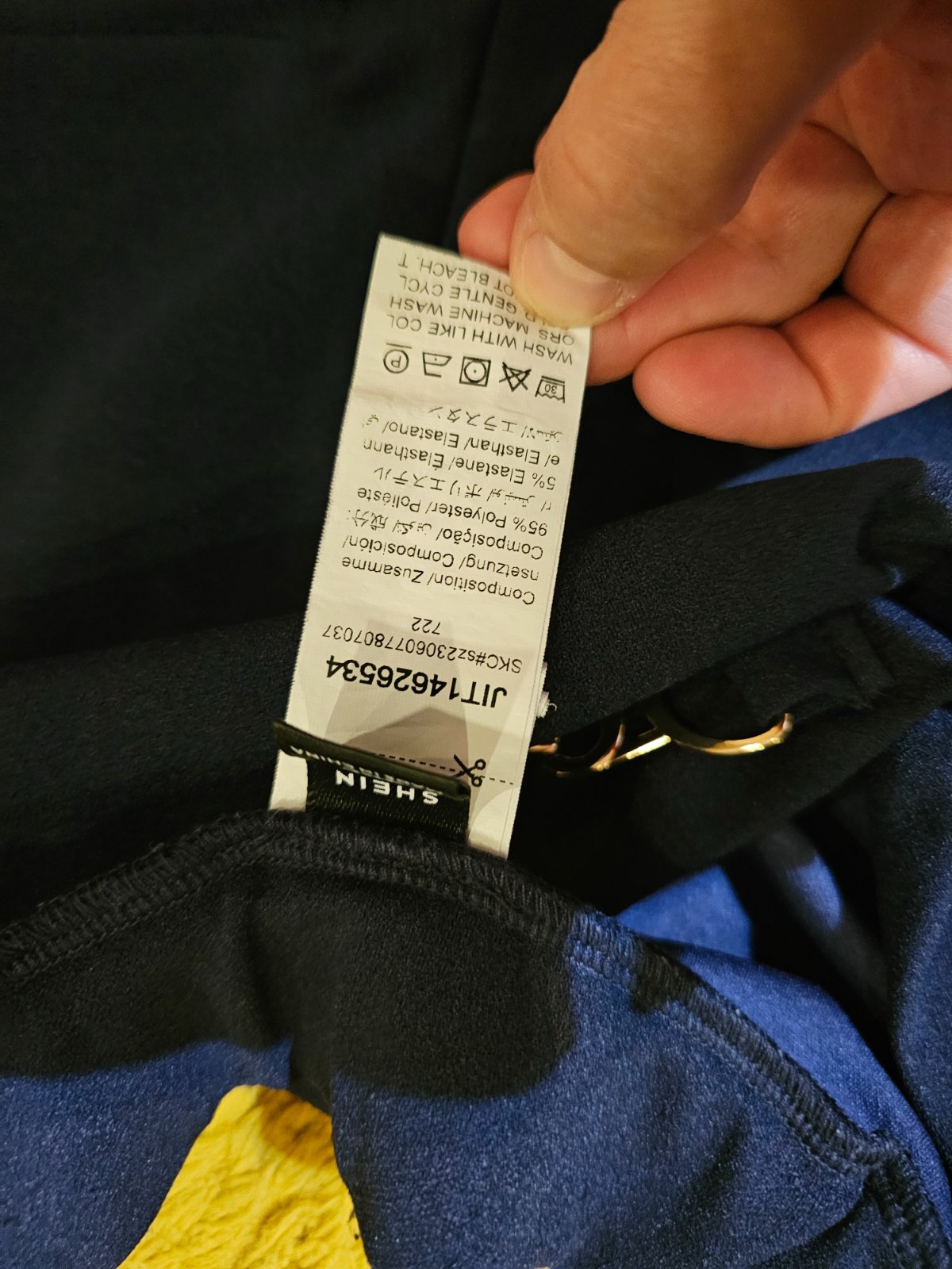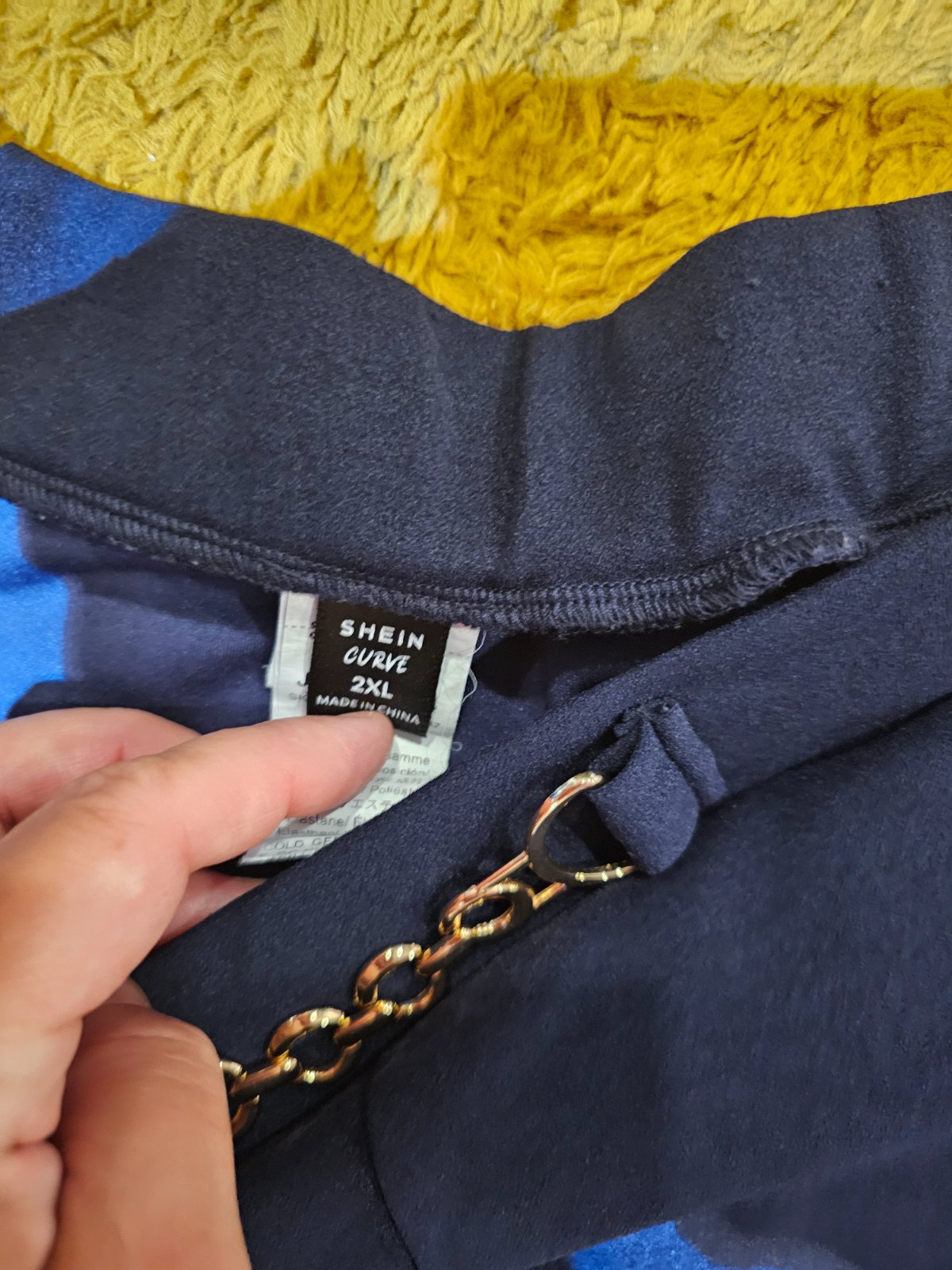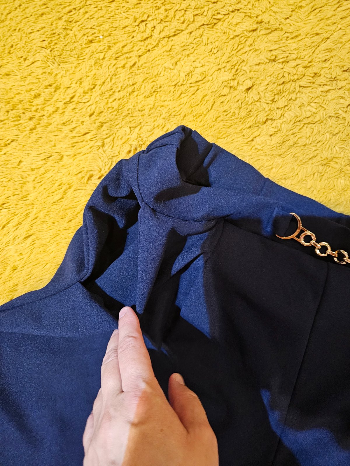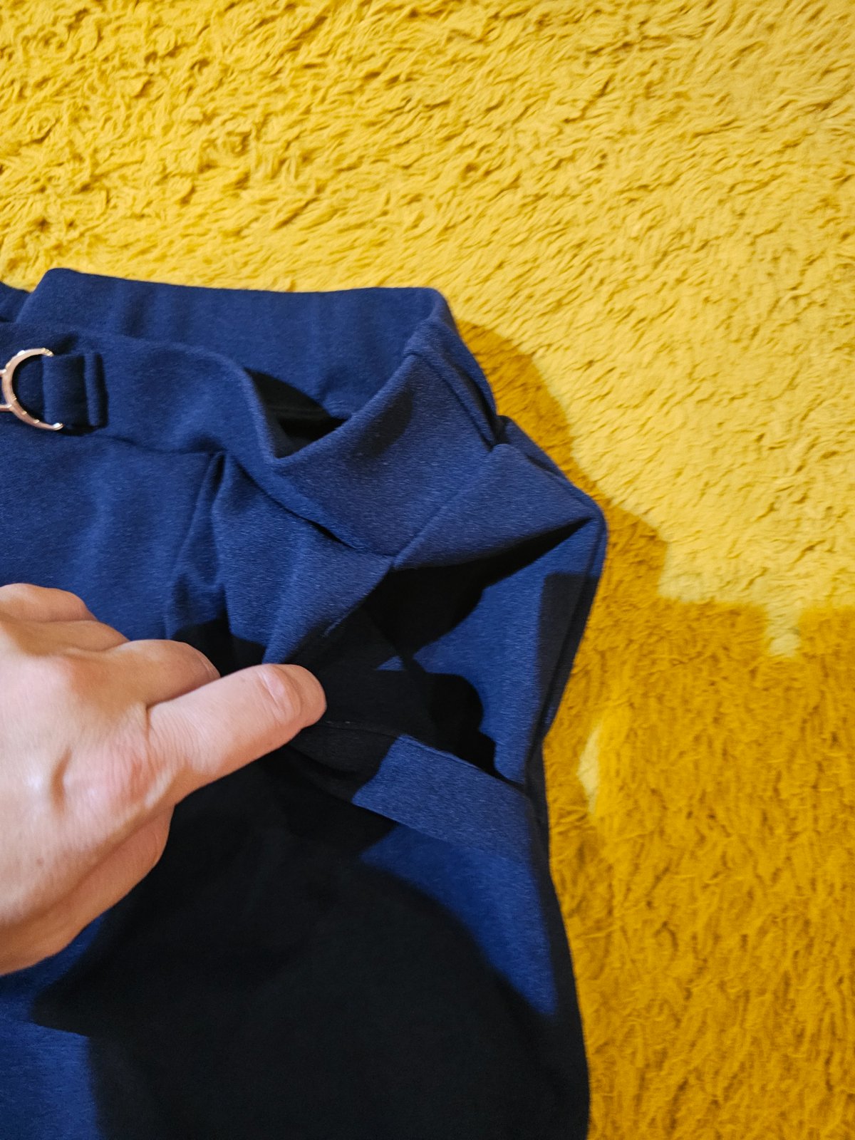 Elegantne nohavice s vreckami a so zlatou sponou. Sirka v pase vklude 47,5cm, natiahnuta 60cm, vzadu je gunicka. Dlzka vonkajsia 98cm, vnutorna 65cm.