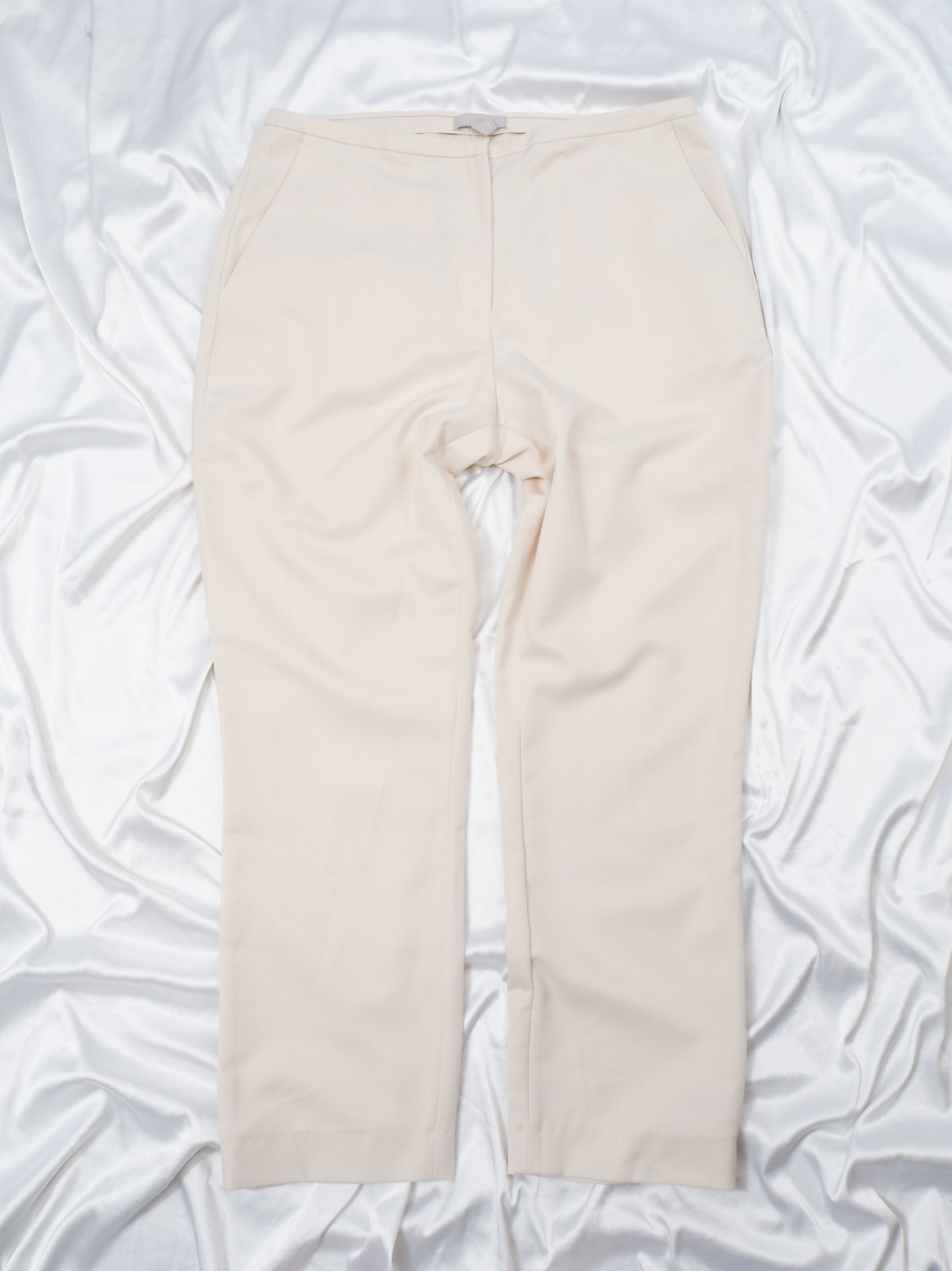 Kvalitné bielomaslové nohavice s gumkou v páse, zapínanie na zips a háčik, materiál 78% polyester, 21% viskóza, 1% elastan, super stav.