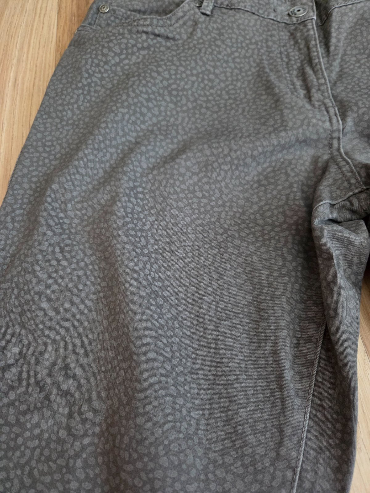 Sú tmavošedé v peknom nosenom stave. Farba nie je spraná,ale majú akoby vyšúchaný vzhľad.