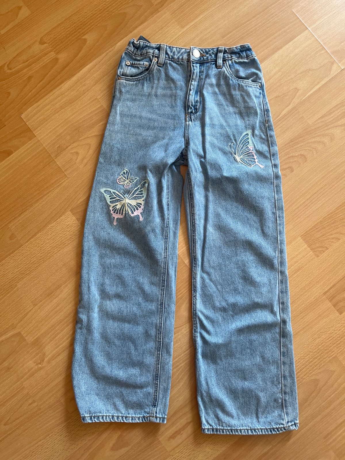 Štýlové 7/8-nkove rifle dole posunuté obsite s popisanou lemovkou na bokoch, na stehnách akoby trošku presuchane no také boli od začiatku, v top nosenom stave, veľkosť 152-11/12 rokov, značka Takko...