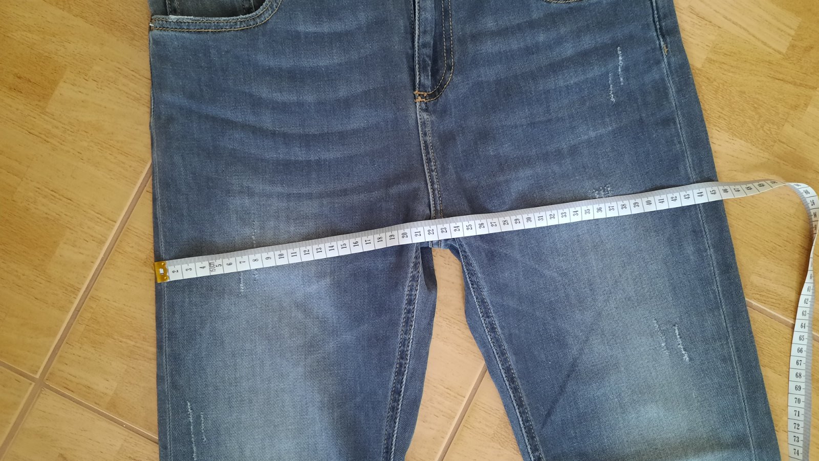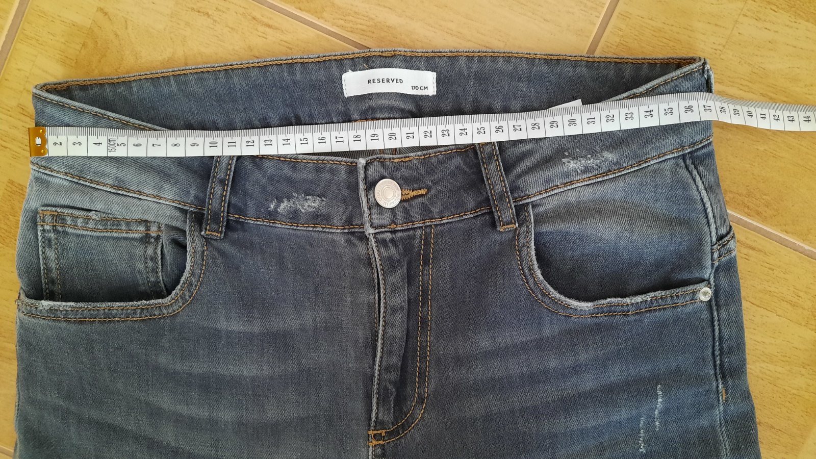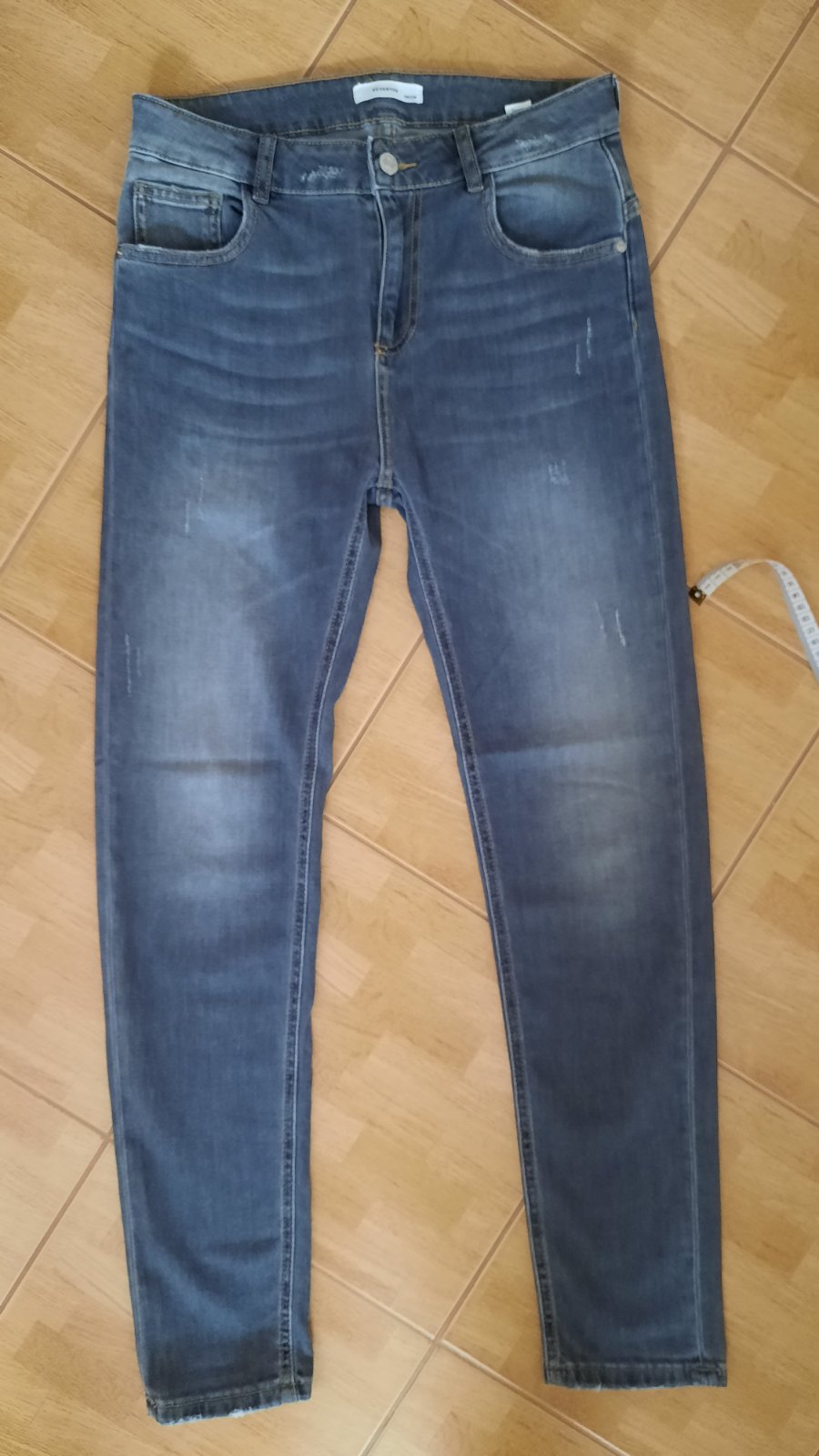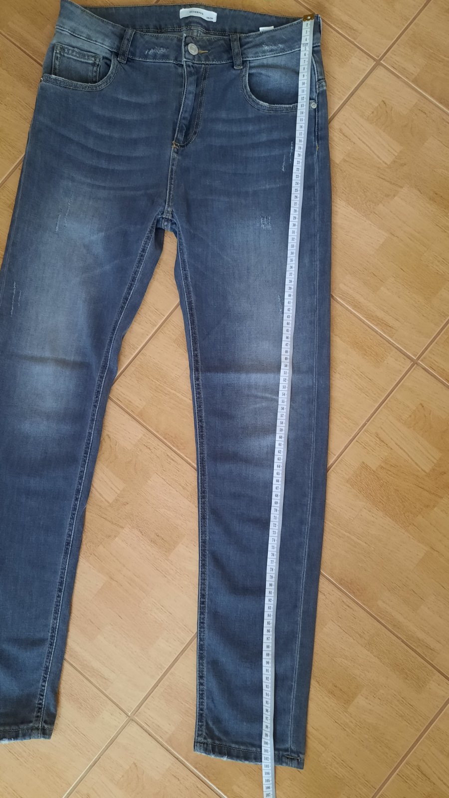 Nenosené rifle iba opraté, zmerané na fotkách. Mäkká, tenká riflovina, vhodná aj na leto. Od zakúpenia trochu chybná gumička vo vnútri na sťahovanie, ale je plne funkčná/ posledné 2 fotky/.