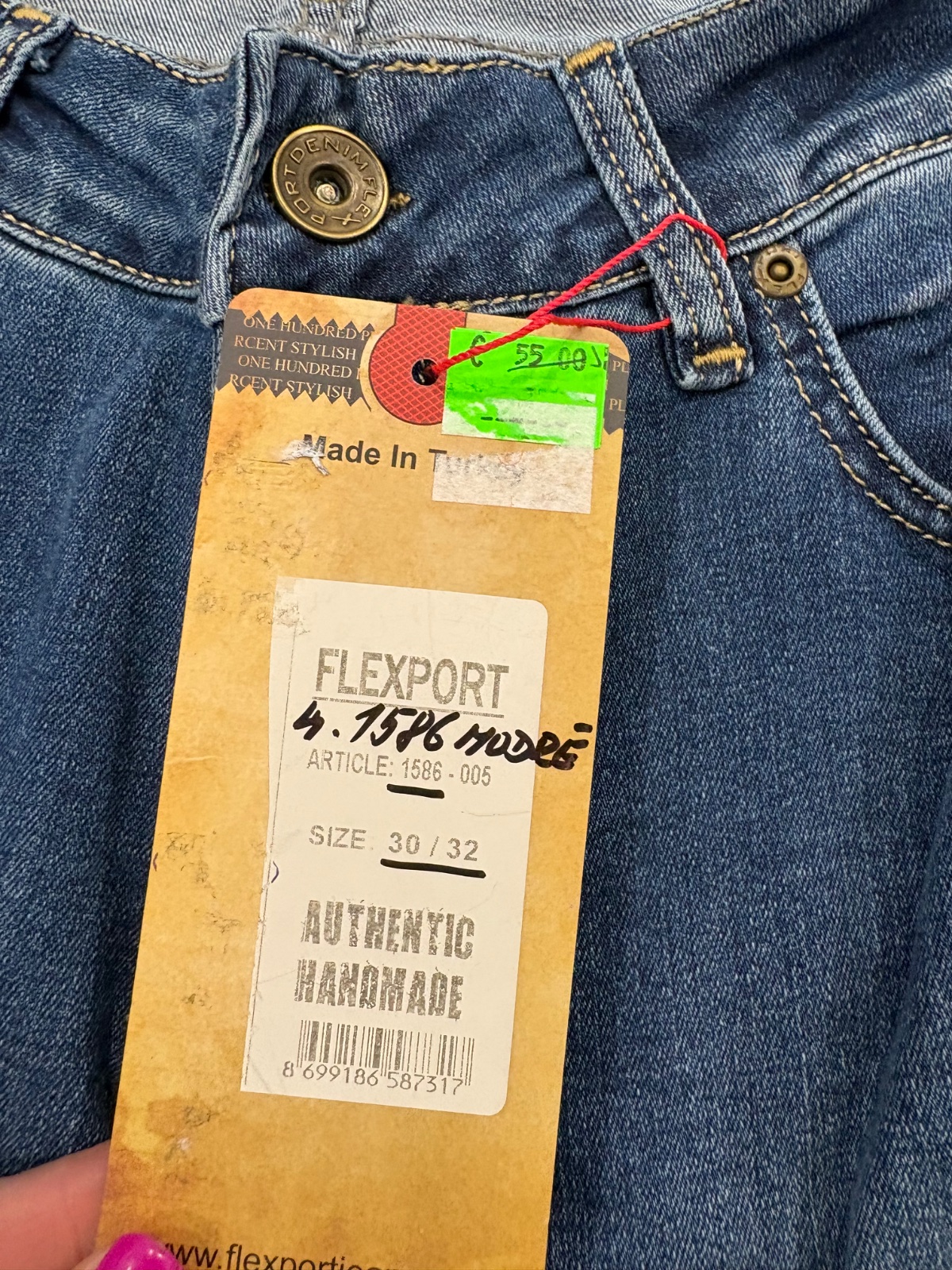 FLexport nove damske riflove nohavice ,komplet s etiketou,PC 55eur, material bavlna a elastan,velkost W30L 32,dlzka je 99cm, sirka v pase je od 37x2cm do 43x2cm,predny sed je 23 a zadny je 35cm,sirka stehna pod rozkrokom je od 26x2cm do 29x2cm,sirka dole je 15cm