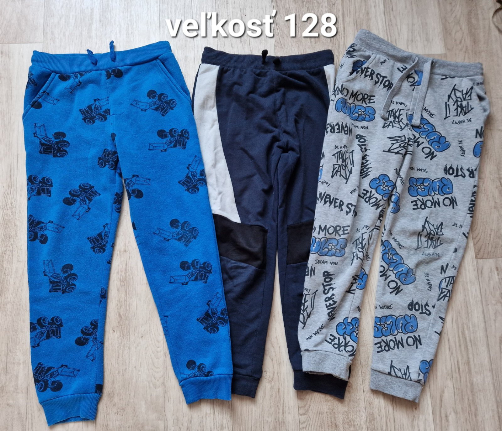 Chlapčenské tepláky, modré s autami nenosené, zvyšné pekný nosený stav.