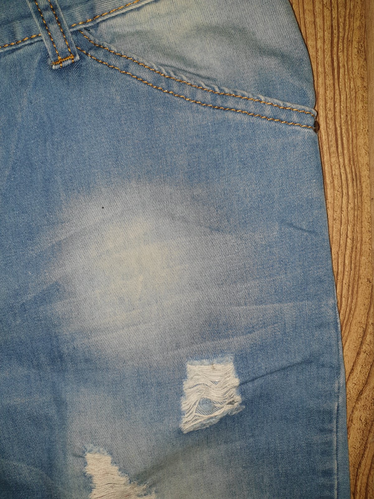 Šúchané modré rifle, pohodlná , strečová riflovina. Bez vád. Klasický rovný strih. Rozmery: pás š: 45 cm, boky š: 58cm, dl vnut: 76cm. dl vonkaj:103cm.