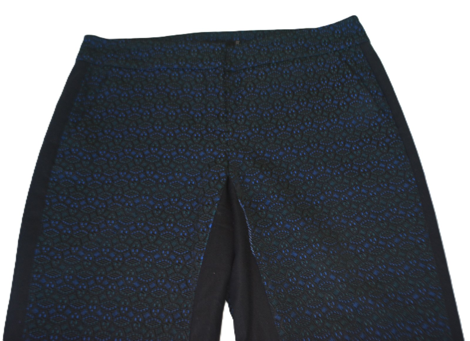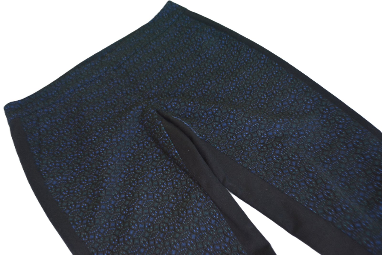 Dámske nohavice Karen Millen s tkaným modrým vzorom v čiernom základe a čiernymi paspulami po bokoch.
