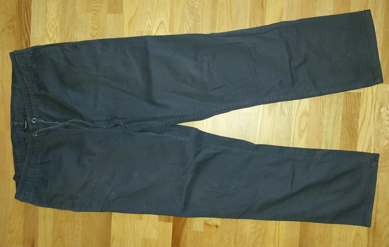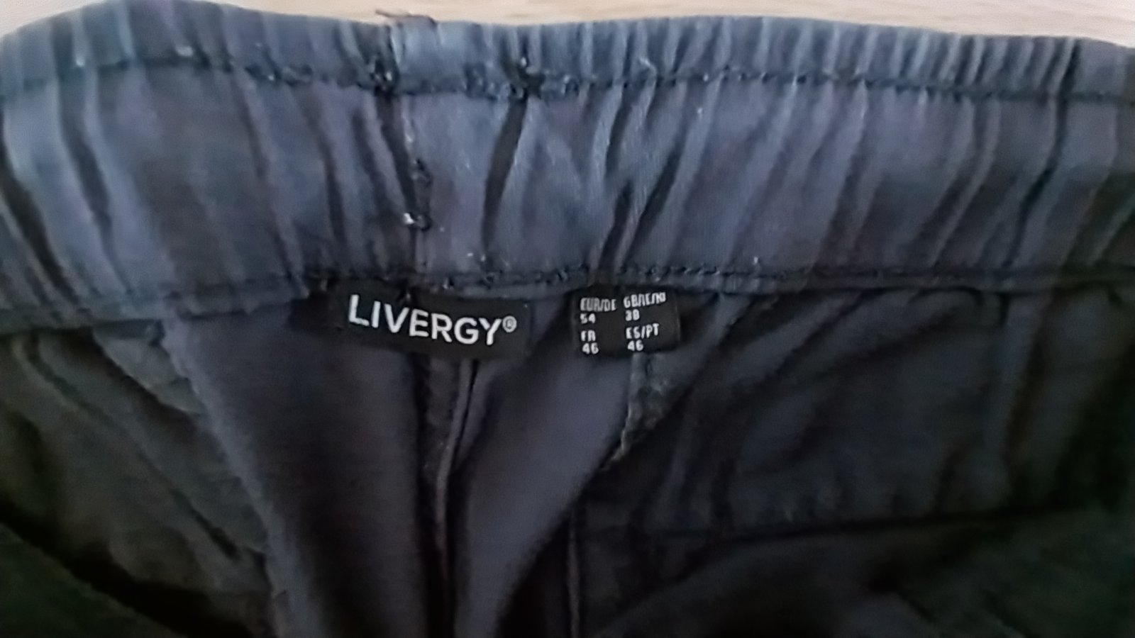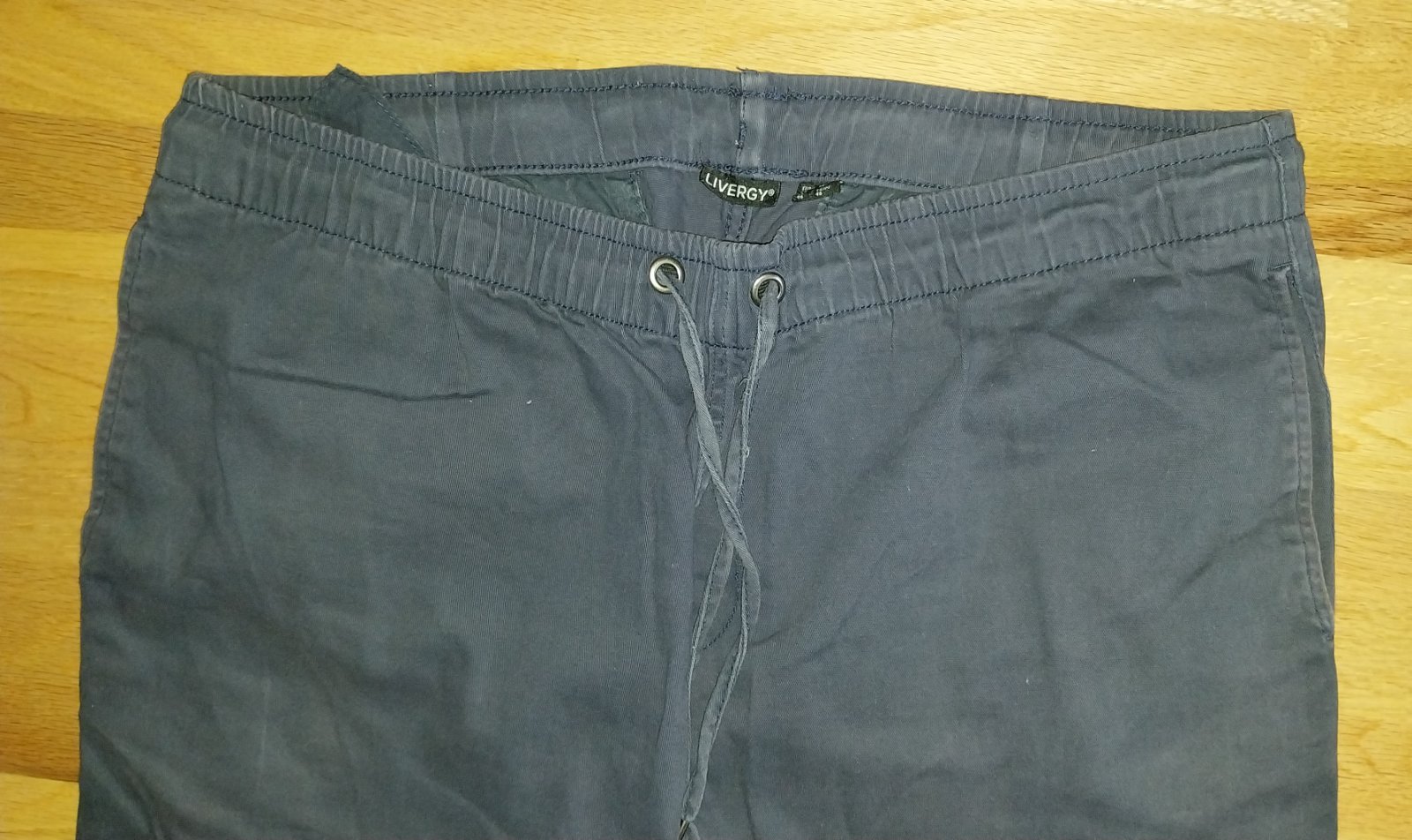 Modré bavlnené nohavice zn. Livergy. Nosené, v dobrom stave, akurát trošku vyšúchané v rozkroku - nie deravé, ani preslabená tkanina, len trošku ošúchané. V páse guma + šnúrka. Farba je taká "montérková" modrá. Veľkosť 54. Zodpovedá veľ. XL. Odporúčam premerať.