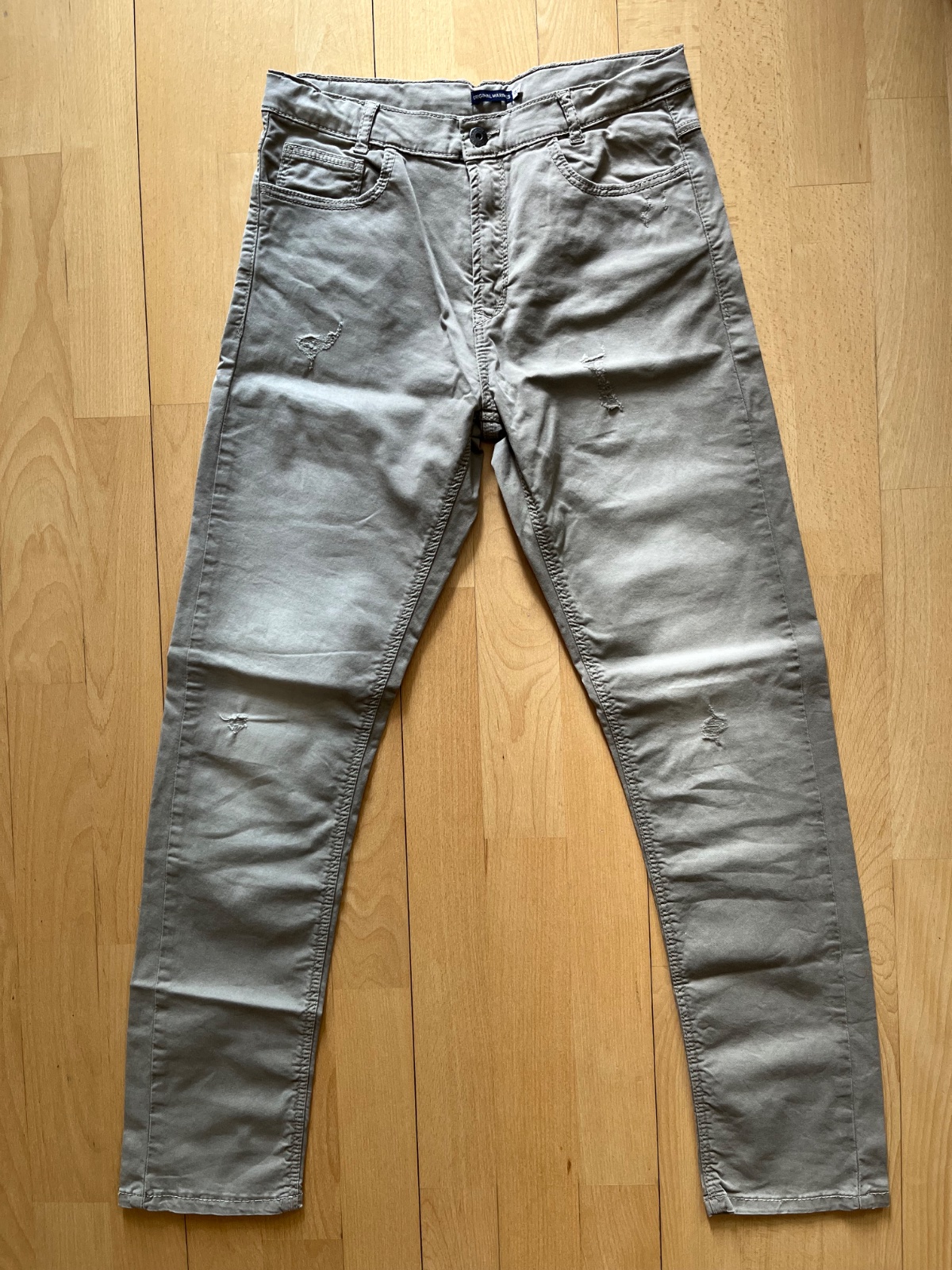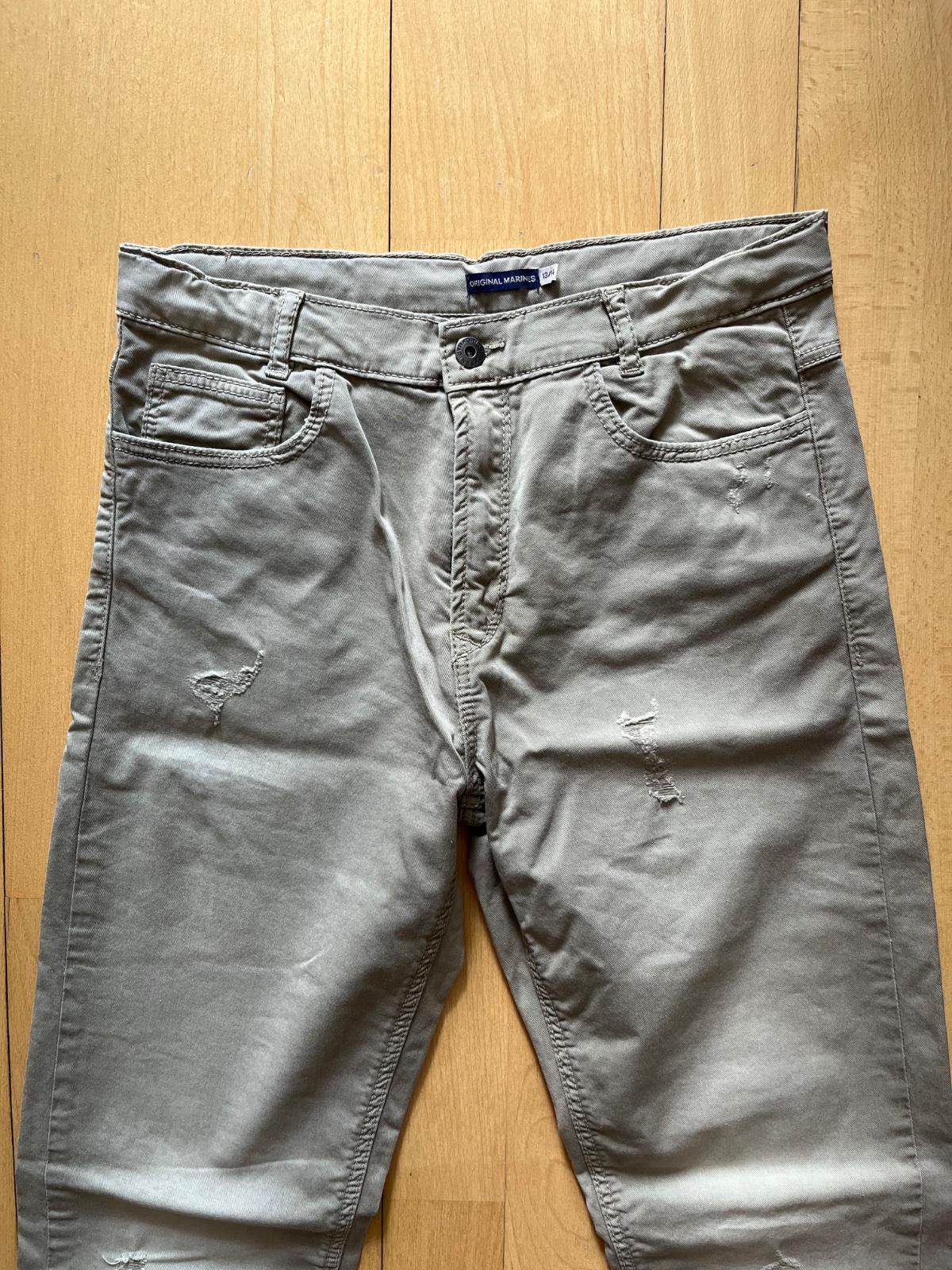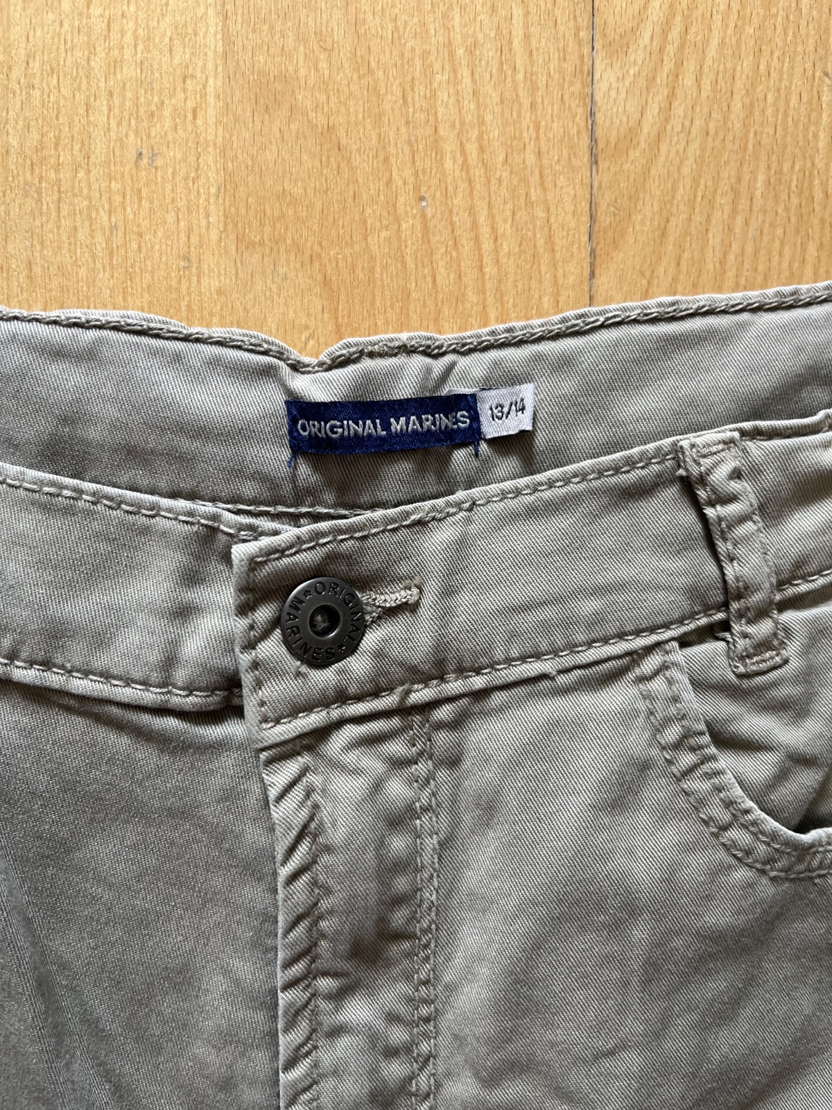 Predam nenosene (len 1x vyprate po zakupeni) bavlnene nohavice Original Marines, velkost 13/14 - zodpovedaju skor na 12-13, vhodne na stihlu postavu, v spodnej casti uzke. Efekt vypraných rifli, s akoby zatrhnutymi miestami. Vyzeraju ako rifle, ale su to cisto bavlene nohavice, vhodne od jari do jesene, su velmi pekne. V pase okrem klasiky zipsu a gombika aj zvnutra stahovacia nastavovacia gumicka ako klasika na detských nohaviciach. Bocna dlzka od pasa 97 cm, sirka v pase 36 cm. BA - Ruzinov.