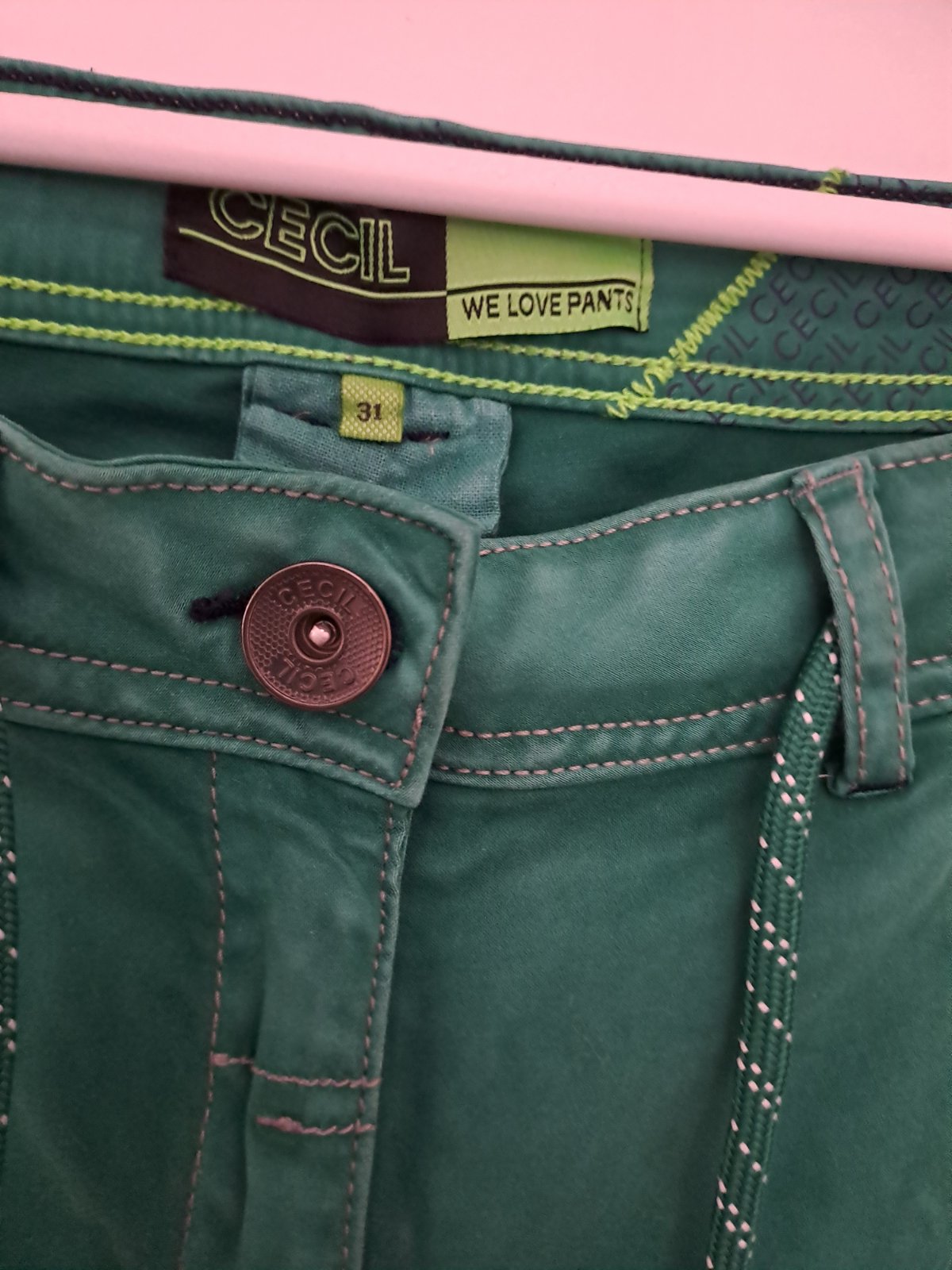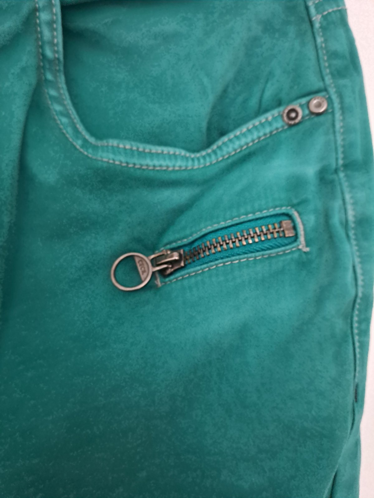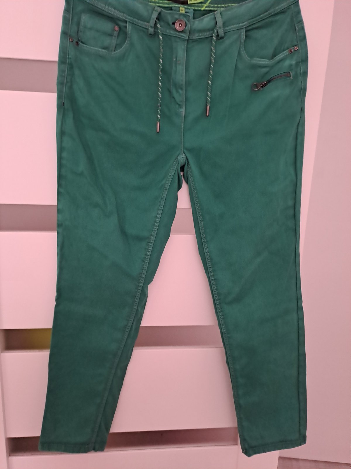 Kvalitné tmavozelené strečové nohavice, zapínanie na zips a gombík, materiál pás 46-49 cm boky 55-60 cm dĺžka 101 cm dp 11