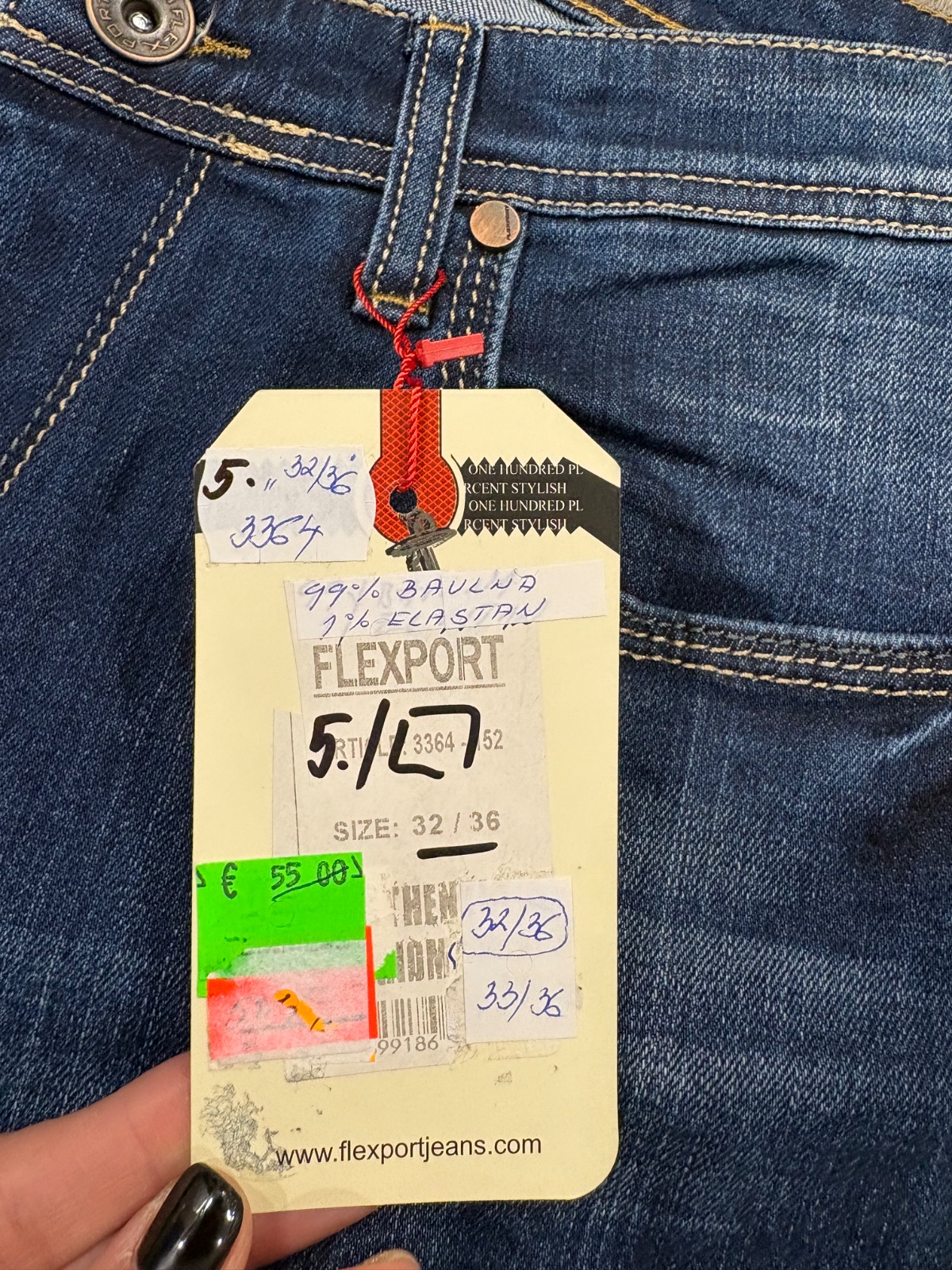 Flexport nove panske riflove nohavice,komplet s etiketou,PC 55 eur, material bavlna a elastan.velkost W32 L 36,dlzka je 115cm, sirka v pase je cca od 41x2cm do 43x2cm,predny sed je 26cm a zadny je 34cm,sirka stehna pod rozkrokom je od 29x2cm do 31x2cm,sirka dole je 18x2cm