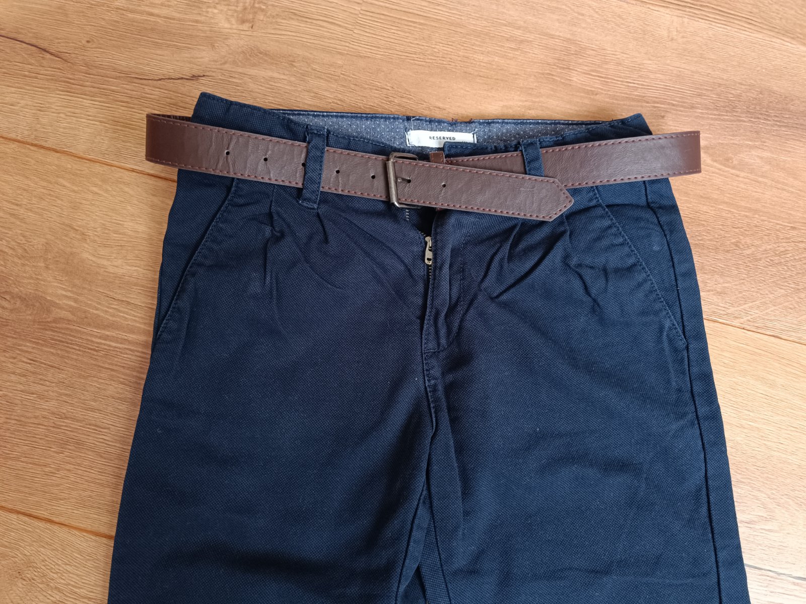 Nohavice maju kozeny hnedy opasok.