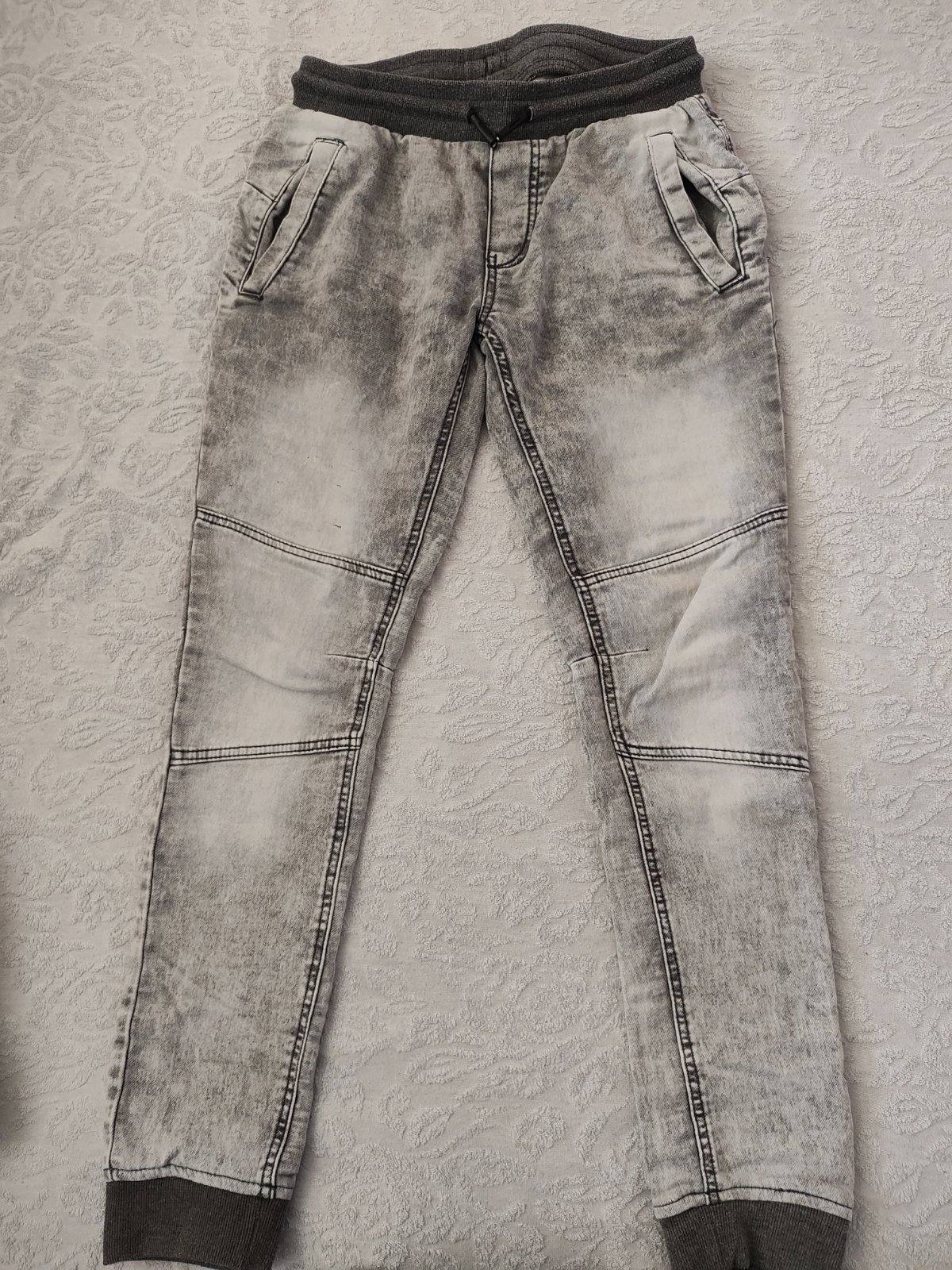 Predám svetlo šedé rifle veľ. 164. Rifle sú nosene ale bez poškodenia. Na jednej nohe malé čiarky ale sú tam od výroby. Cena 8 eur