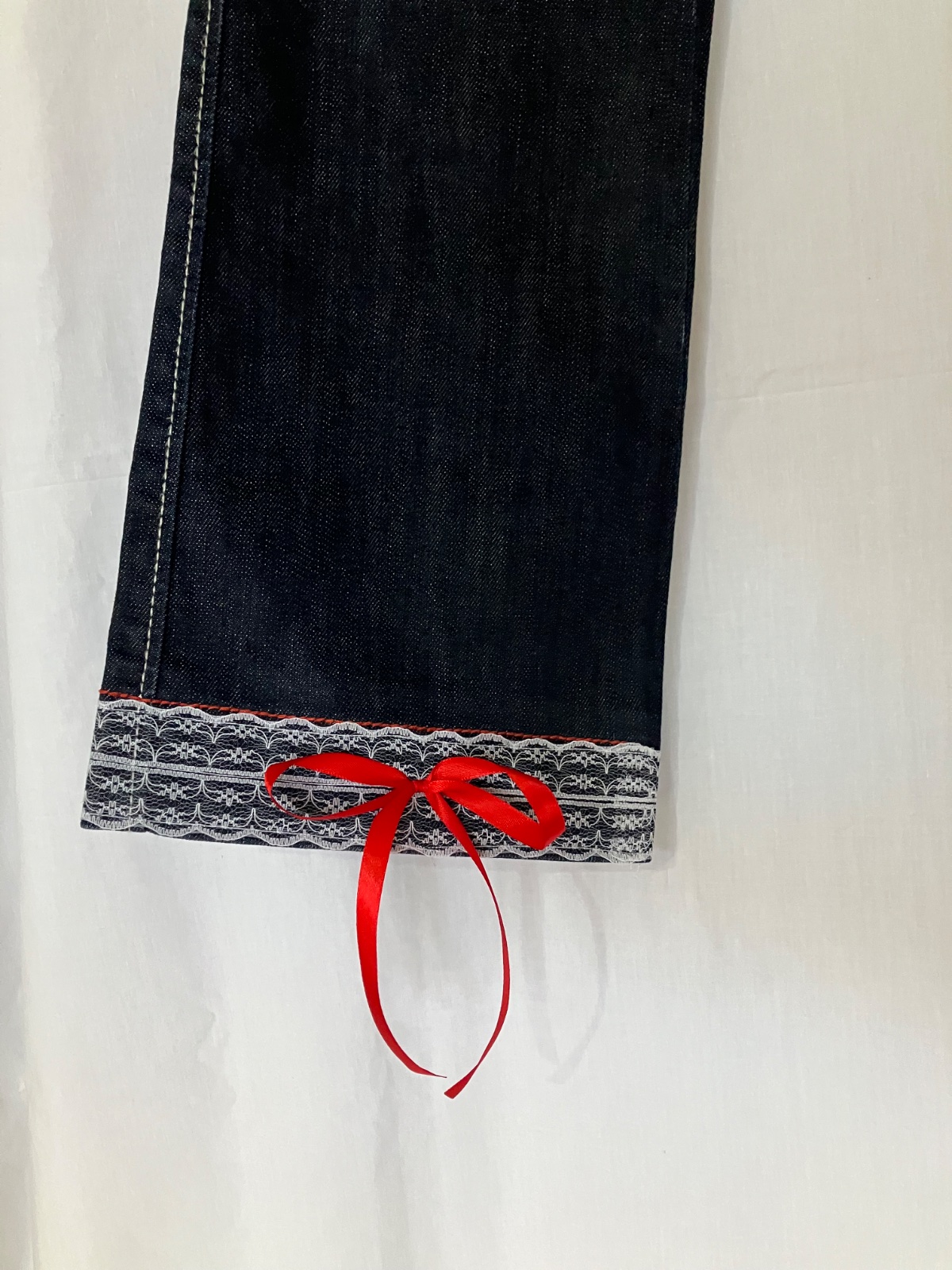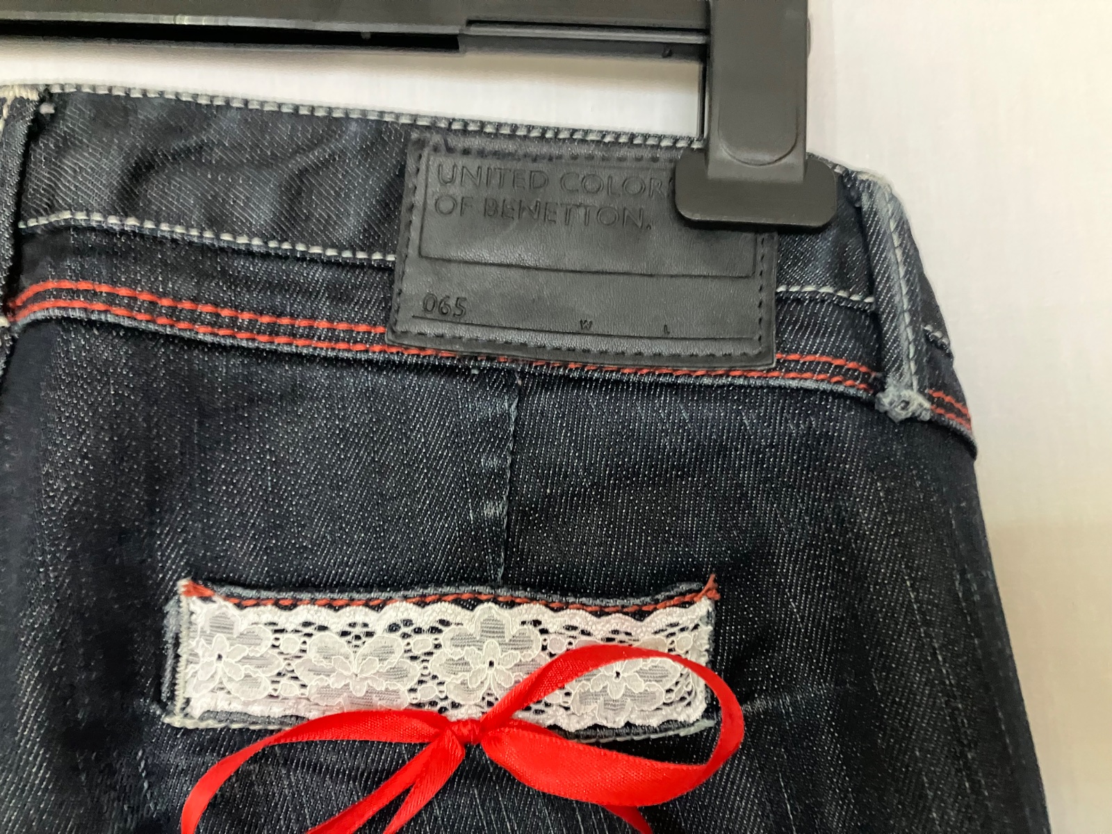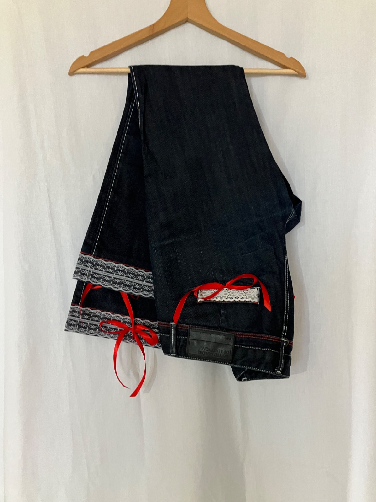 Ak hľadáš rifle, ktoré nikto iný nemá, práve si ich našla. Tieto tmavomodré zvonové rifle United Colors of Benetton som vlastnoručne upcyklovala do jemného, romantického coquette / lolita / Lana Del Rey aesthetic – presne ten typ kúsku, ktorý na Vintede okamžite zaujme scrollujúce oči 💌