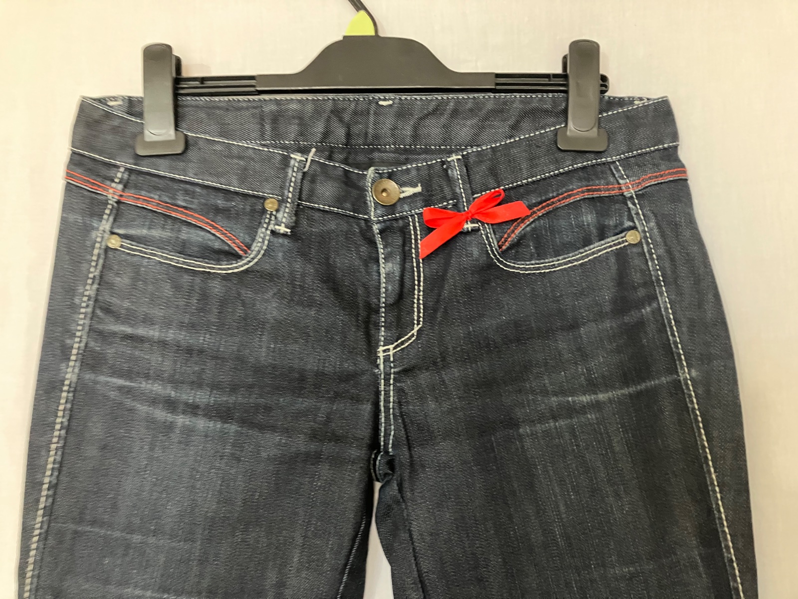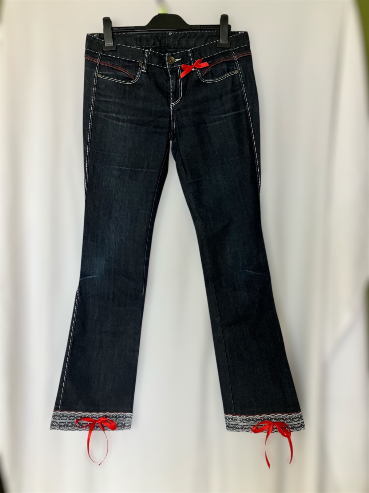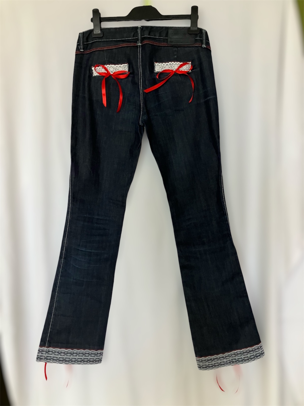 Ak hľadáš rifle, ktoré nikto iný nemá, práve si ich našla. Tieto tmavomodré zvonové rifle United Colors of Benetton som vlastnoručne upcyklovala do jemného, romantického coquette / lolita / Lana Del Rey aesthetic – presne ten typ kúsku, ktorý na Vintede okamžite zaujme scrollujúce oči 💌