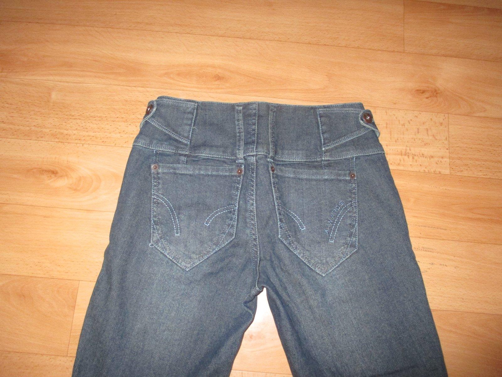 Svetlomodré s nízkym pásom boli nosené častejšie sú veľkosť XS, ostatné sú všetky s/36 Modré s vysokým pásom na gombíky potrebujú vymeniť zips ale tým, že je taký maličký možno ho tam ani netreba, ...