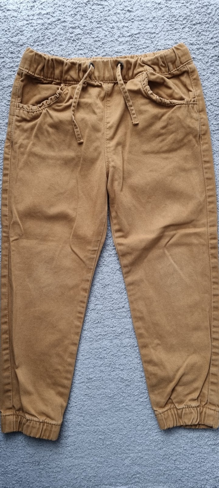 Horčicove nohavice Next s opaskom. Možnosť regulovať v páse. Celková dĺžka je 54 cm, šírka v páse je 24cm. Skombinujte s tmavozelenou huňatou vestičkou, nájdete v mojom bazari.