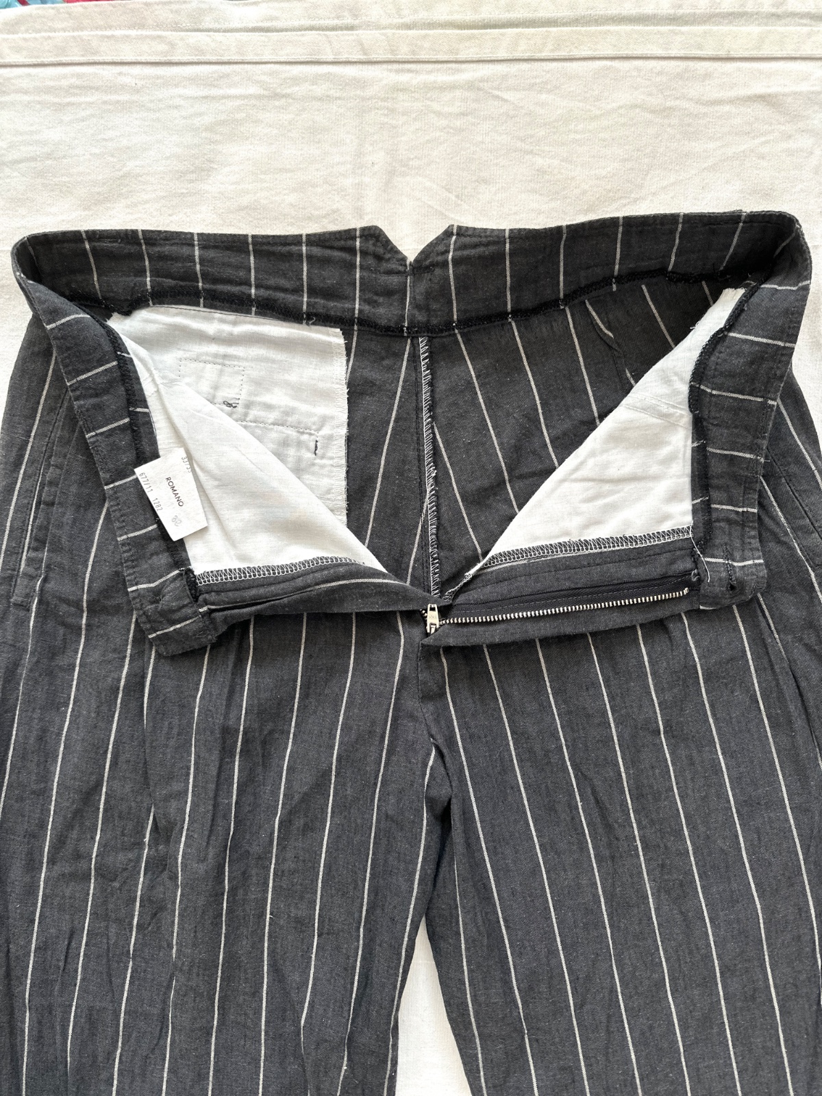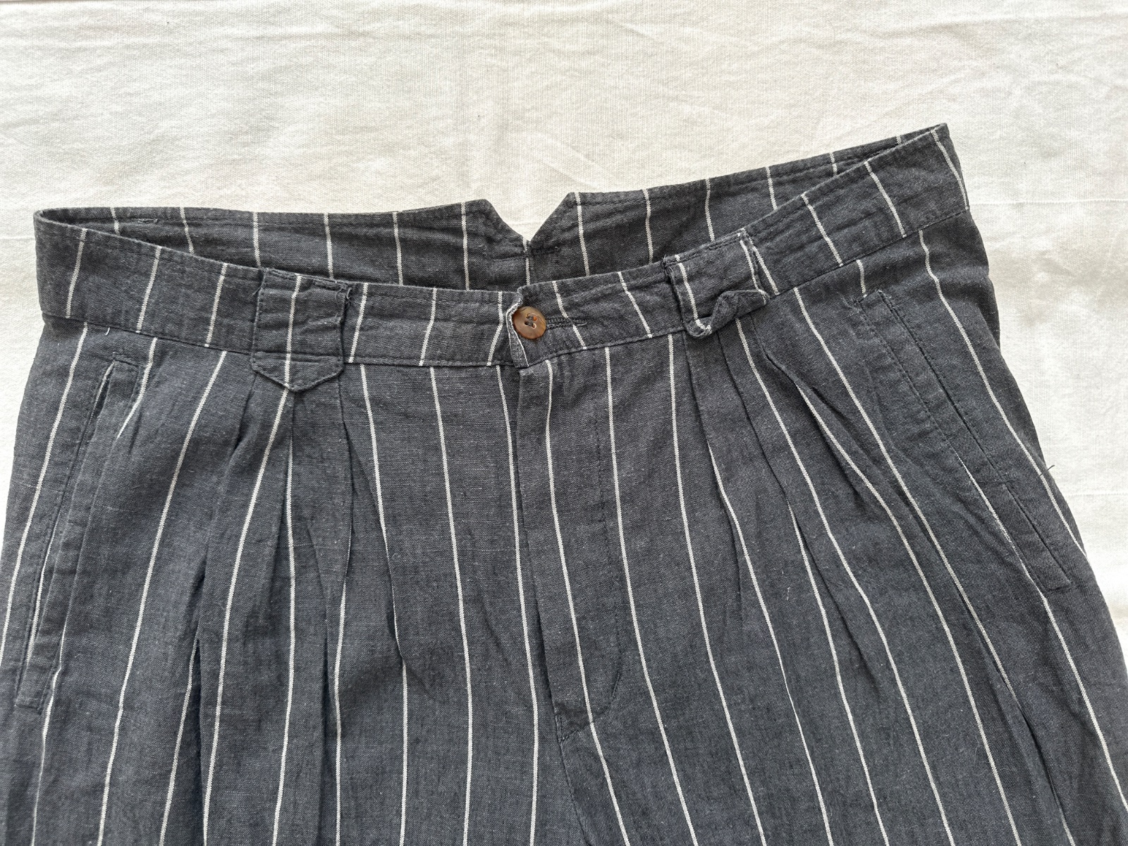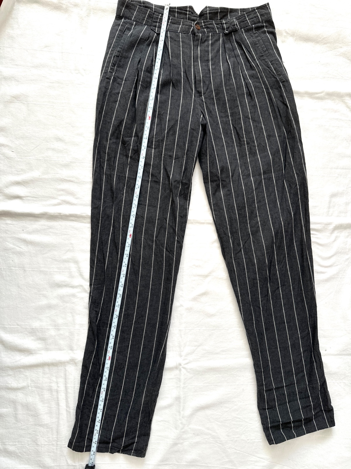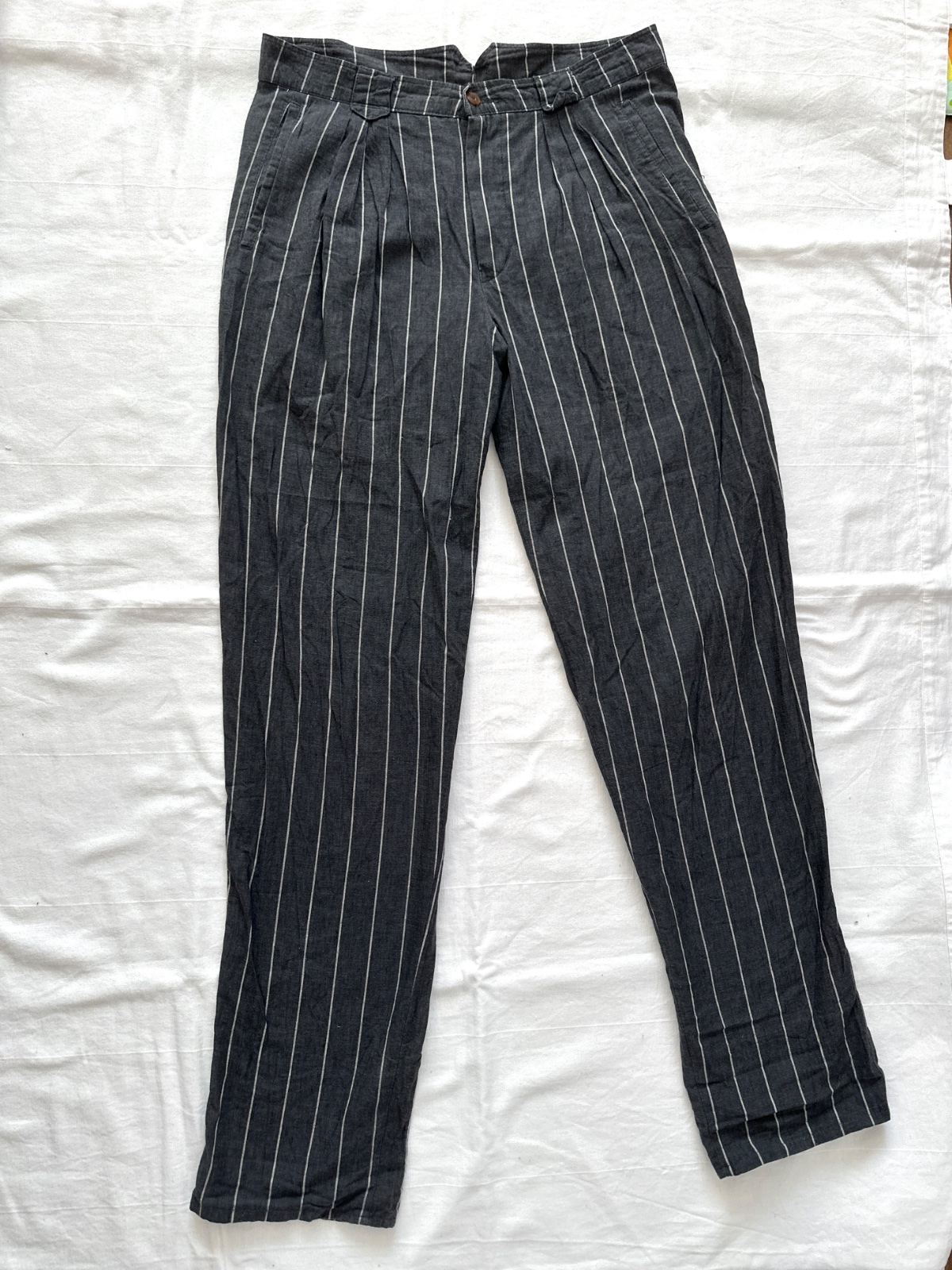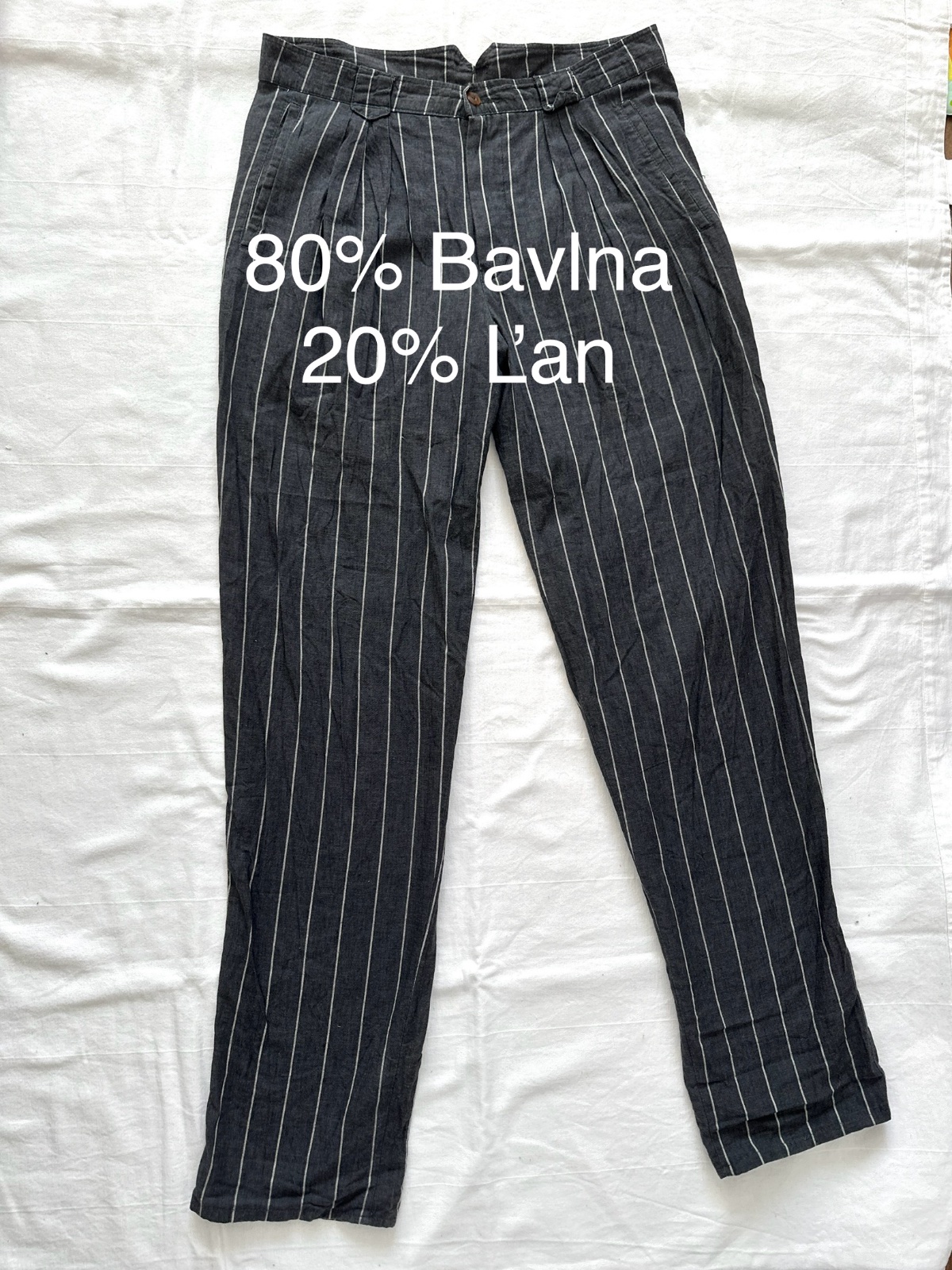 Vintage ľanové nohavice v krásnej tmavosivej farbe s jemnými bielymi zvislými pásikmi. Nohavice majú vysoký pás. Zapínajú sa na zips a gombík. Vpredu majú jemné riasenie a miesto na opasok. Nohavice majú vzadu veľmi zaujímavý pás. Zloženie je 80% bavlna a 20% ľan. Sú veľmi dobre vyrobené s dôrazom na detail. Ide o veľmi kvalitné vintage nohavice nemeckej výroby Hausser, model Romano. Vyzerajú skvele s mokasínami alebo teniskami. Veľkosť by som opísala ako L, všetky rozmery sú na fotkách.