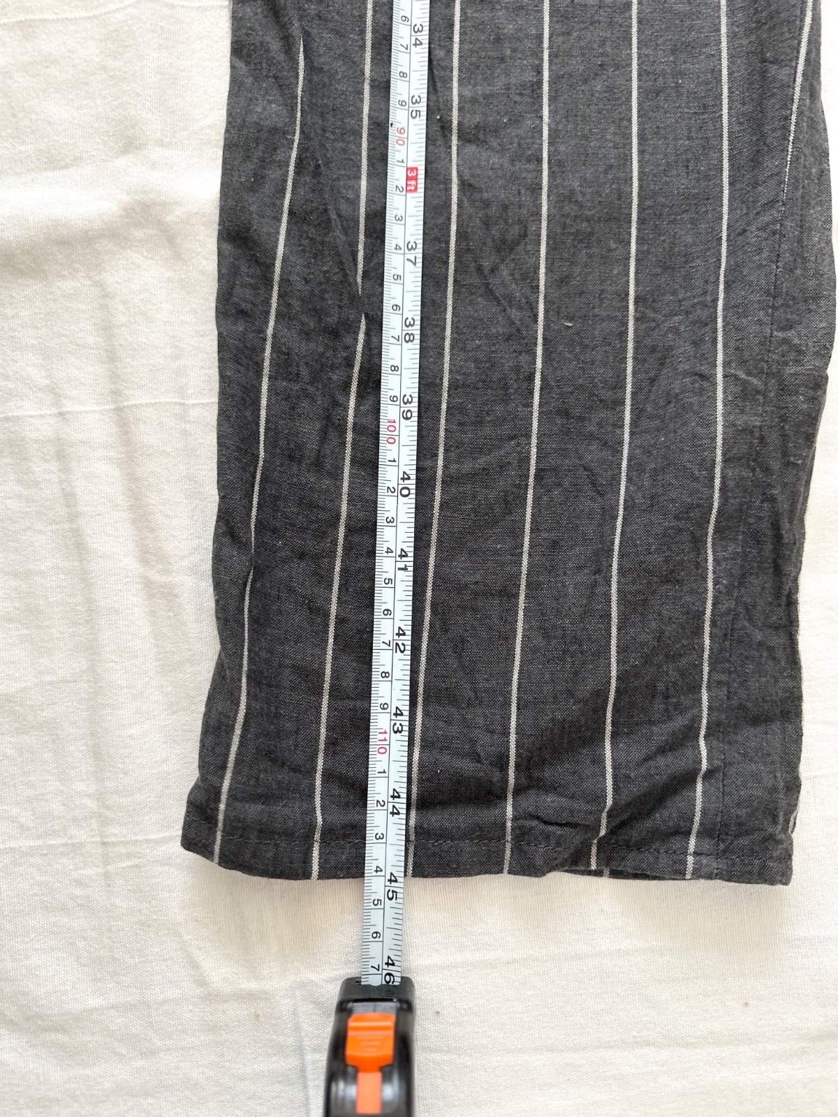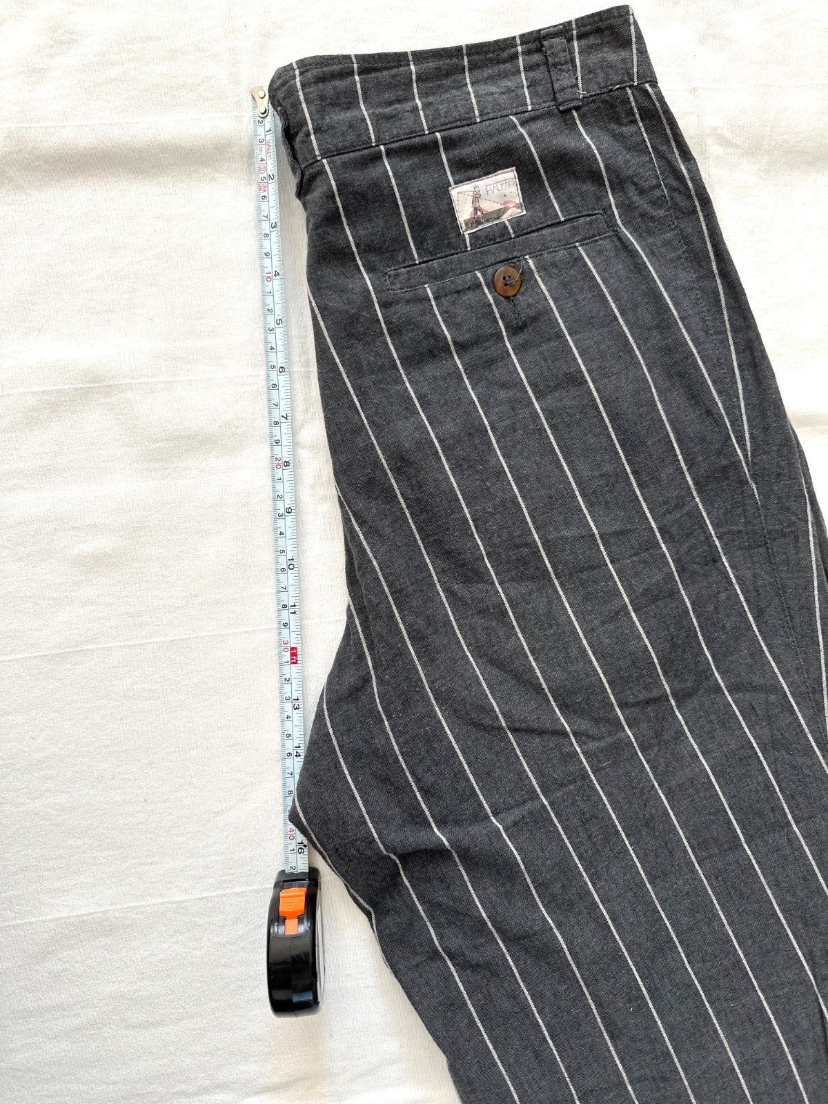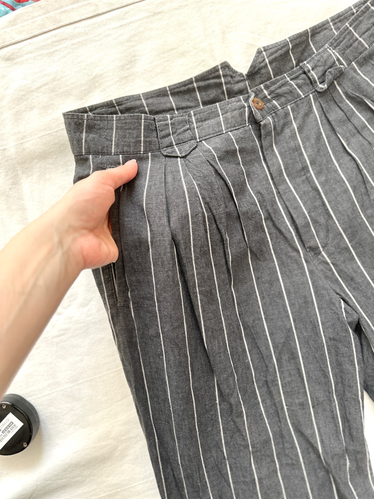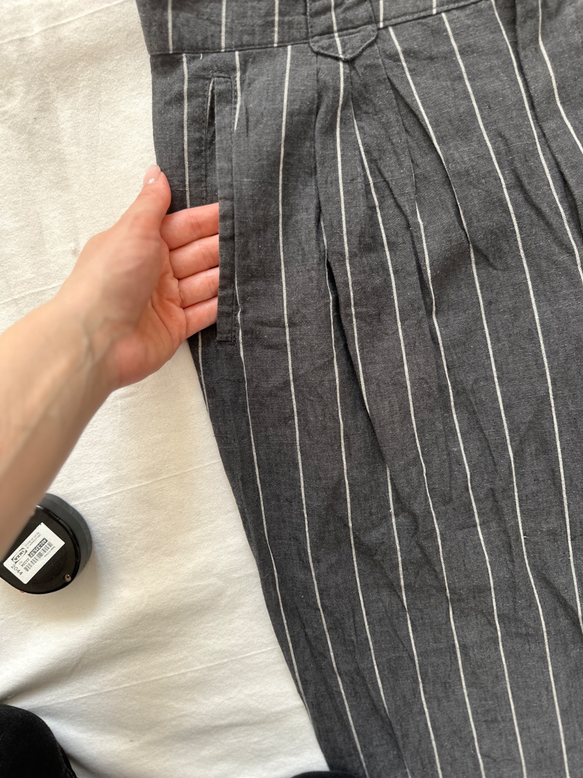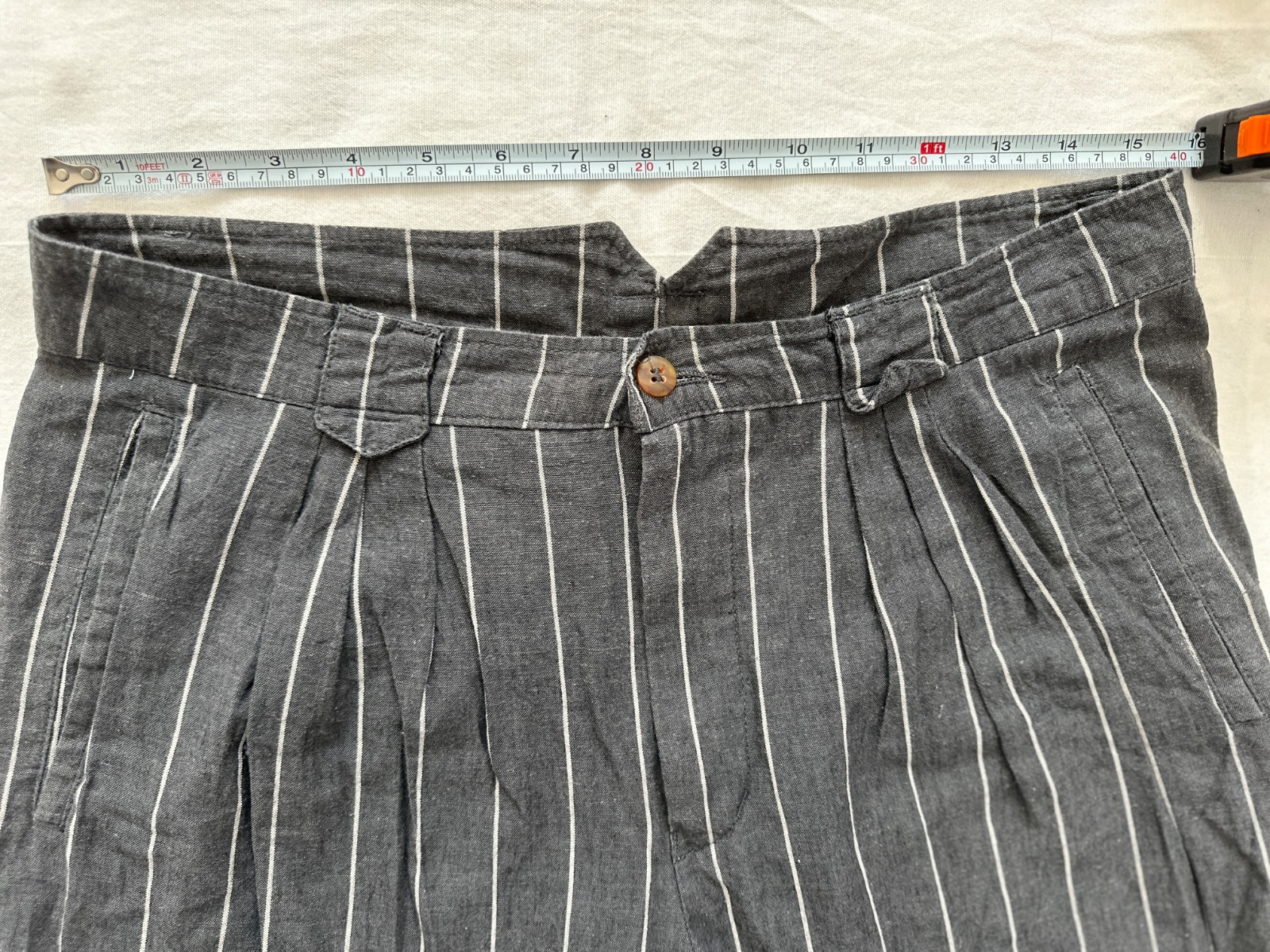 Vintage ľanové nohavice v krásnej tmavosivej farbe s jemnými bielymi zvislými pásikmi. Nohavice majú vysoký pás. Zapínajú sa na zips a gombík. Vpredu majú jemné riasenie a miesto na opasok. Nohavice majú vzadu veľmi zaujímavý pás. Zloženie je 80% bavlna a 20% ľan. Sú veľmi dobre vyrobené s dôrazom na detail. Ide o veľmi kvalitné vintage nohavice nemeckej výroby Hausser, model Romano. Vyzerajú skvele s mokasínami alebo teniskami. Veľkosť by som opísala ako L, všetky rozmery sú na fotkách.