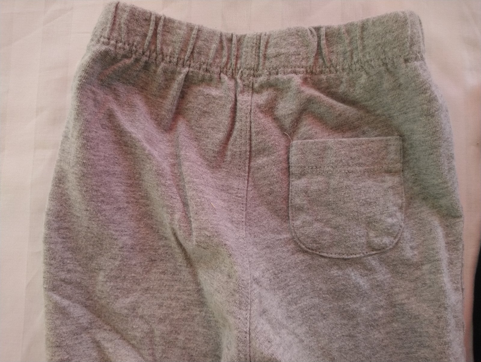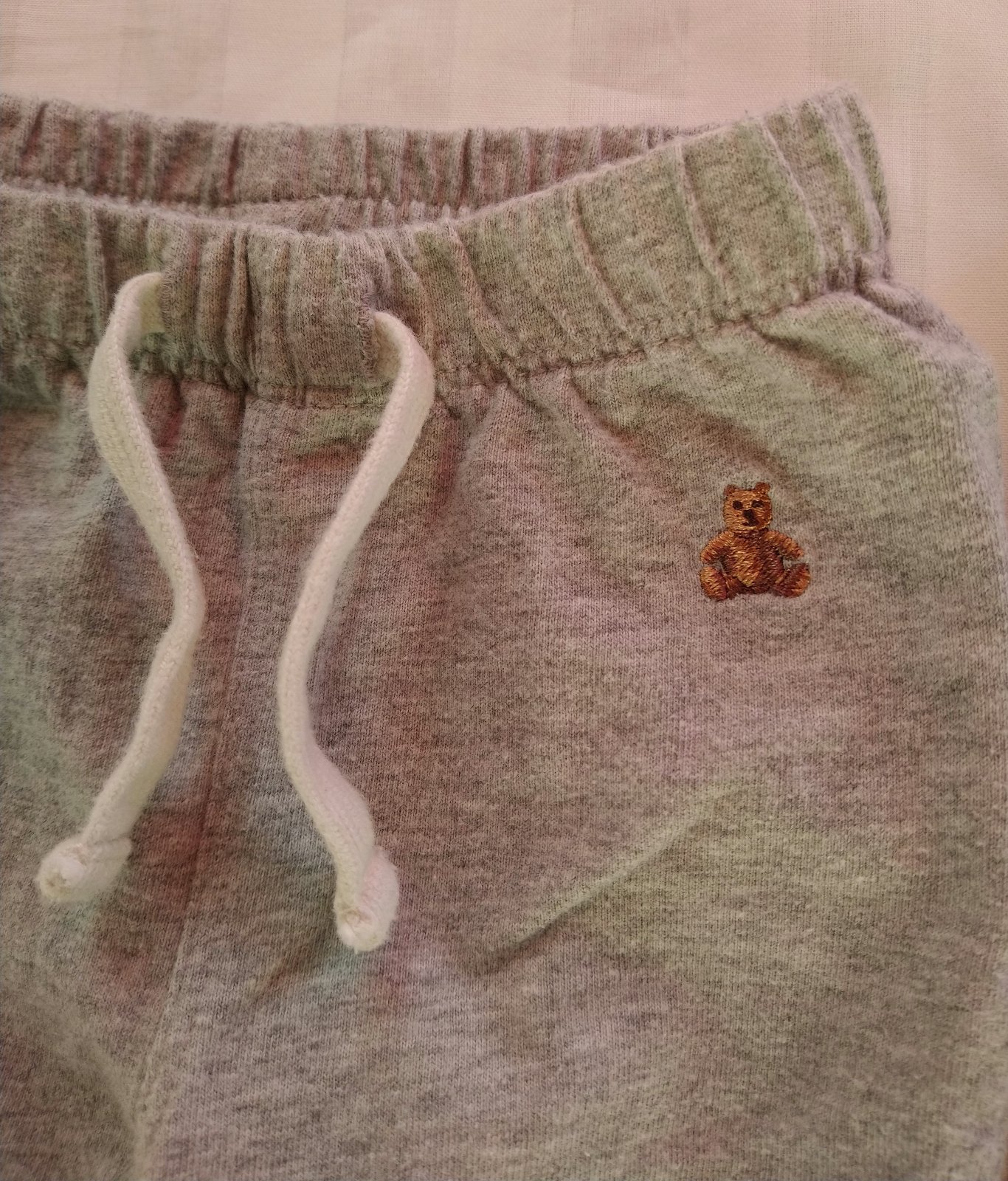 2 ks detských tenkých tepláčikovy, sivé a modré, v páse na gumu + ozdobná šnúrka, dole gumička, maličký motív,