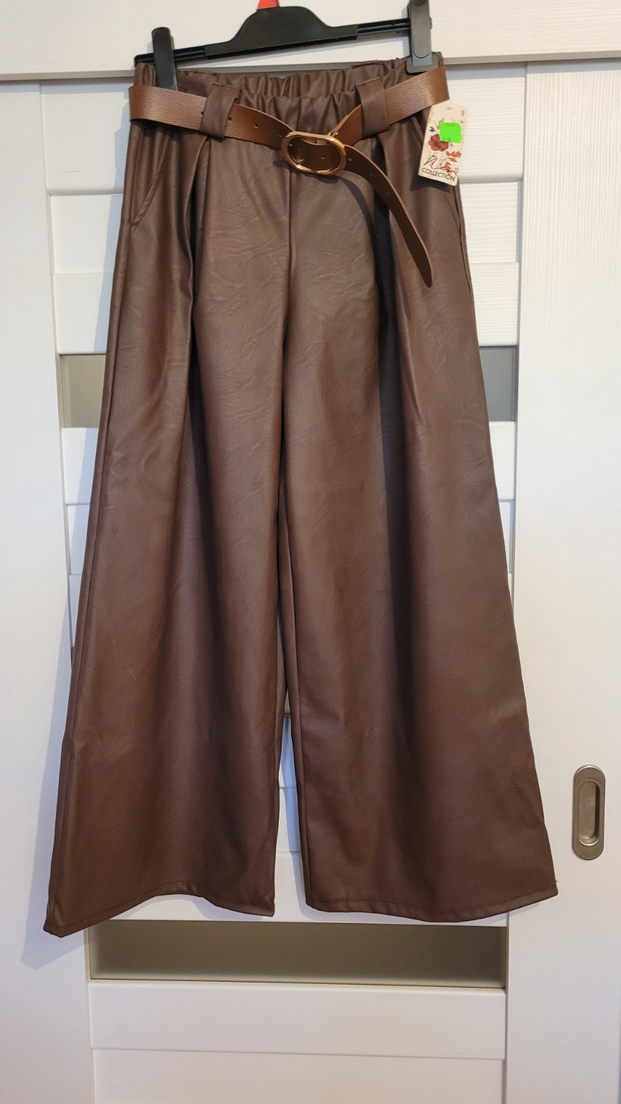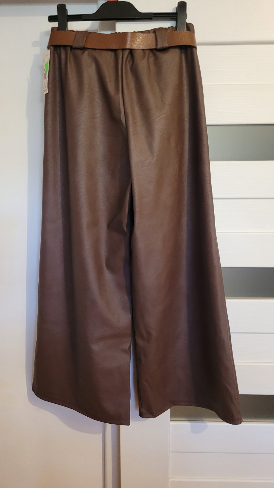 Materiál je mäkká prijemná, koženka, v páse gumička, majú vrecká, opasok je súčasťou. Rozmery: pás na voľno 70 cm, po natiahnutí 86 cm, dĺžka 99 cm.