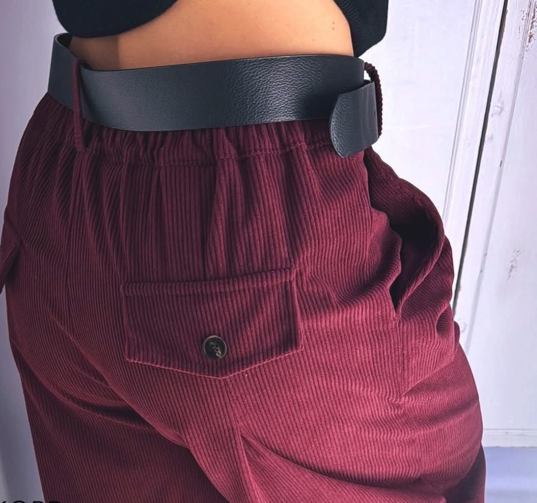 Moderné burgundy kordové nohavice v širokom strihu.sedia od S po L.vzadu majú gumicku,vpredu gombík a zips,opasok.v predu 2 funkčné vačky,vzadu dva ozdobné.