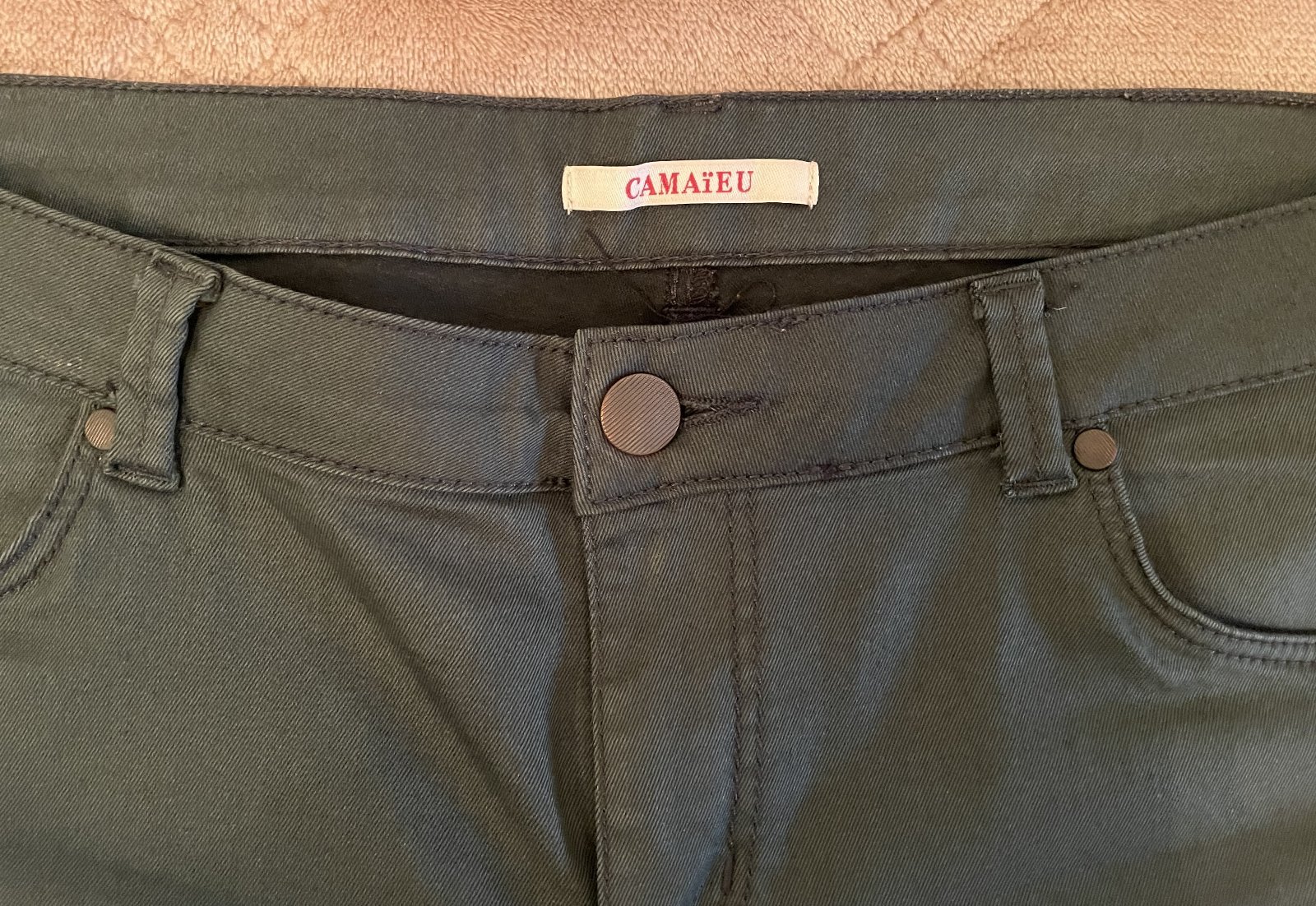 Dámske tmavozelené nohavice značky Camaieu. Uvedená veľkosť 44. Rozmery: v páse 2x44 cm, dĺžka 103 cm.